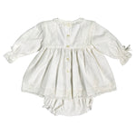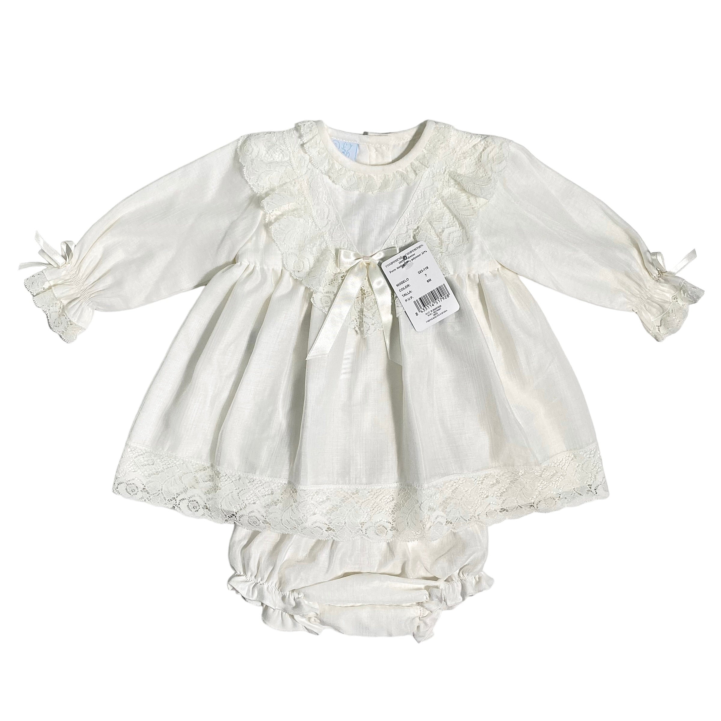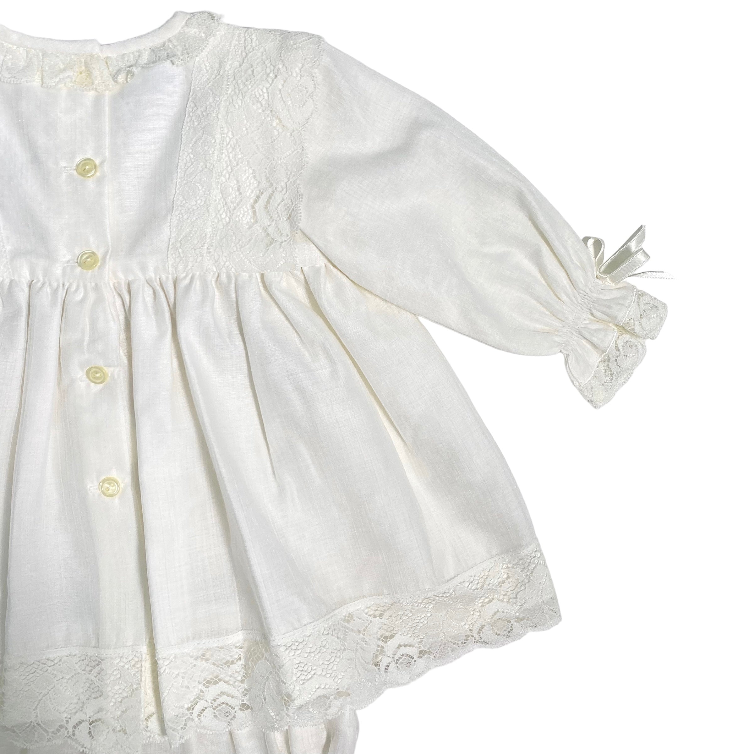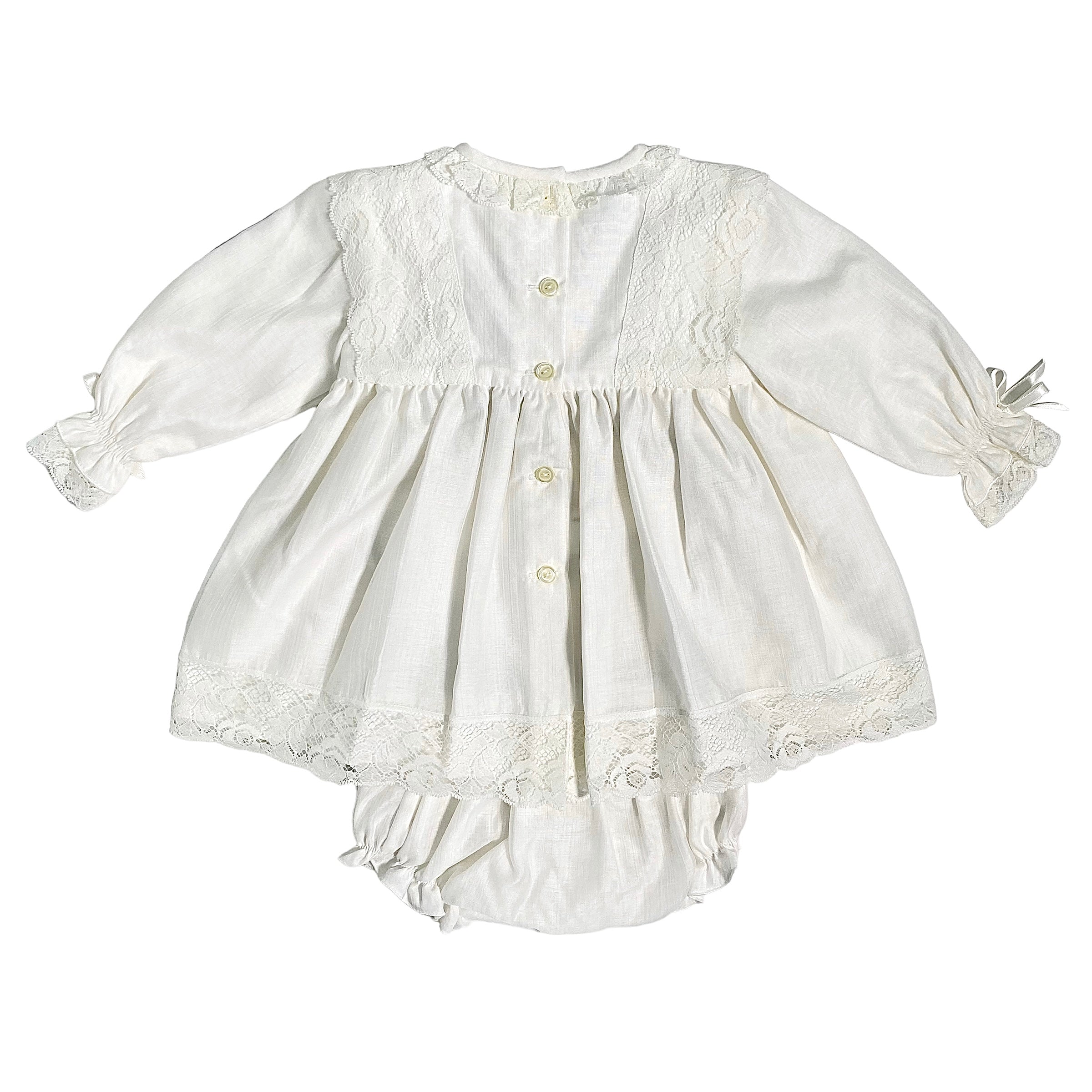 Langärmliges formelles Kleid (innen gefüttert) mit Hosenrock, am Oberteil, am Rundhalsausschnitt, an den Manschetten und an der Unterseite des Kleides mit Valenciennes-Spitze versehen.