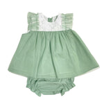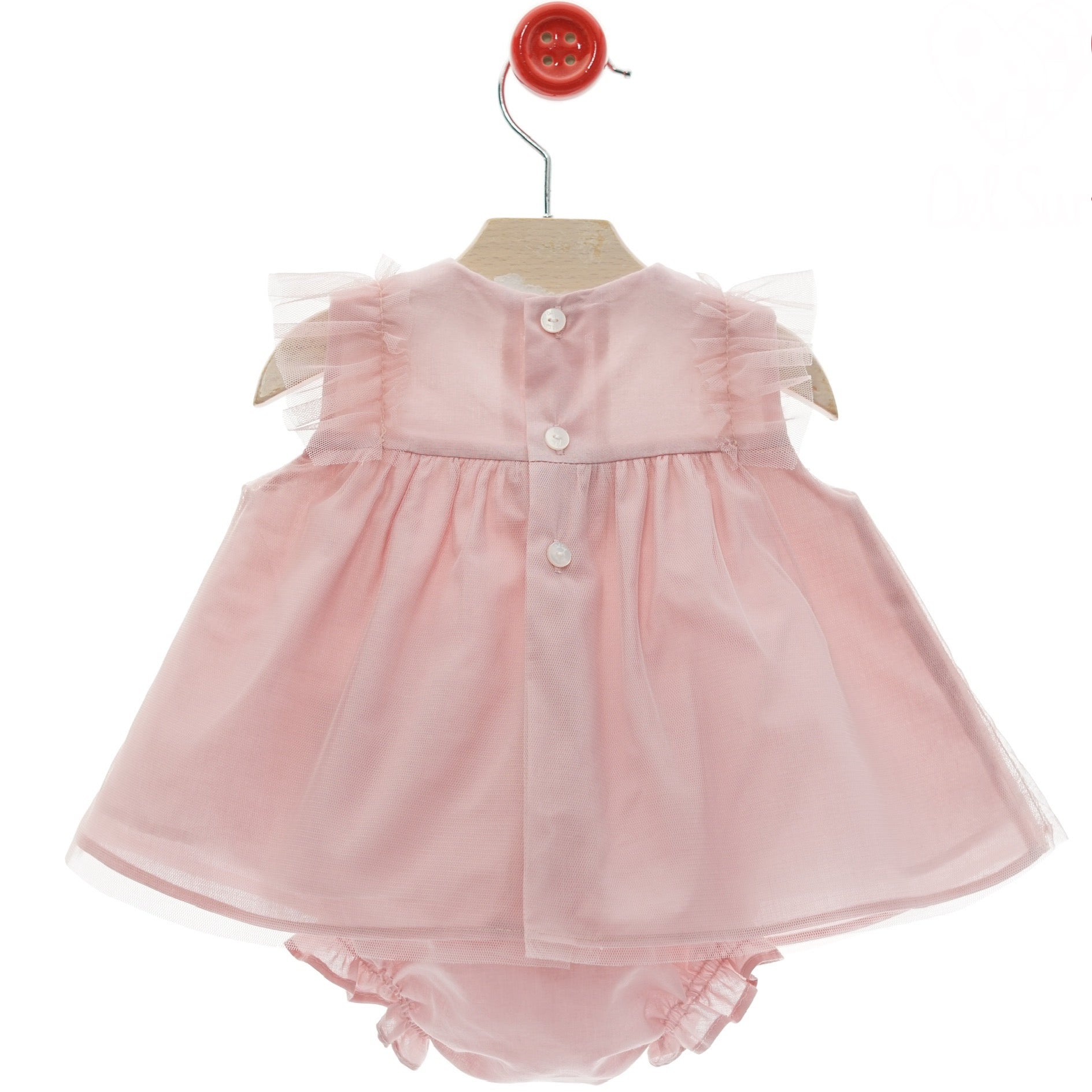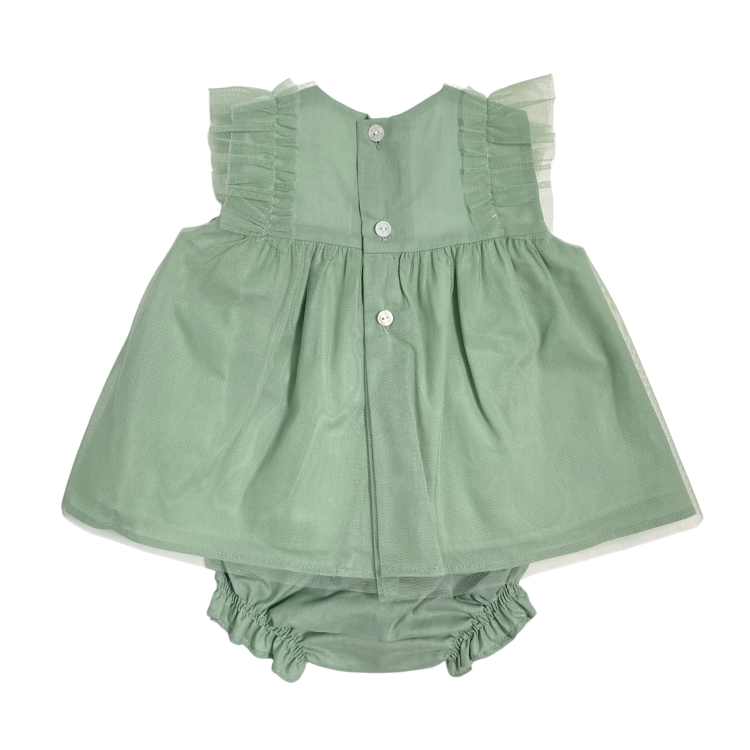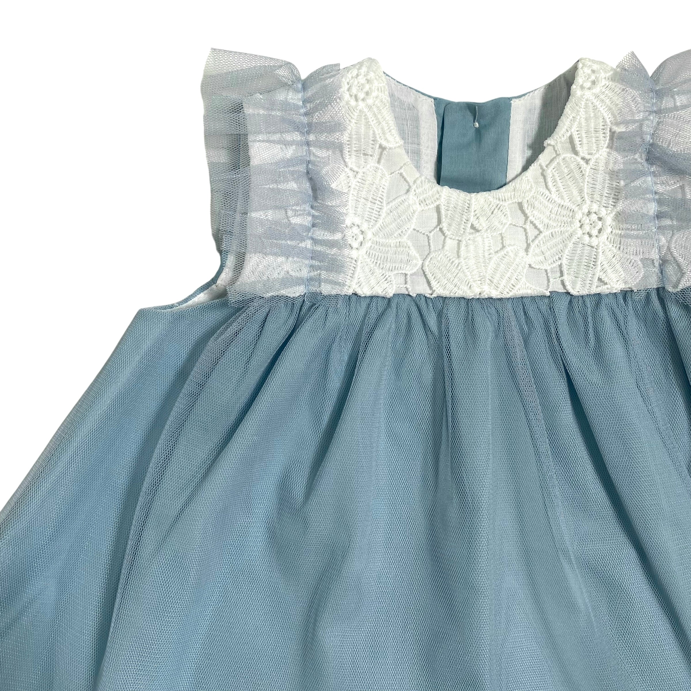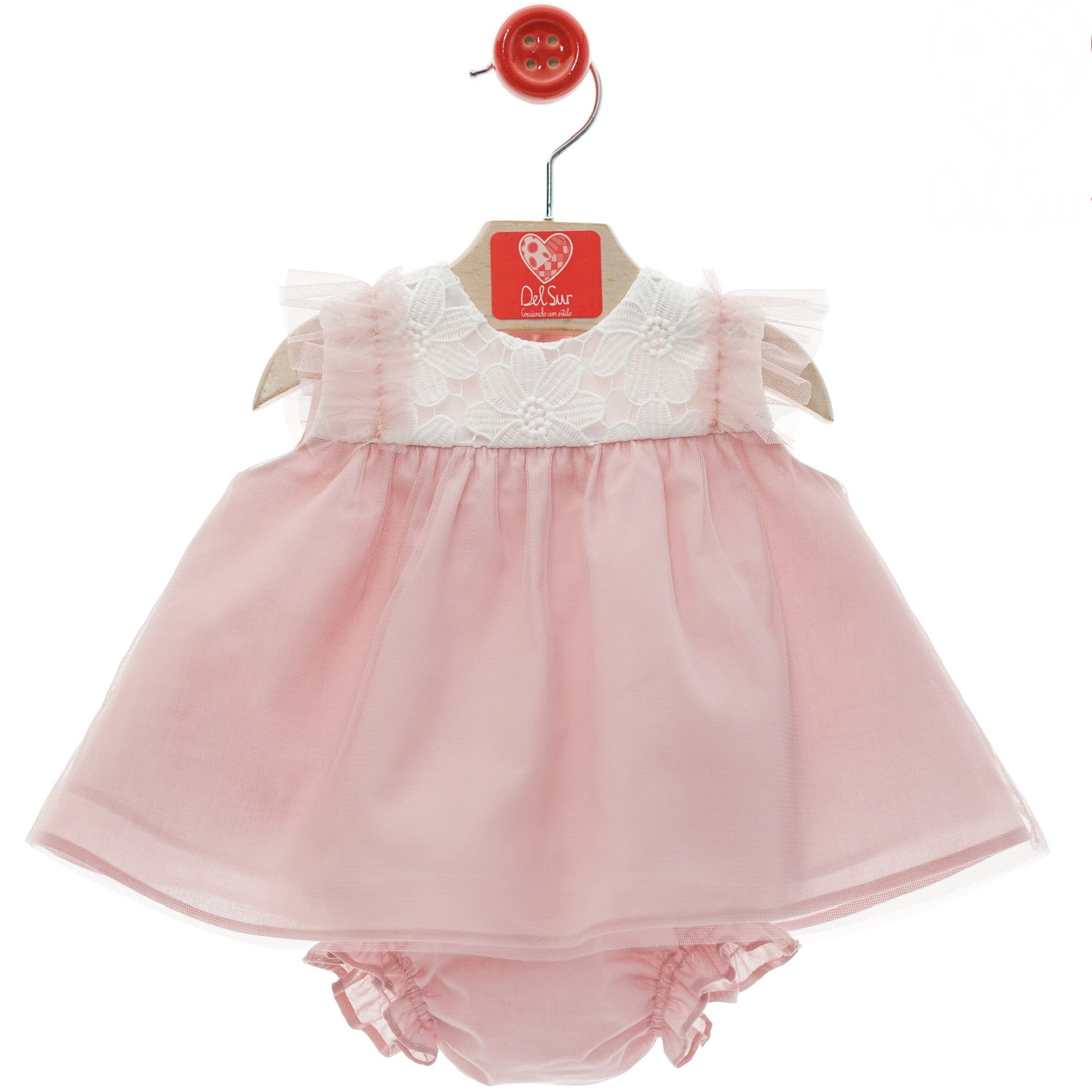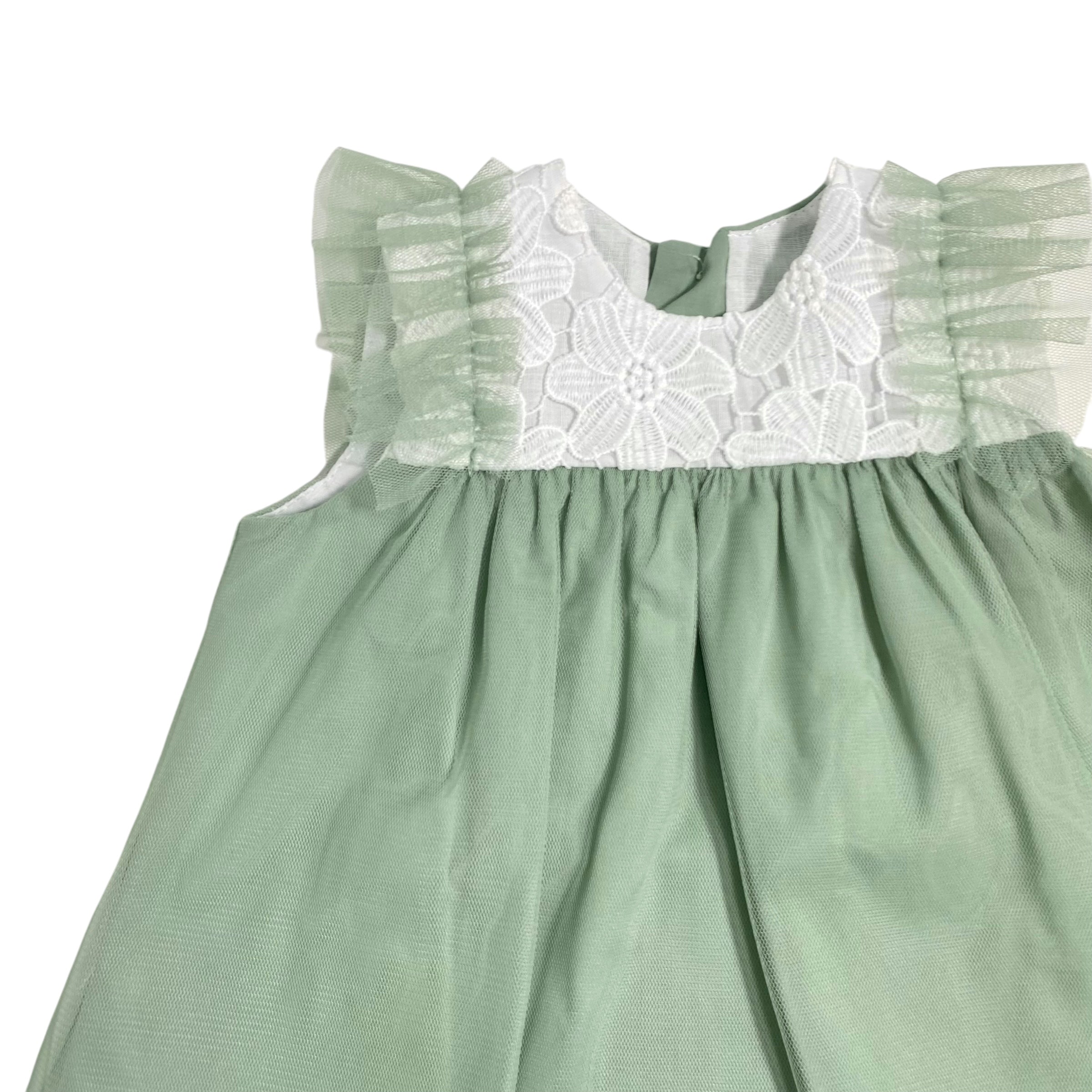 Questo abito corto smanicato in tulle neonata DEL SUR è perfetto per ogni occasione speciale. Con un elegante pizzo sul petto e delle rouches sulle spalle, è alla moda e casual allo stesso tempo. Inoltre, viene abbinato alle culotte per un look completo.