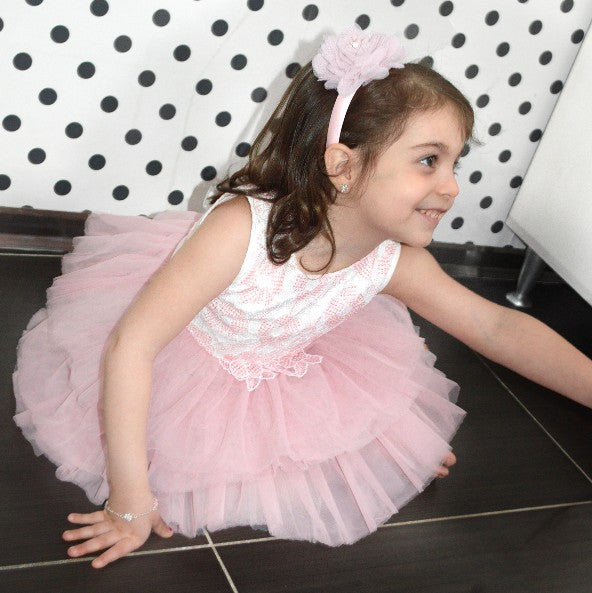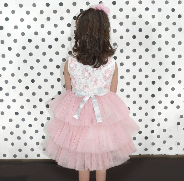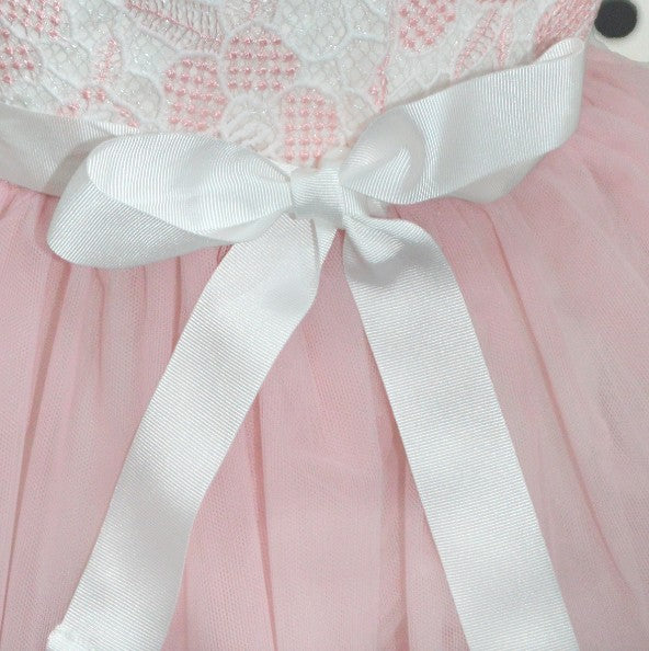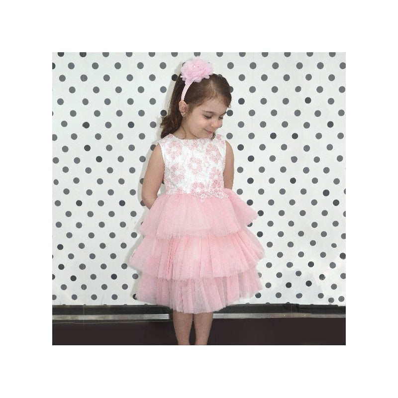 -Sleeveless dress with embroidered bodice and skirt with three tulle flounces