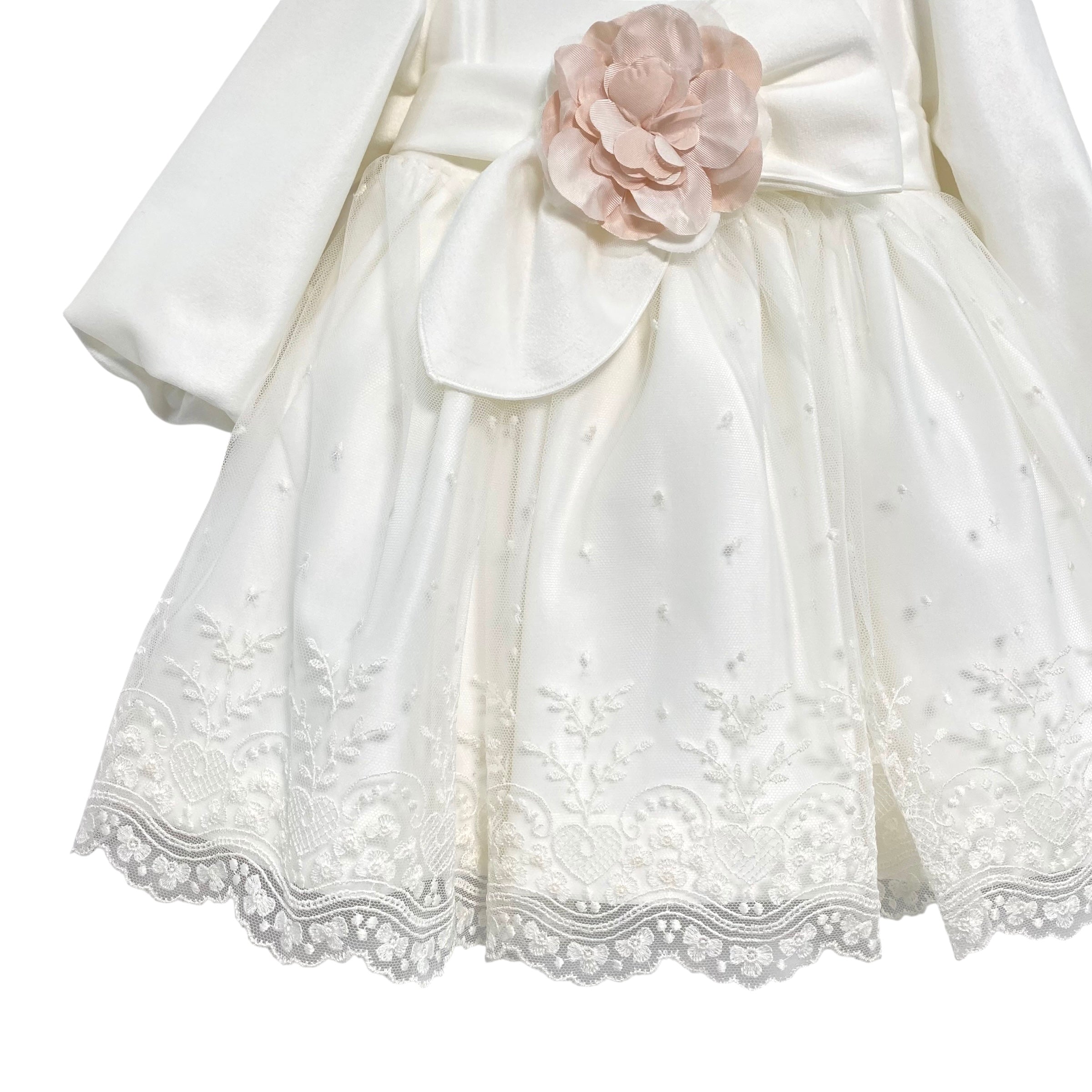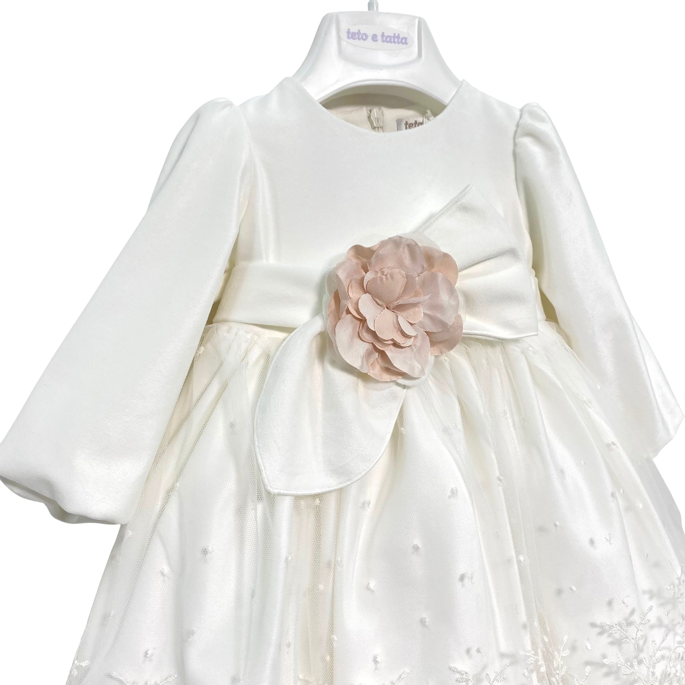 Questo abito elegante battesimale per neonata combina velluto pregiato e un raffinato strato di pizzo, garantendo un look delicato e sofisticato. La fascia in vita con dettagli floreali aggiunge un tocco di charme, mentre la chiusura posteriore con zip invisibile assicura una vestibilità comoda e pulita. Perfetto per un’occasione speciale, offre comfort e stile senza compromessi.