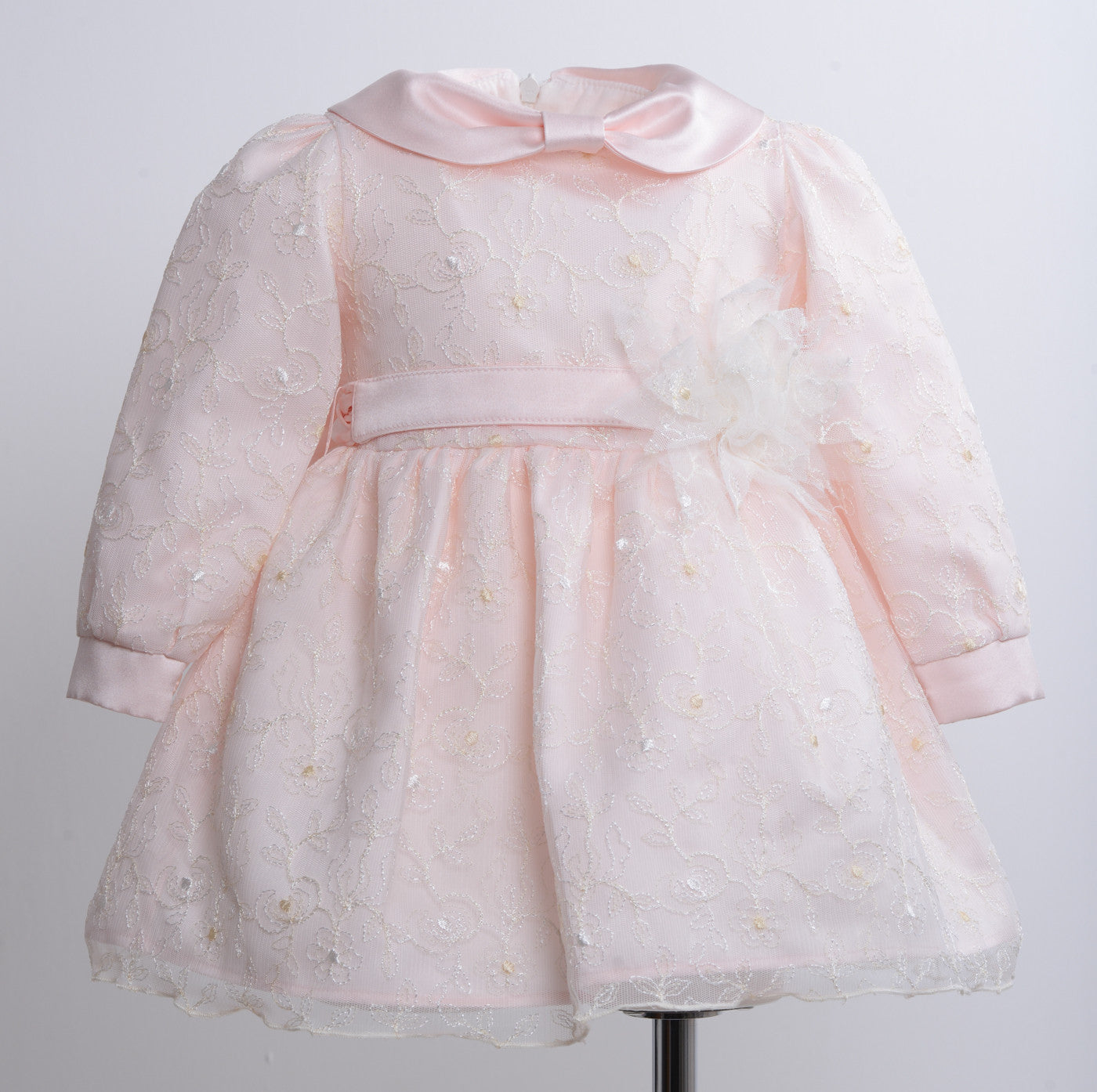 Long-sleeved cocktail dress with cuff, round collar with bow, waist belt with tulle flower and bow on the back and tulle skirt with embroidery. zipper on the back for opening and closing.