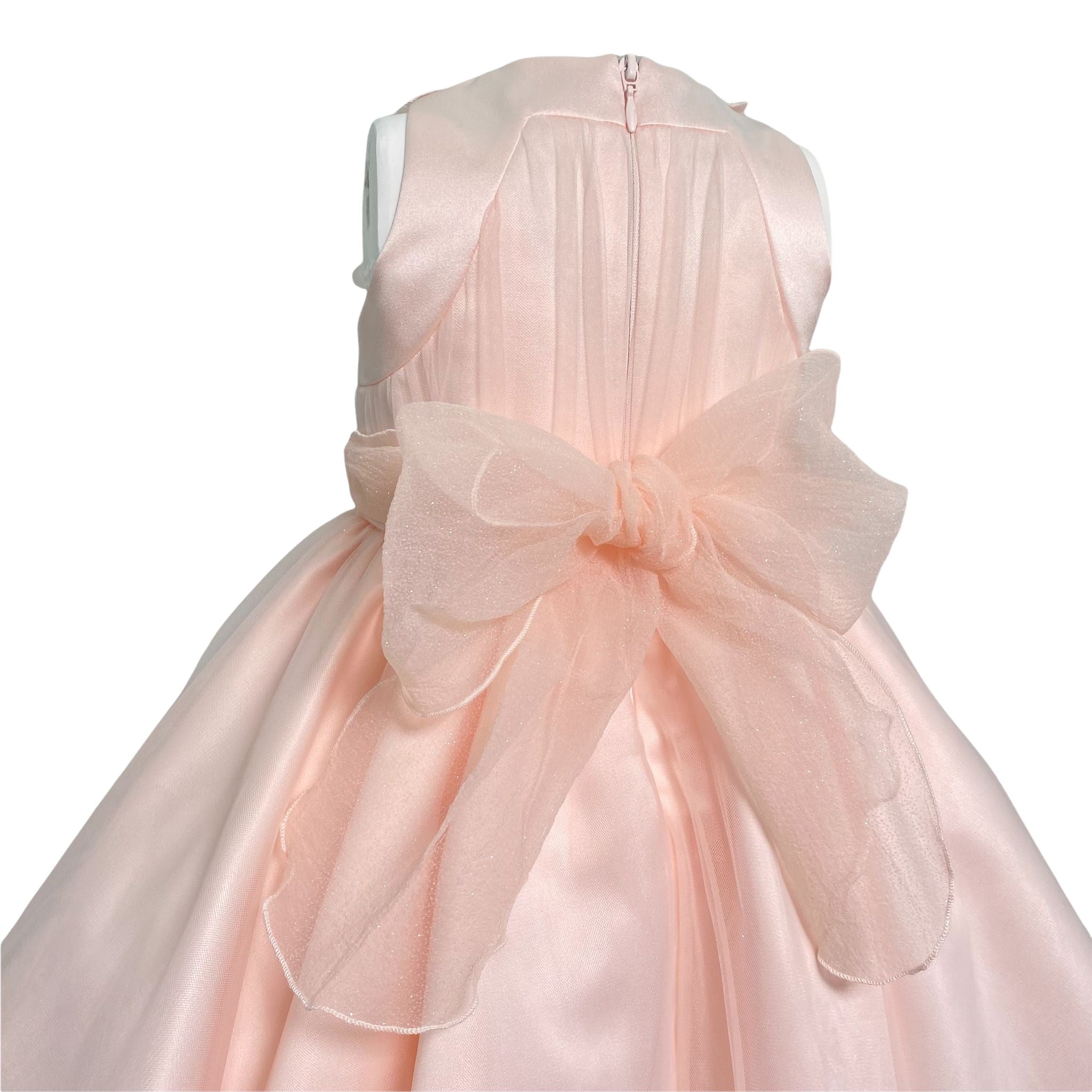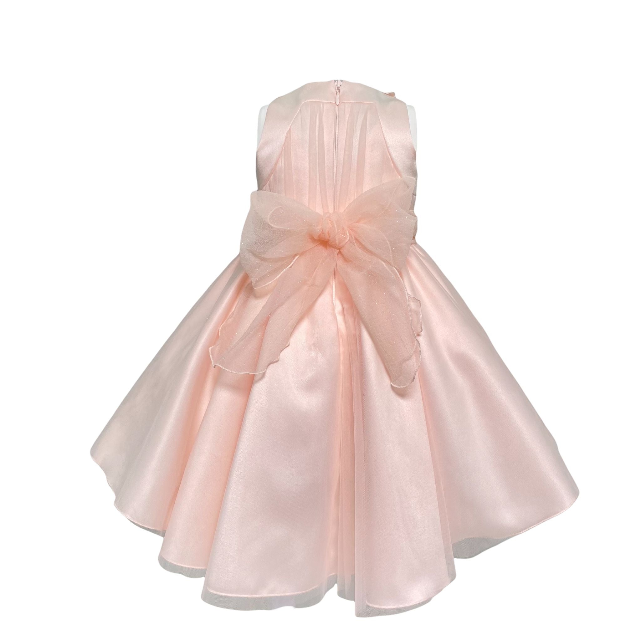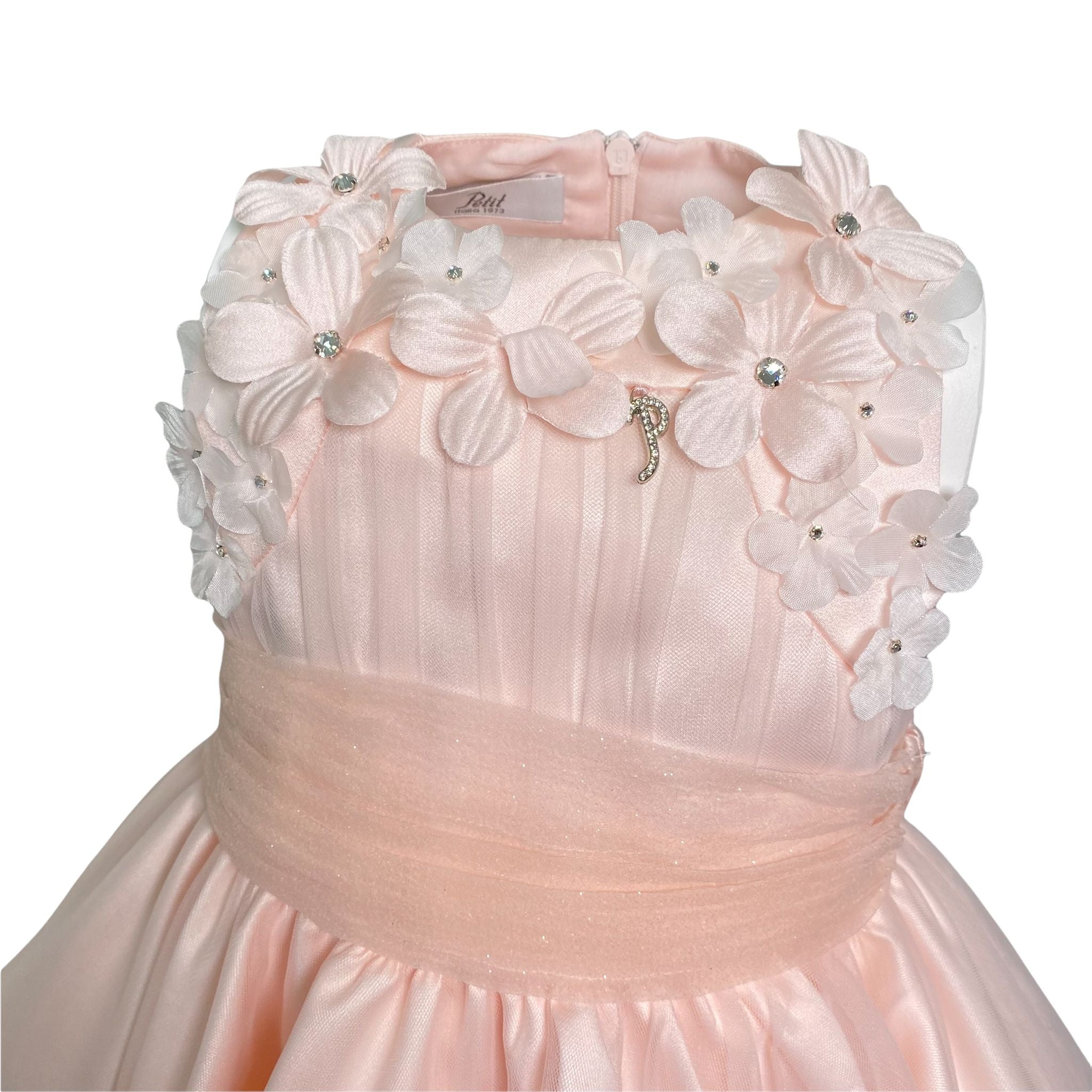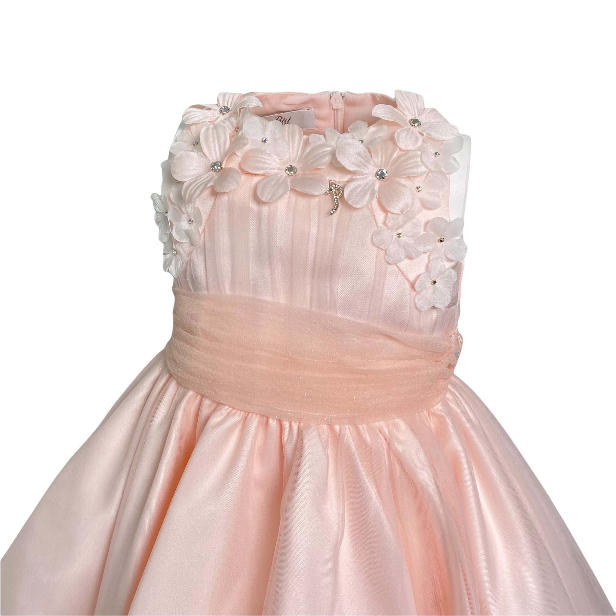 Elegant sleeveless silk dress with silk bodice covered with tulle and flowers.