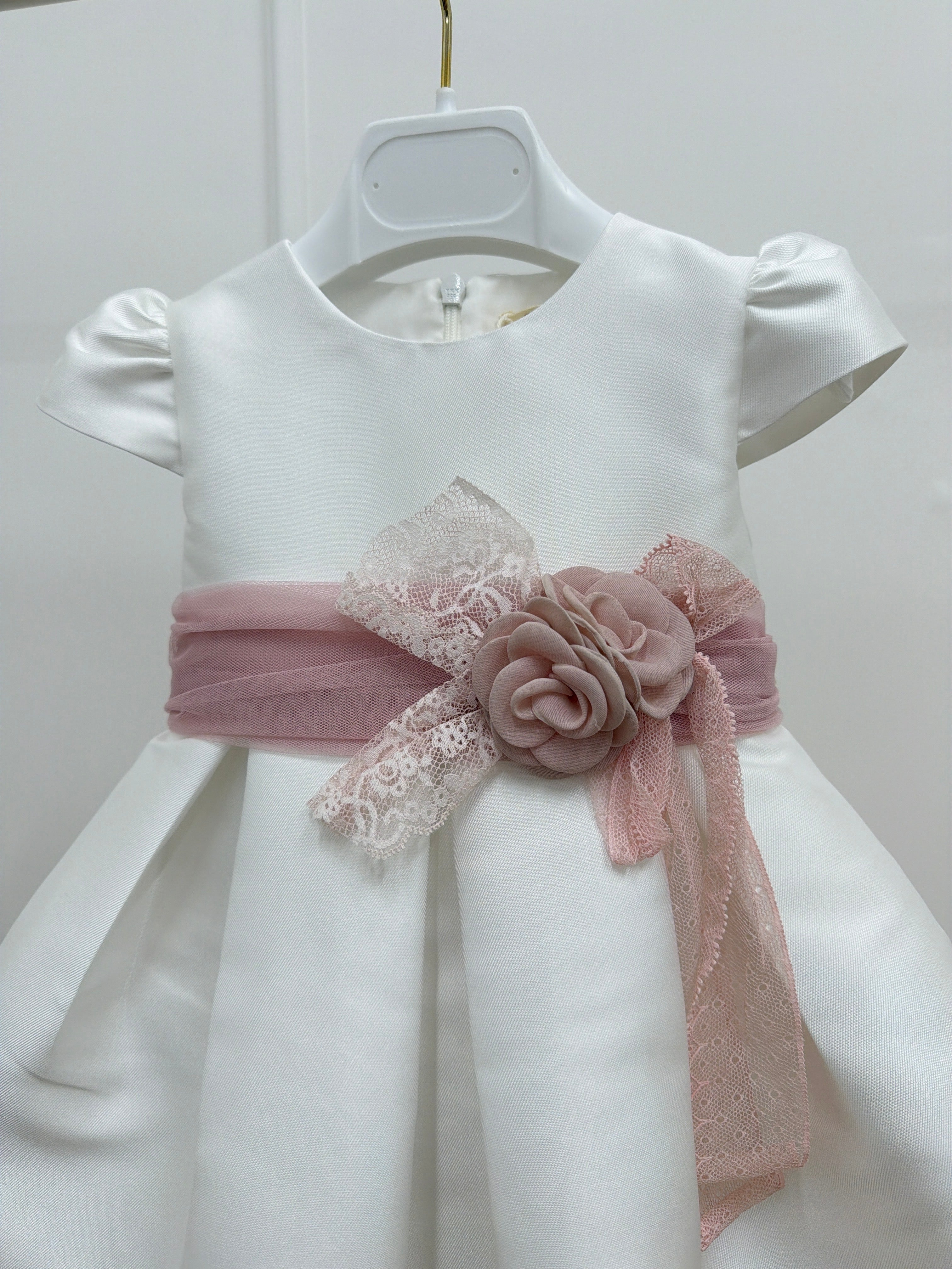 Abito elegante in mikado per neonata, caratterizzato da maniche a mezza lunghezza e affascinante fascia in vita. Il tessuto mikado, nobile e strutturato, assicura una caduta impeccabile e una silhouette sofisticata. Perfetto per battesimi, cerimonie e occasioni indimenticabili, questo abito valorizza la delicatezza della piccola indossatrice con dettagli curati e raffinati. Comfort e eleganza per i momenti più importanti.