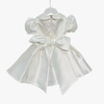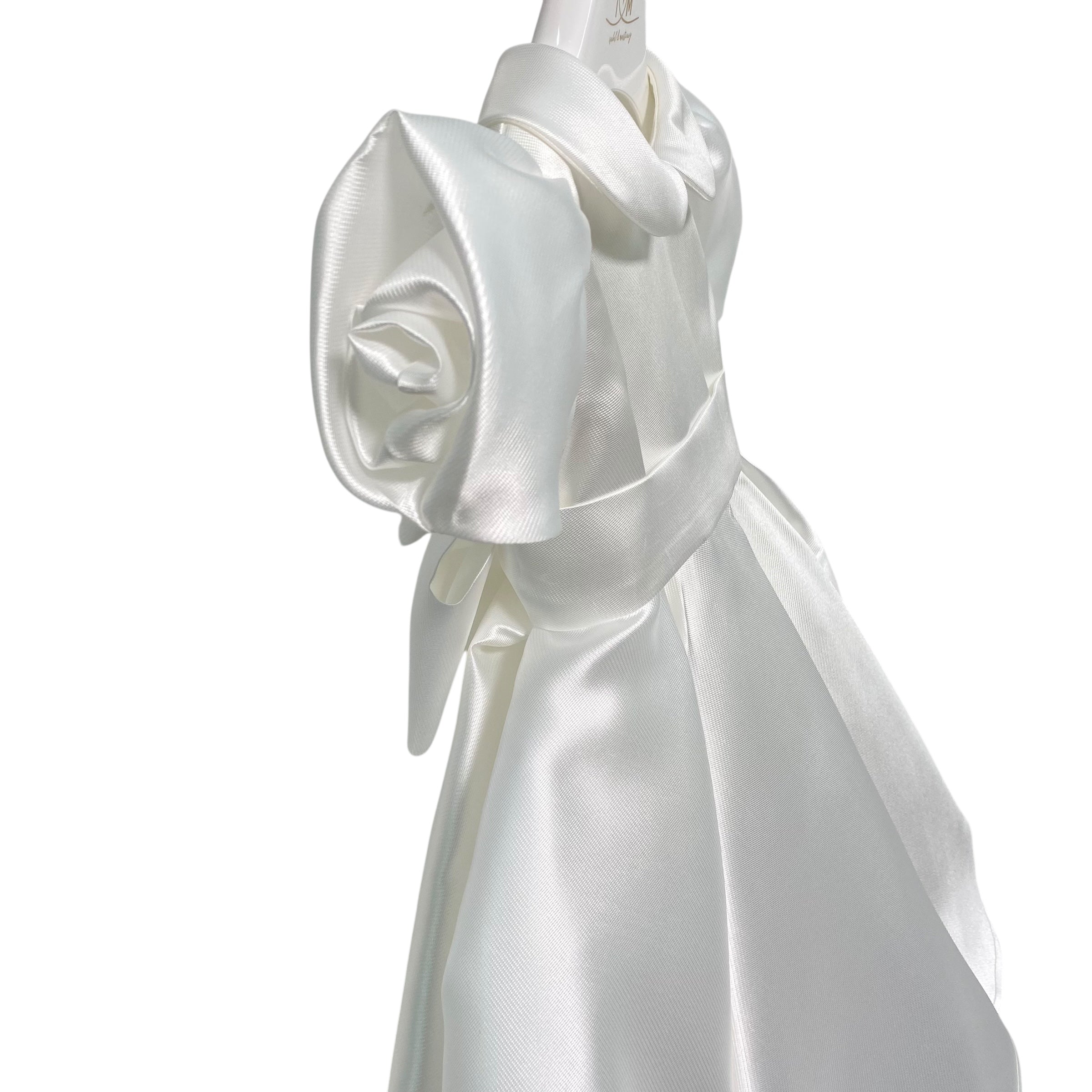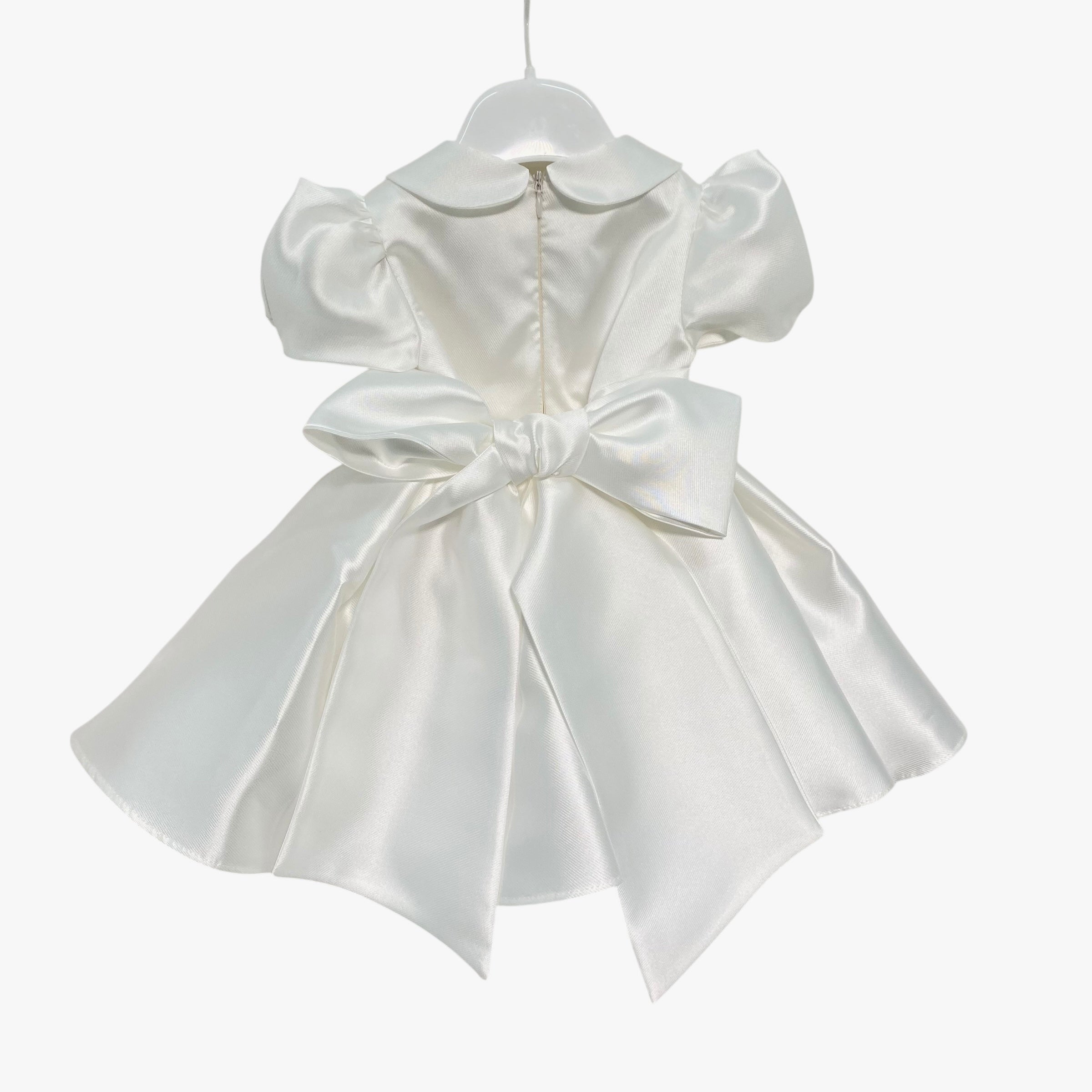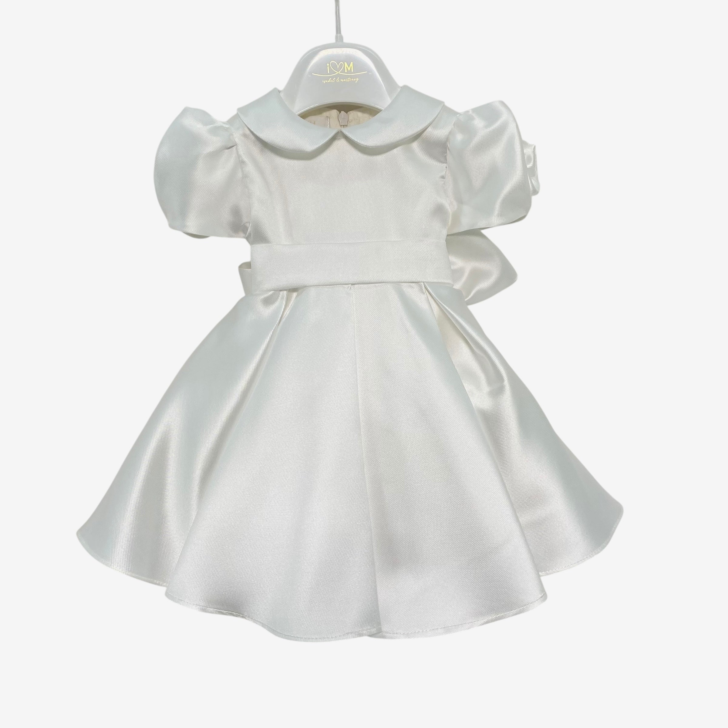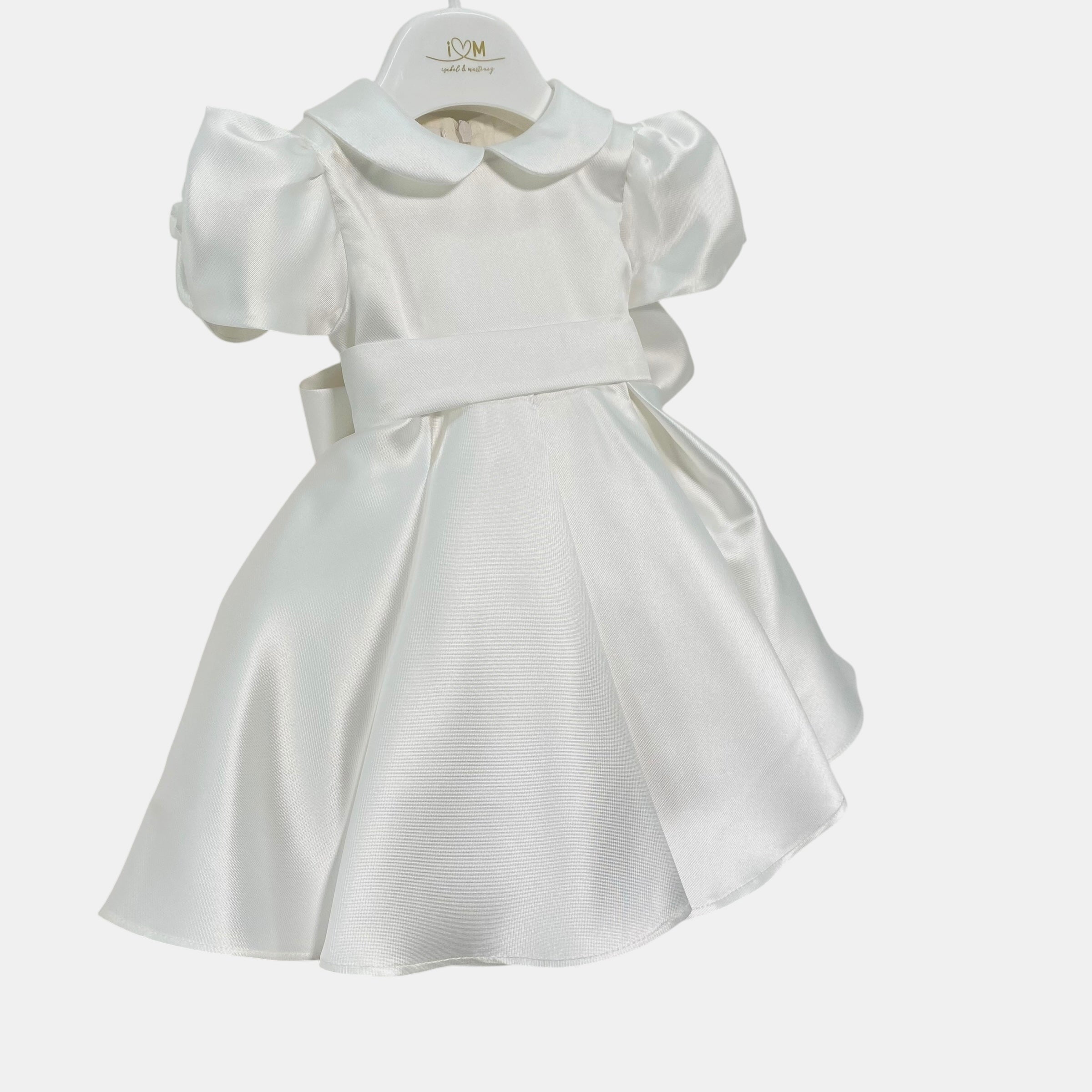 Questo abito elegante in mikado per neonata combina raffinatezza e comfort. Caratterizzato da maniche a palloncino mezza lunghezza, una silhouette svasata e un colletto tondo, offre un look delicato e sofisticato. La chiusura con zip invisibile sul retro garantisce una vestibilità perfetta, mentre il fioccone decorativo aggiunge un tocco di dolcezza. Ideale per occasioni speciali come il battesimo, questo capo unisce stile classico a dettagli curati per un risultato impeccabile.