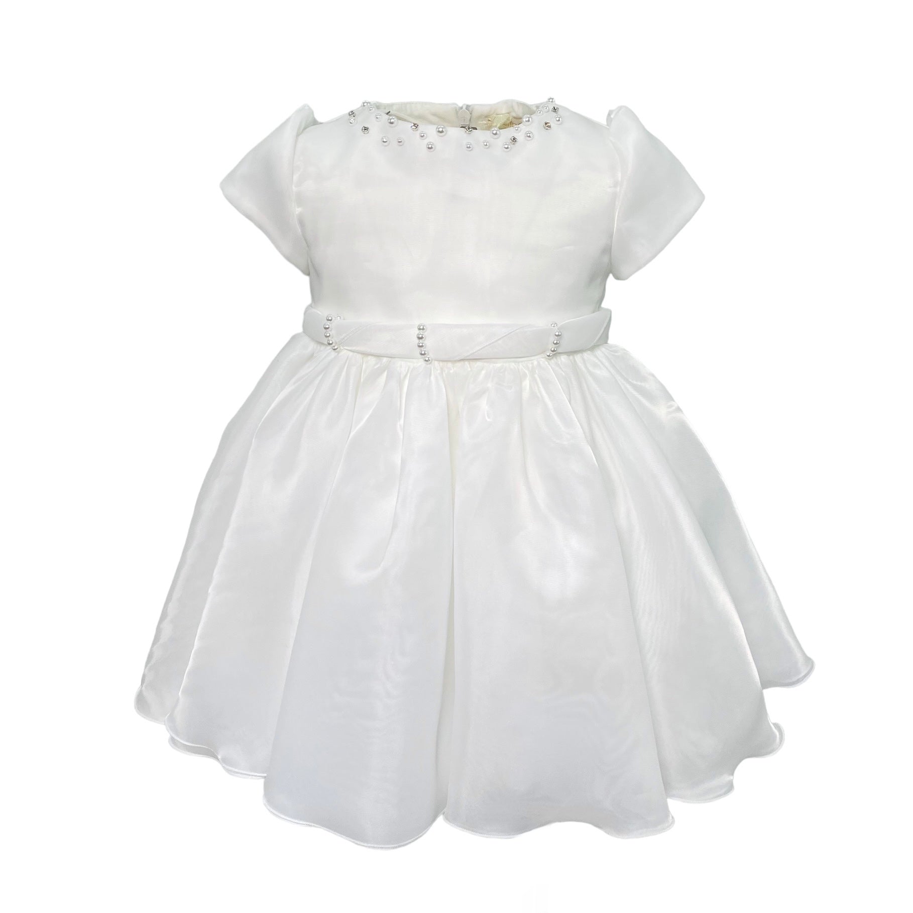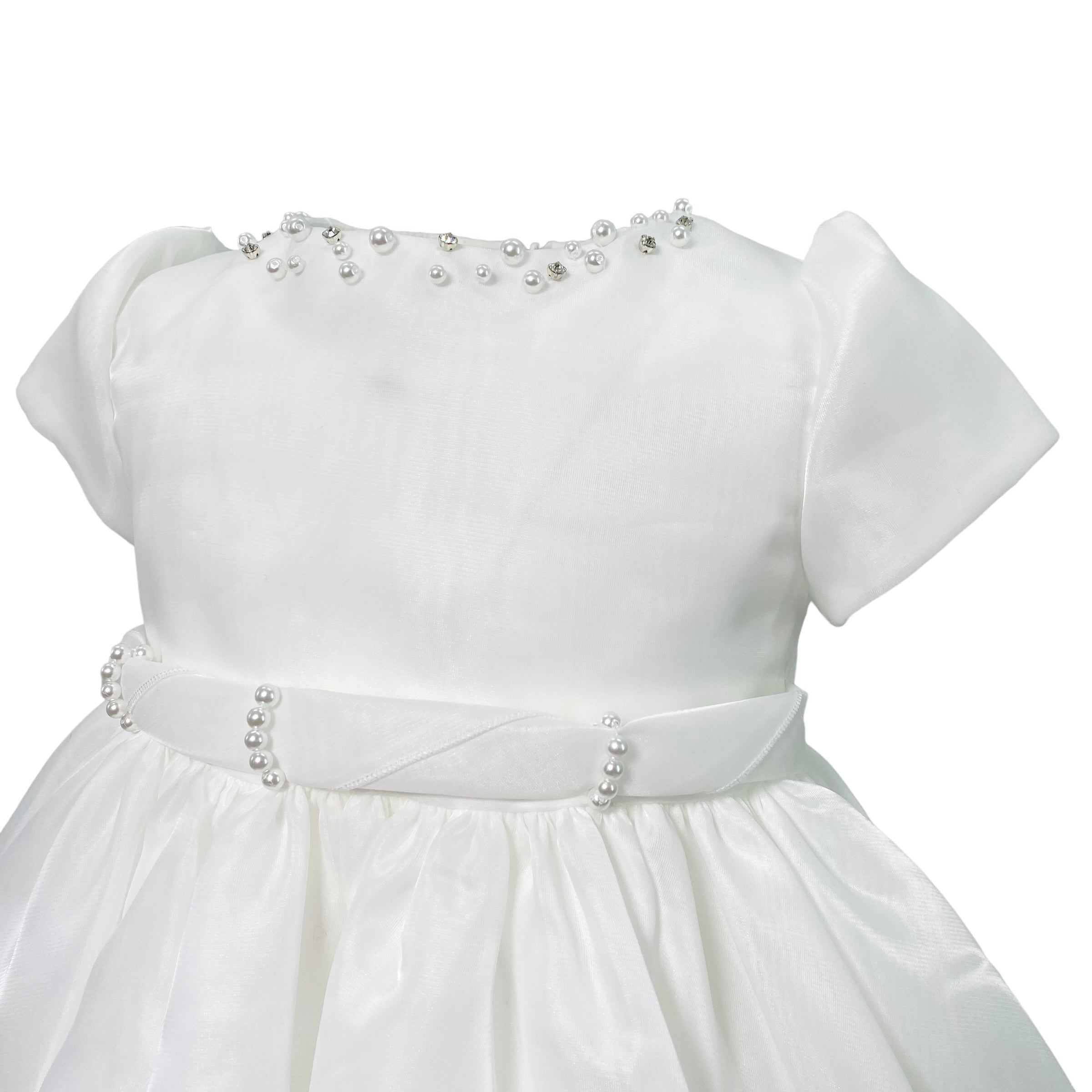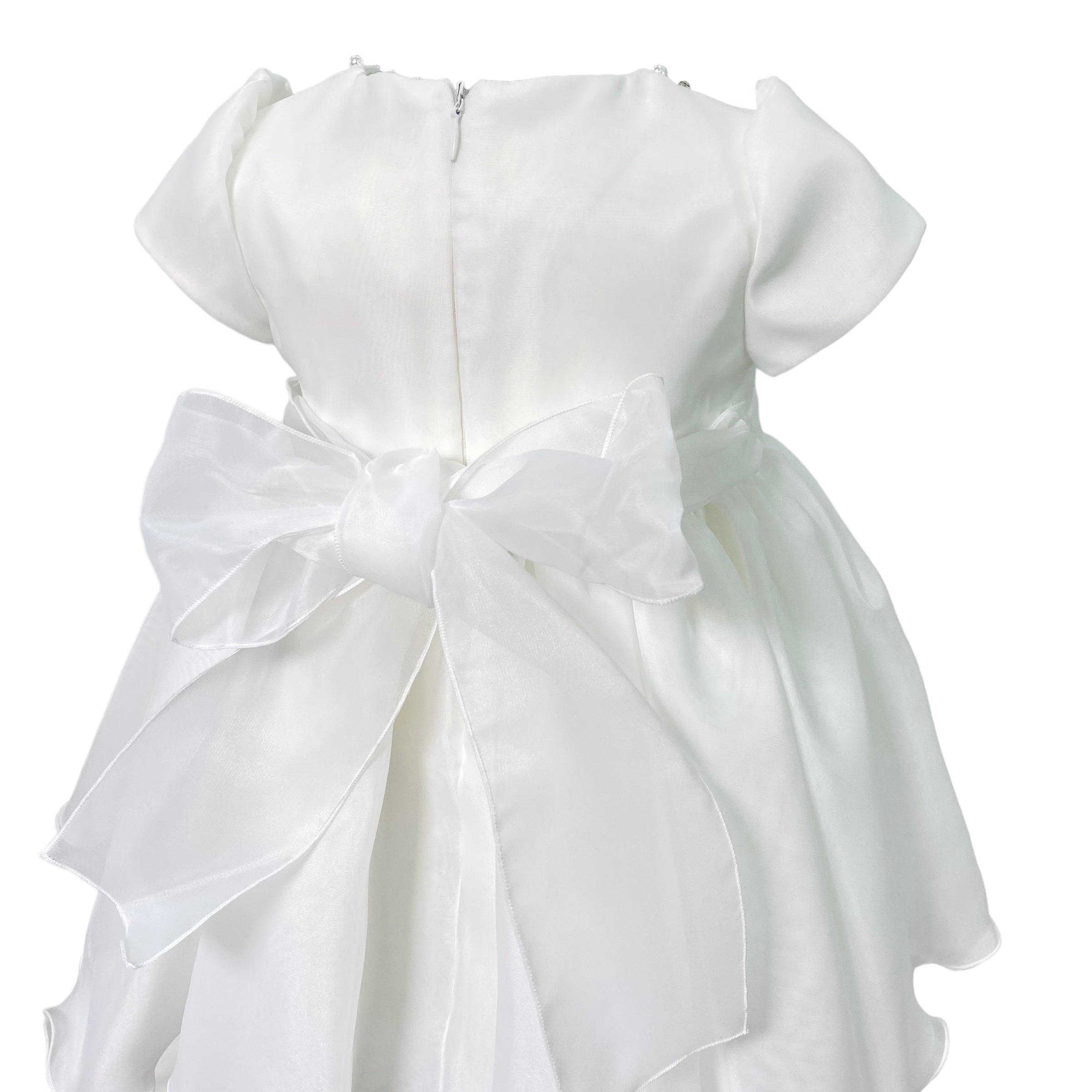 Elegantes, ausgestelltes Kleid mit halben Ärmeln aus weißem Organza, mit Svarowsky- und Perlenapplikation am Oberteil und Schleife am Rücken.