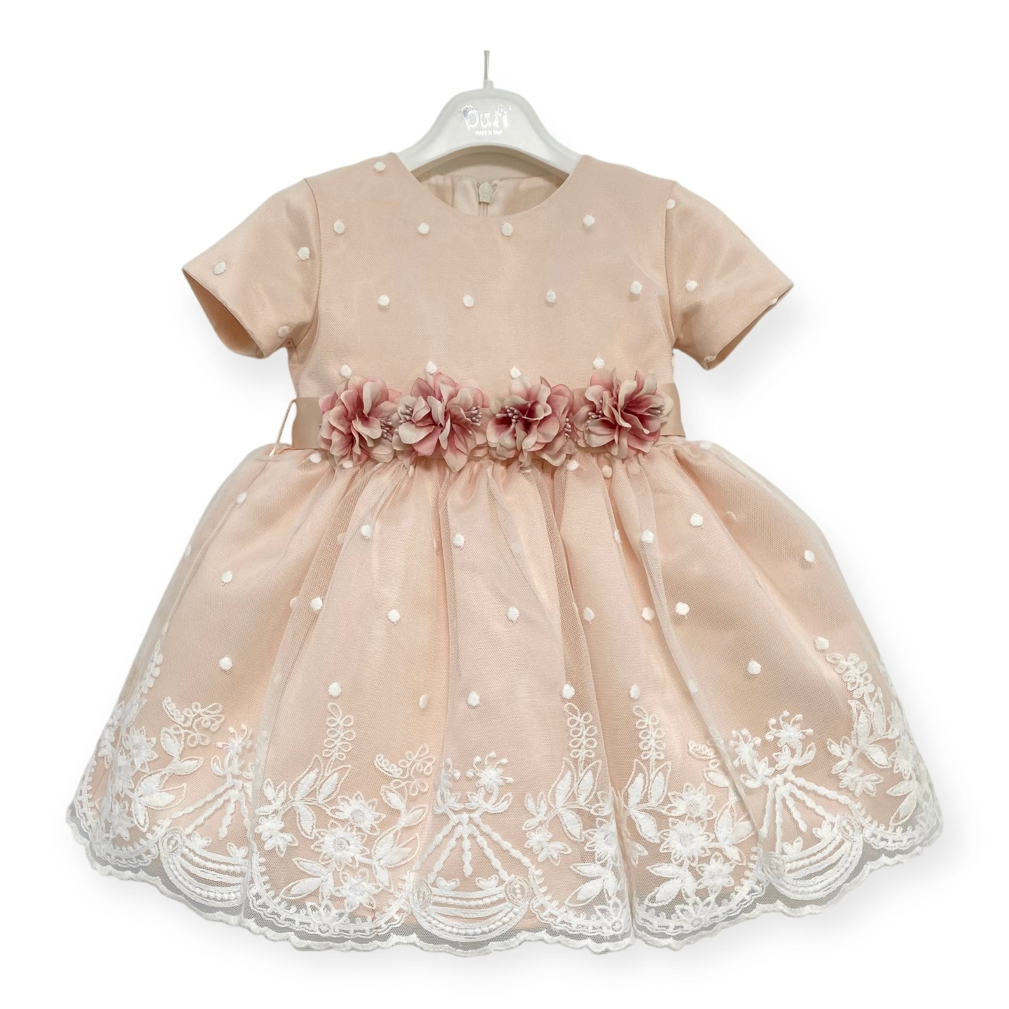 Questo abito elegante per neonata è perfetto per le occasioni speciali. Realizzato in tulle ricamato con mezza manica, presenta un modello bambolina con una fascia di fiori in vita e fiocco sul retro. La chiusura con zip invisibile garantisce una vestizione comoda e facile. Aggiungi un tocco di eleganza al guardaroba della tua bambina con questo abito unico.