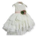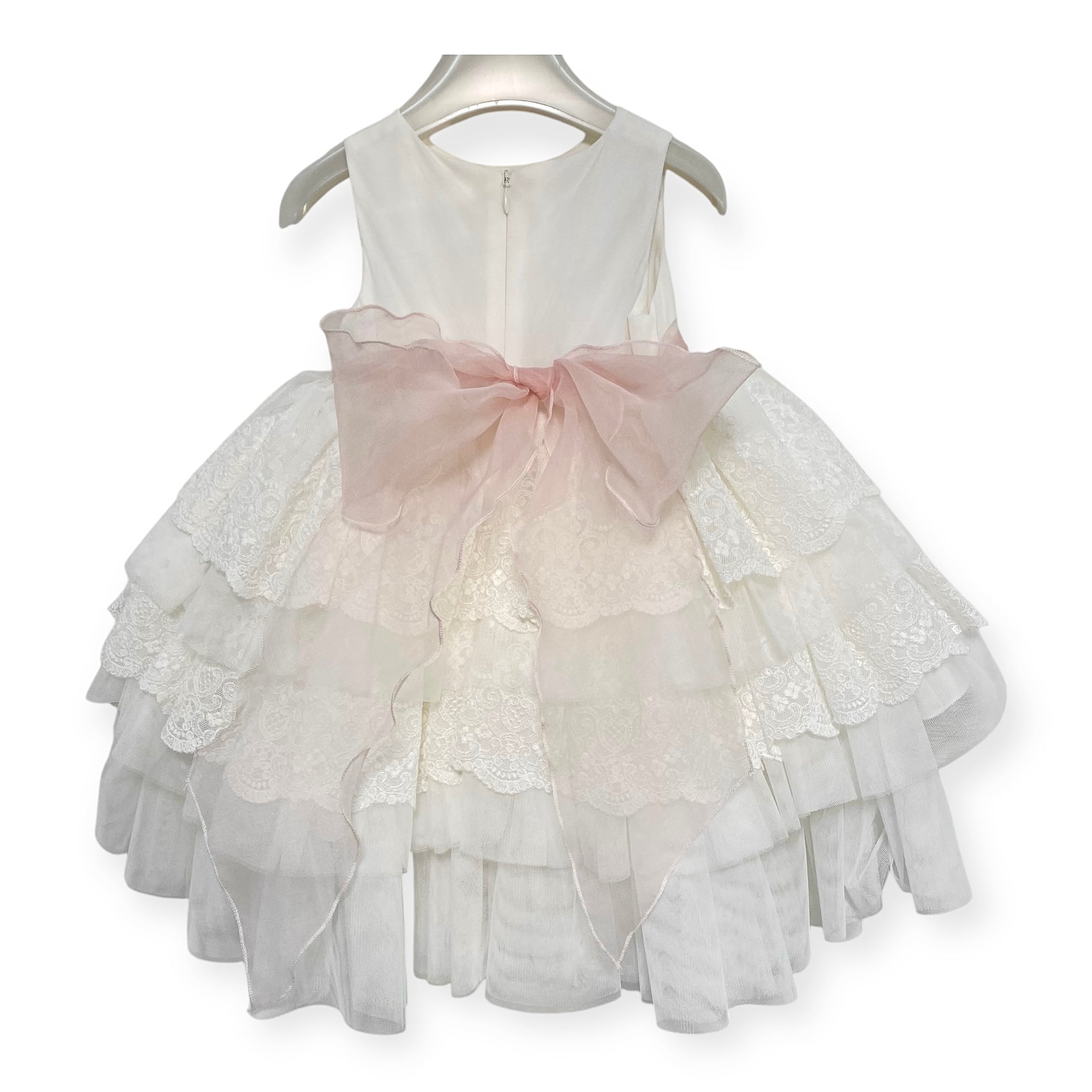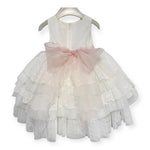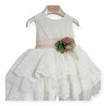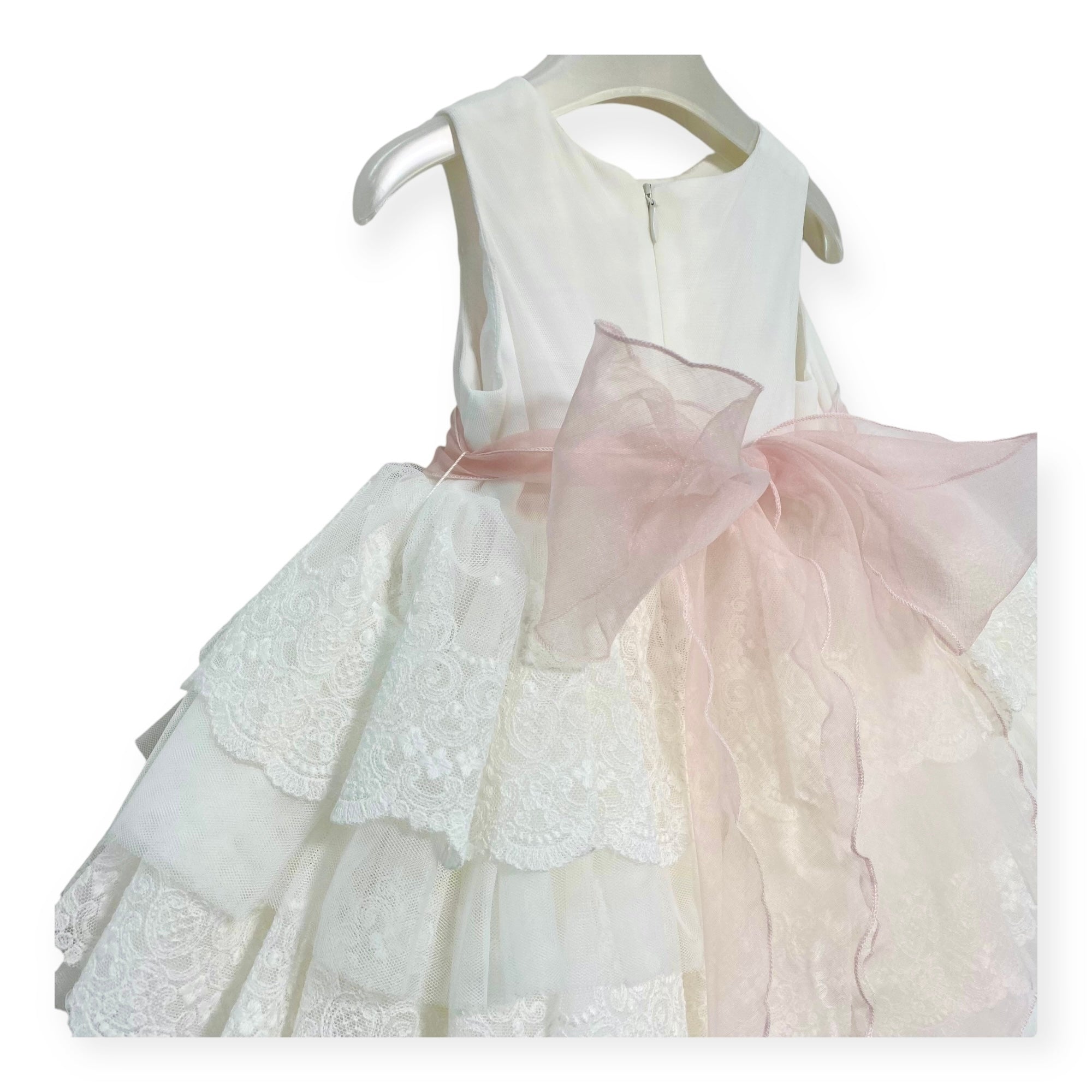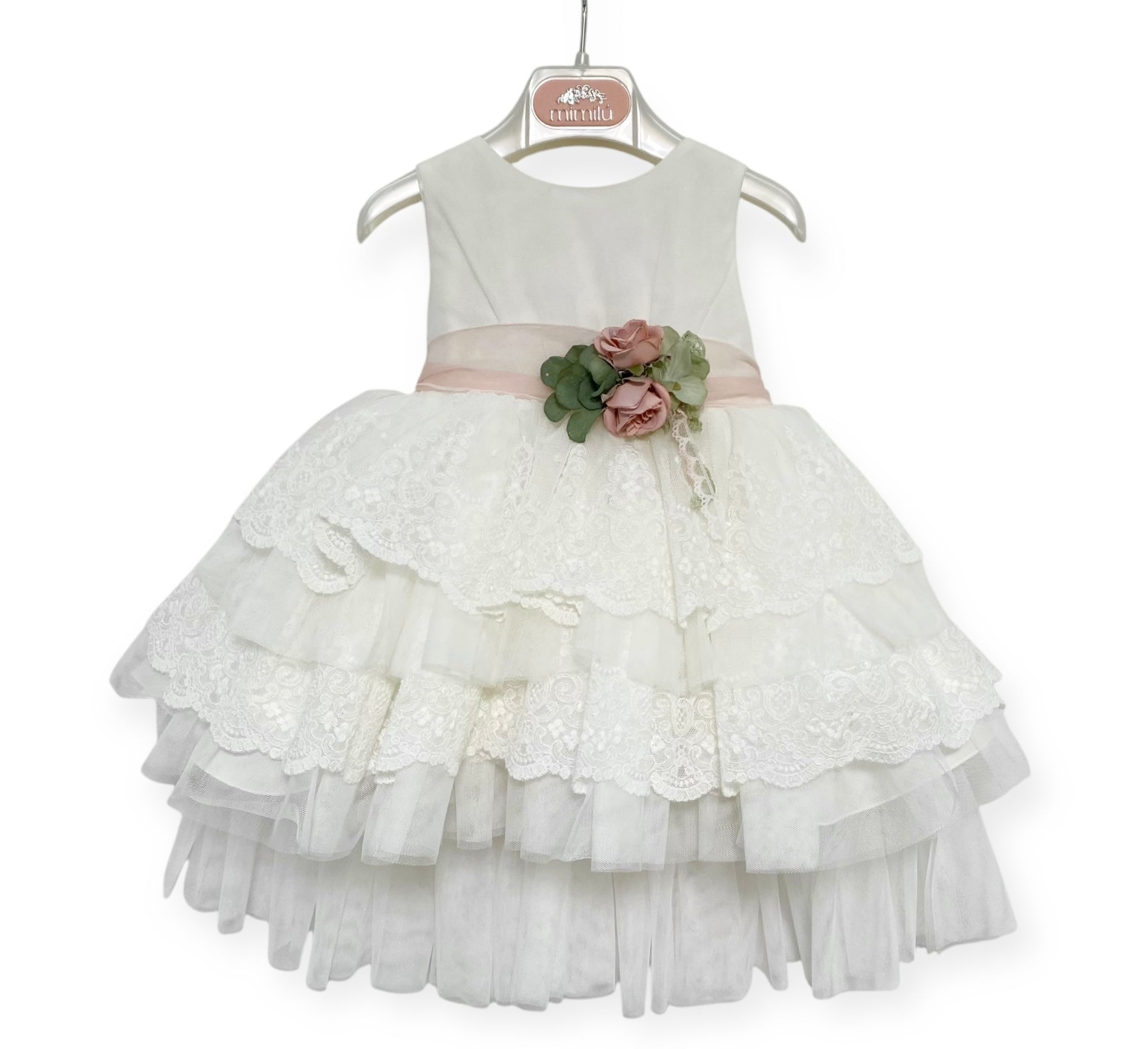 L'abito elegante senza maniche MIMILU' è perfetto per le occasioni speciali! Con balze, tulle e pizzo con code', il vestito è impreziosito da una fascia in organza rosa con un fiore sul davanti. La chiusura a zip invisibile sul retro garantisce comodità e praticità. Stupisci con questo elegante abito!