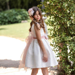 Applicazione in vita di fascia in organza rosa antico, con spilla di fiori removibile, e chiusura con fioccone sul retro.