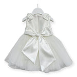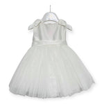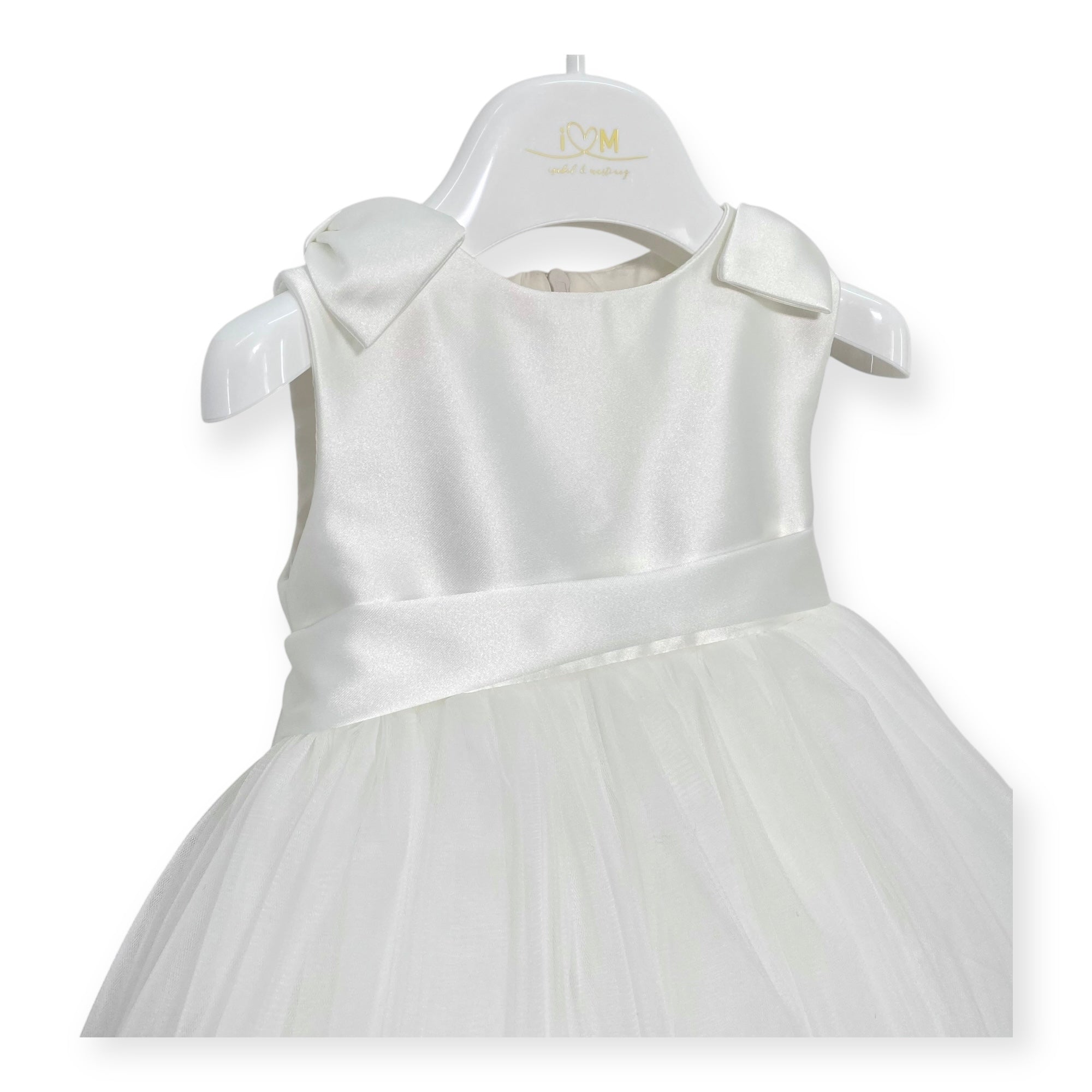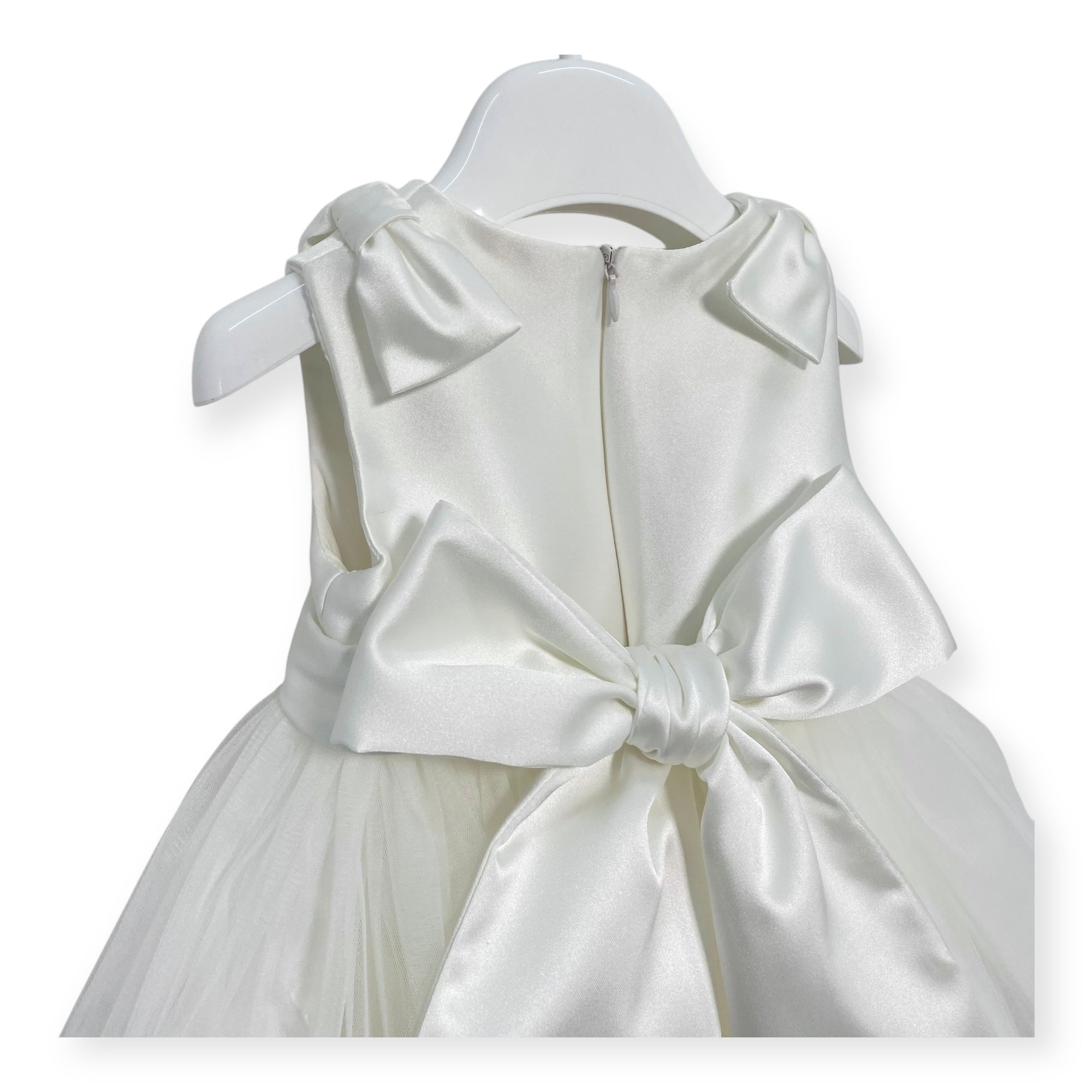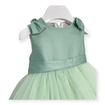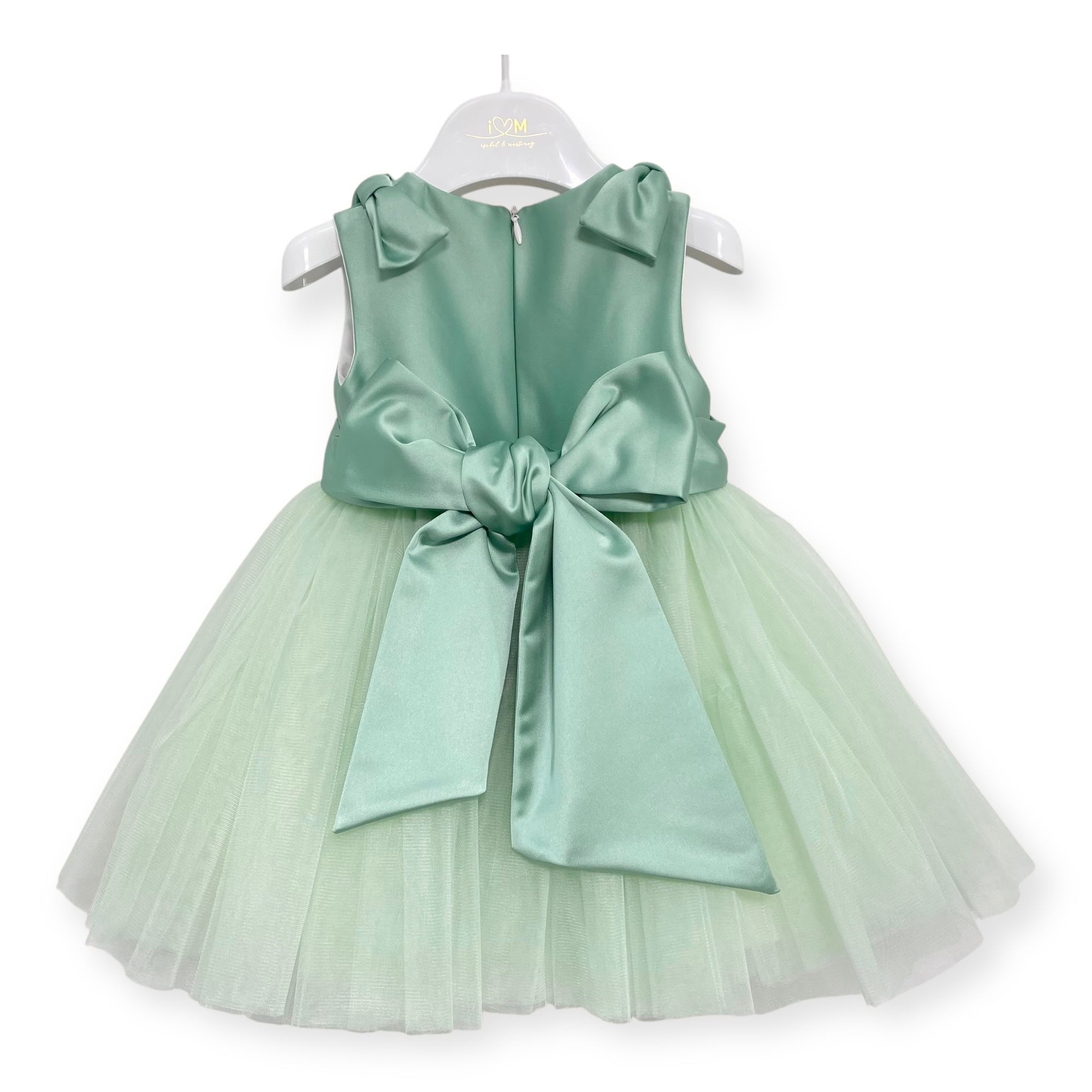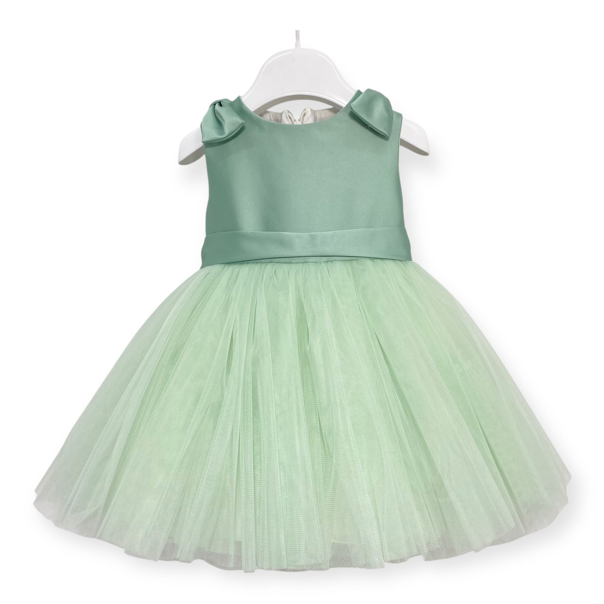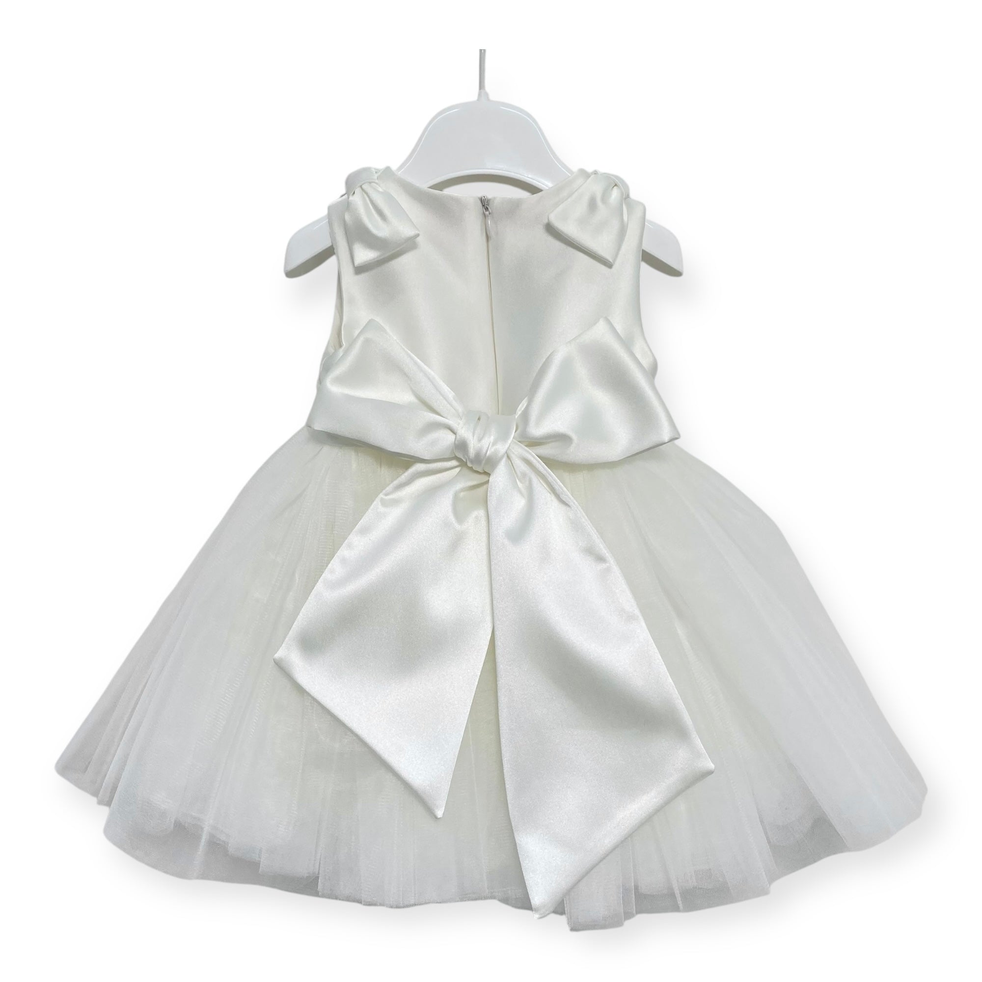 Questo elegante abito smanicato per neonati è perfetto per occasioni speciali. Presenta un corpetto in raso e una gonna in tulle, arricchiti da fiocchi sulle spalle e una fascia in vita con un grande fiocco sul retro. Con una pratica apertura posteriore con cerniera invisibile. Vestibilità confortevole e di alta qualità per la tua piccola principessa.