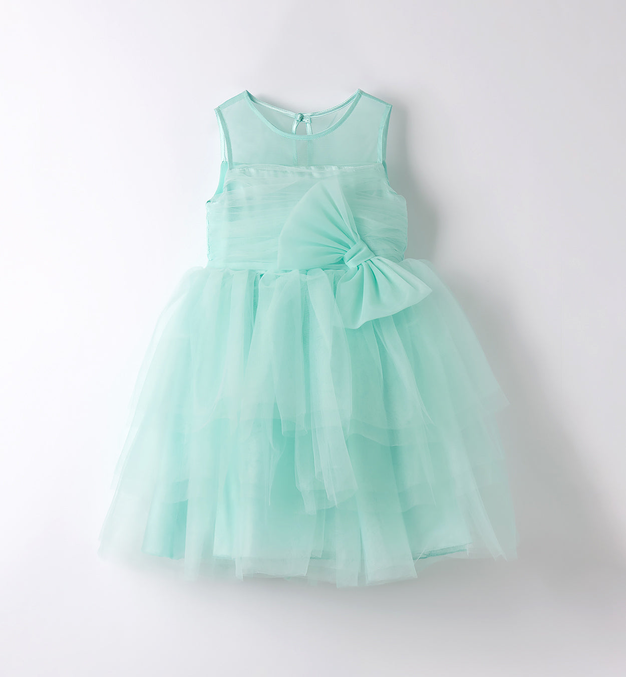 Questo abito elegante Sarabanda per bambina è realizzato in tulle di alta qualità. Con apertura posteriore con bottone e zip laterale, presenta un grazioso fiocco di tulle e una fantasia tinta unita. Perfetto per le occasioni speciali, donerà alla tua bimba un look elegante e raffinato.