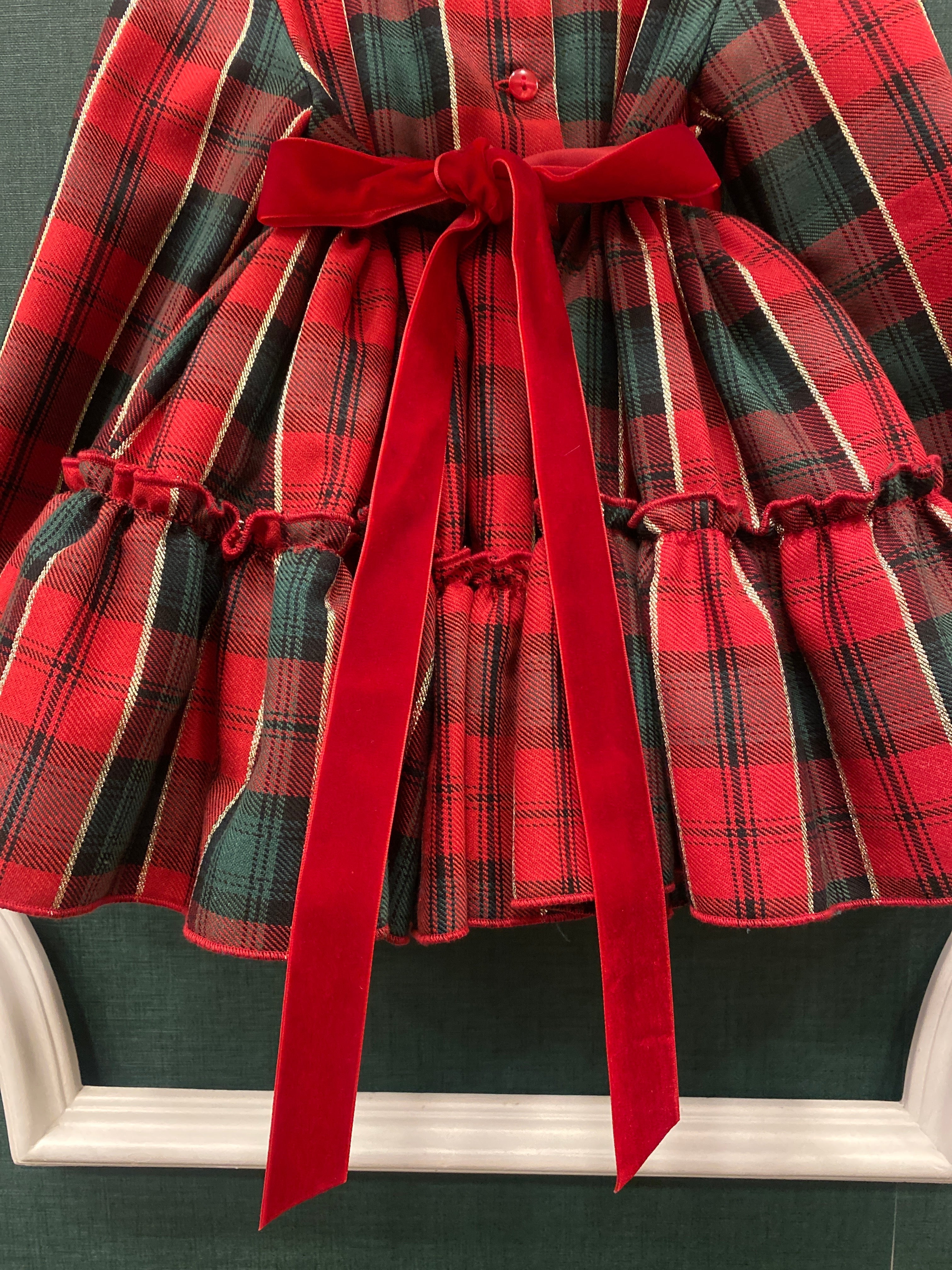 Elegantes, ausgestelltes Langarmkleid mit Schottenmuster, Rüschen und roter Samtschleife an der Taille.