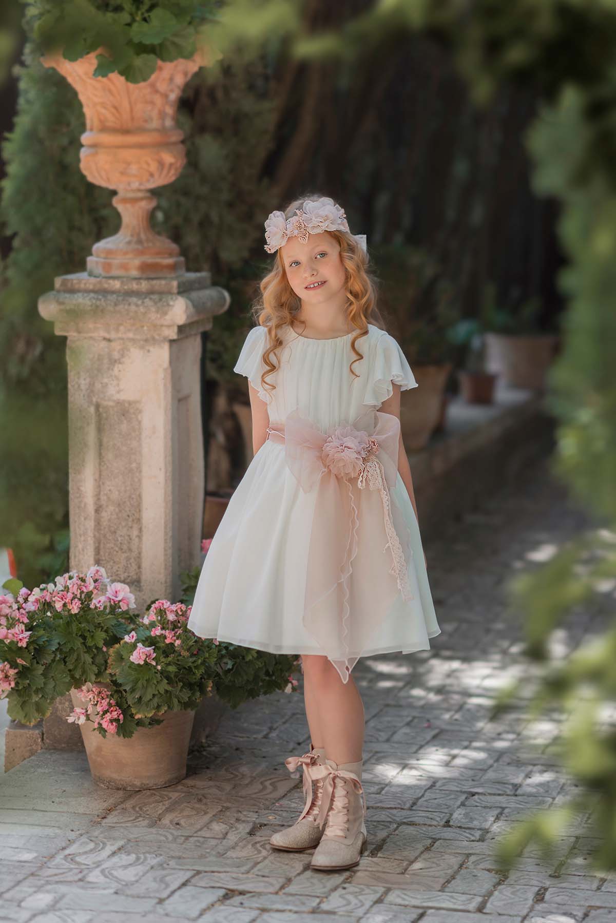 Questo elegante abito in georgette è perfetto per le cerimonie dei vostri bambini. Con il suo grazioso drappeggio sul corpetto, le maniche con volant e la cintura rosa antico decorata con un fiocchettone e fiori, l'abito è sia sofisticato che adatto ai più piccoli. La morbidezza e la leggerezza del tessuto lo rendono perfetto per chi desidera un look svolazzante e confortevole.