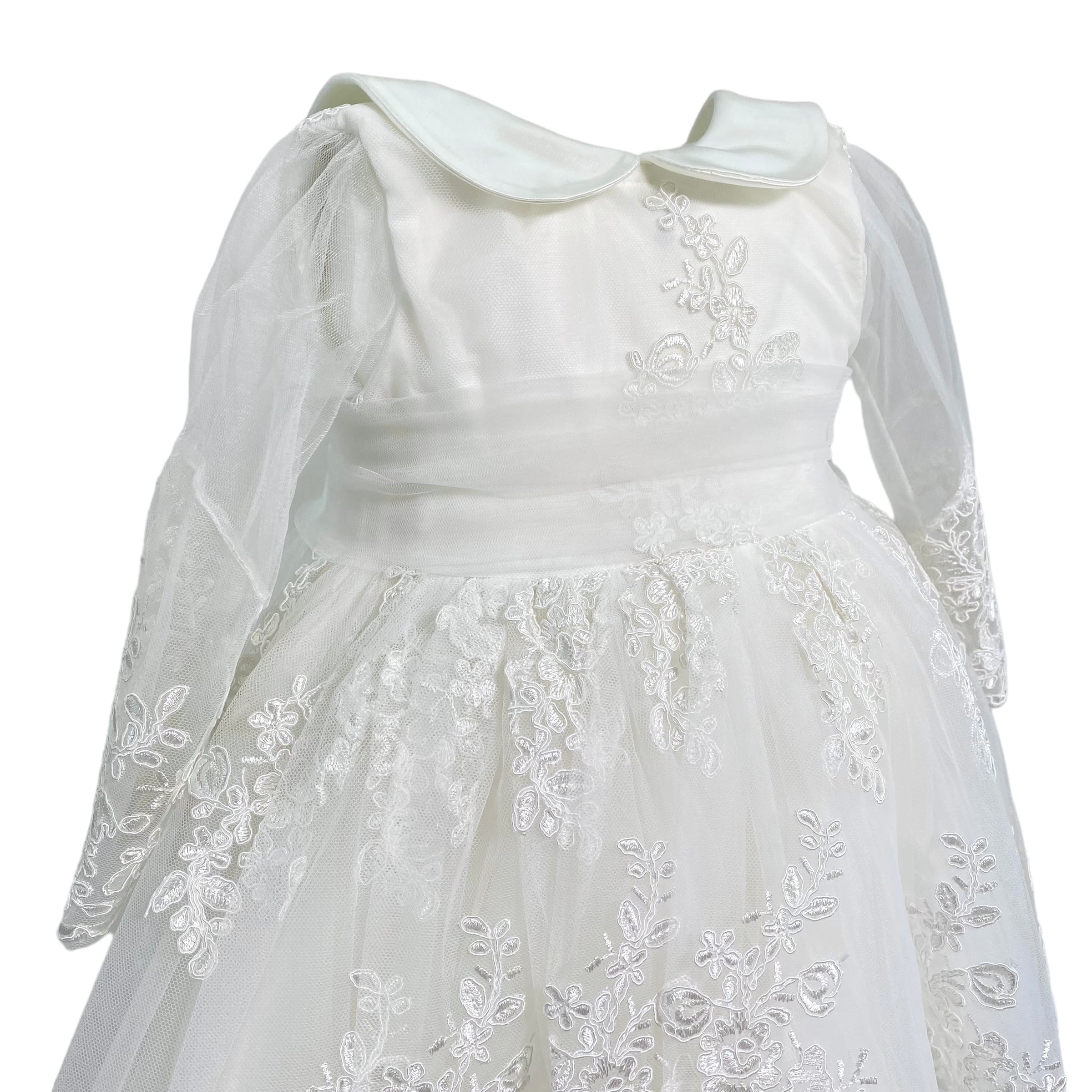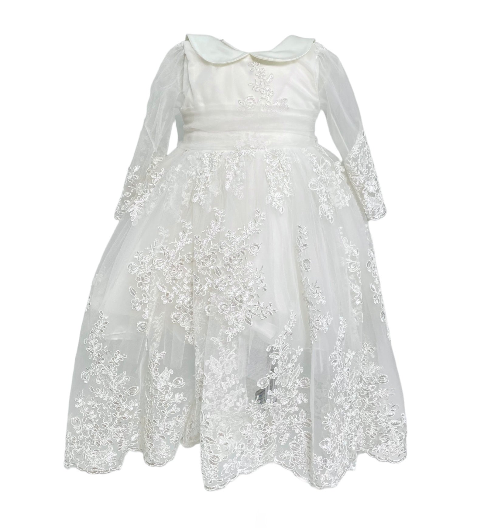 Long baptismal dress in tulle with applied lace, with round neck and long sleeves.
