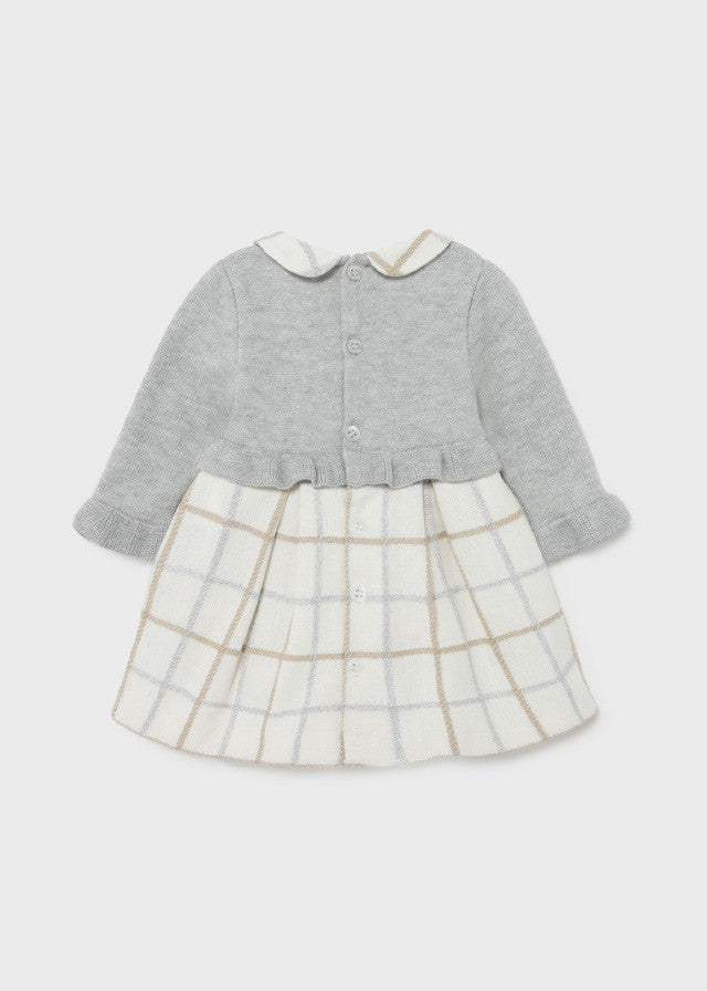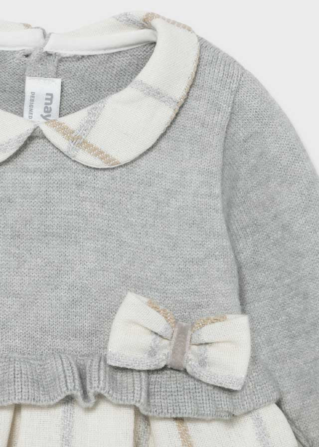 Long sleeve dress for baby girls 0-18 months with ruffles on the edge of the sleeve. Collar shirt model in contrasting color. Chest cut design. Button closure on the back to facilitate the fit of the garment. Model with inner lining. Decorative elements: decorative knot. Checkered texture.