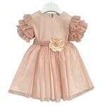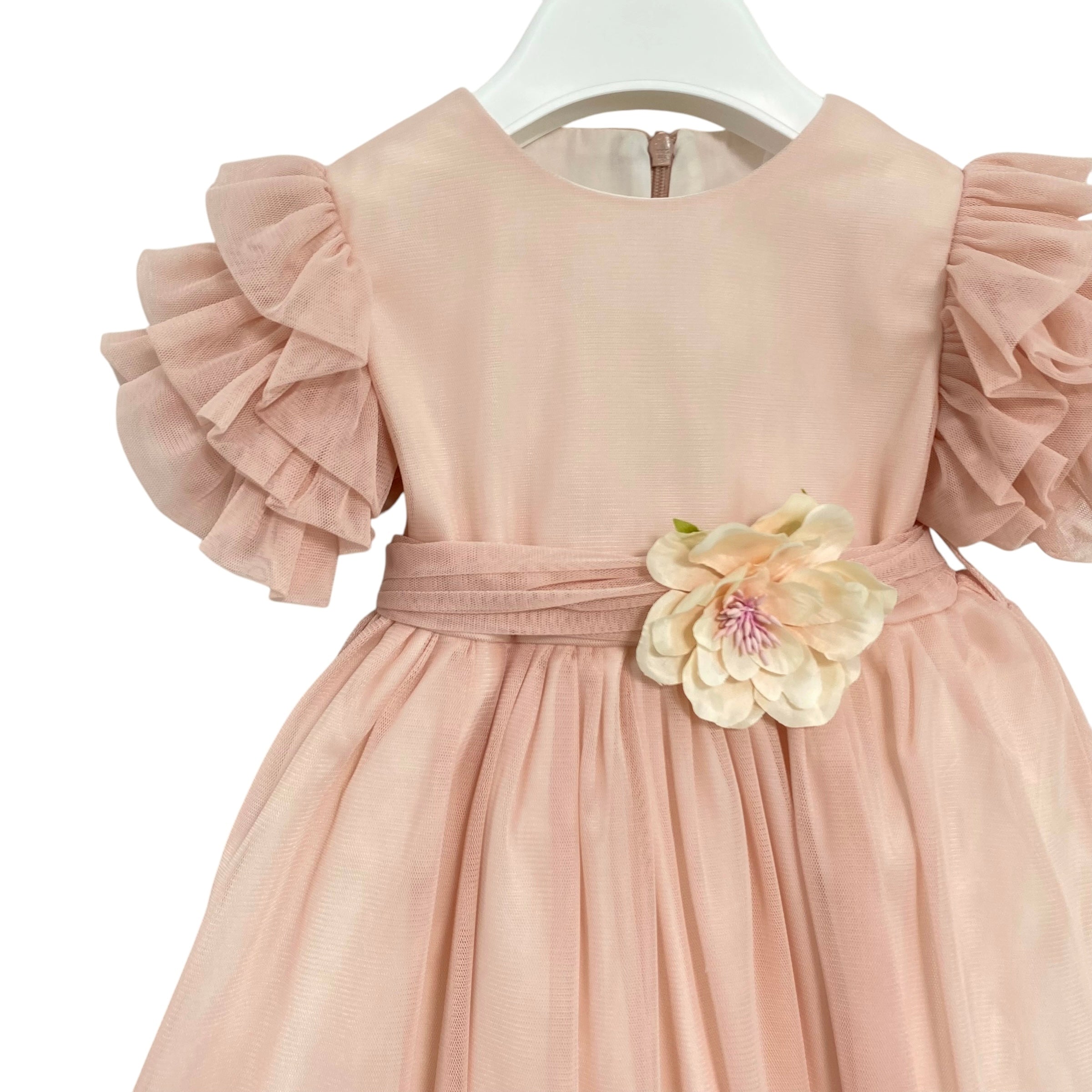 Il nostro abito elegante mezza manica in tulle è perfetto per le occasioni speciali. Dotato di rouches sulle maniche e una fascia in vita con fiocco sul retro e fiore sul davanti, questo abito è ideale per le neonate. La chiusura con zip invisibile garantisce una vestibilità comoda e sicura. Con questo abito, la tua bimba sarà la più elegante della festa!