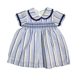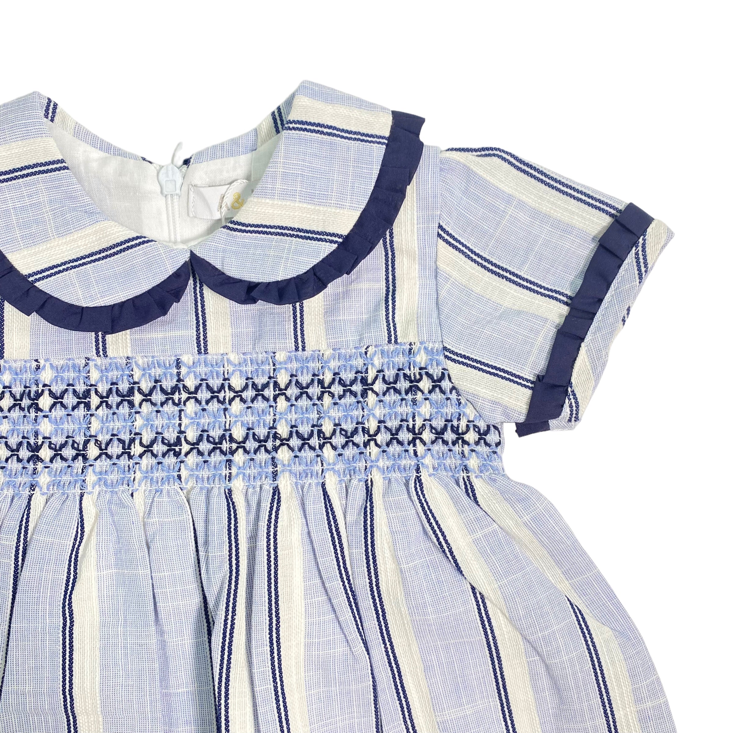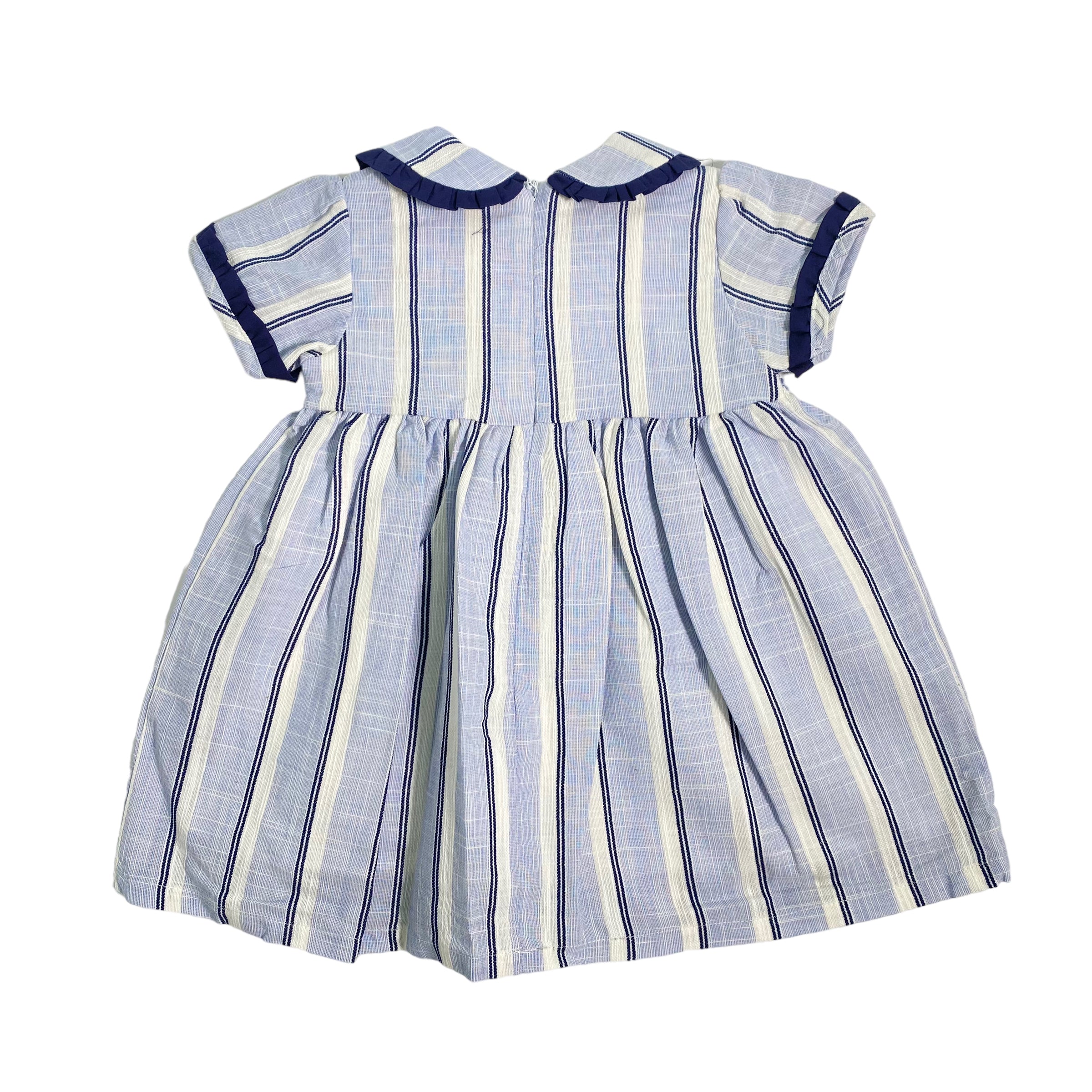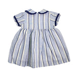 Halbärmliges Kleid aus Baumwolle, hellblau, mit weißen und blauen Streifen.