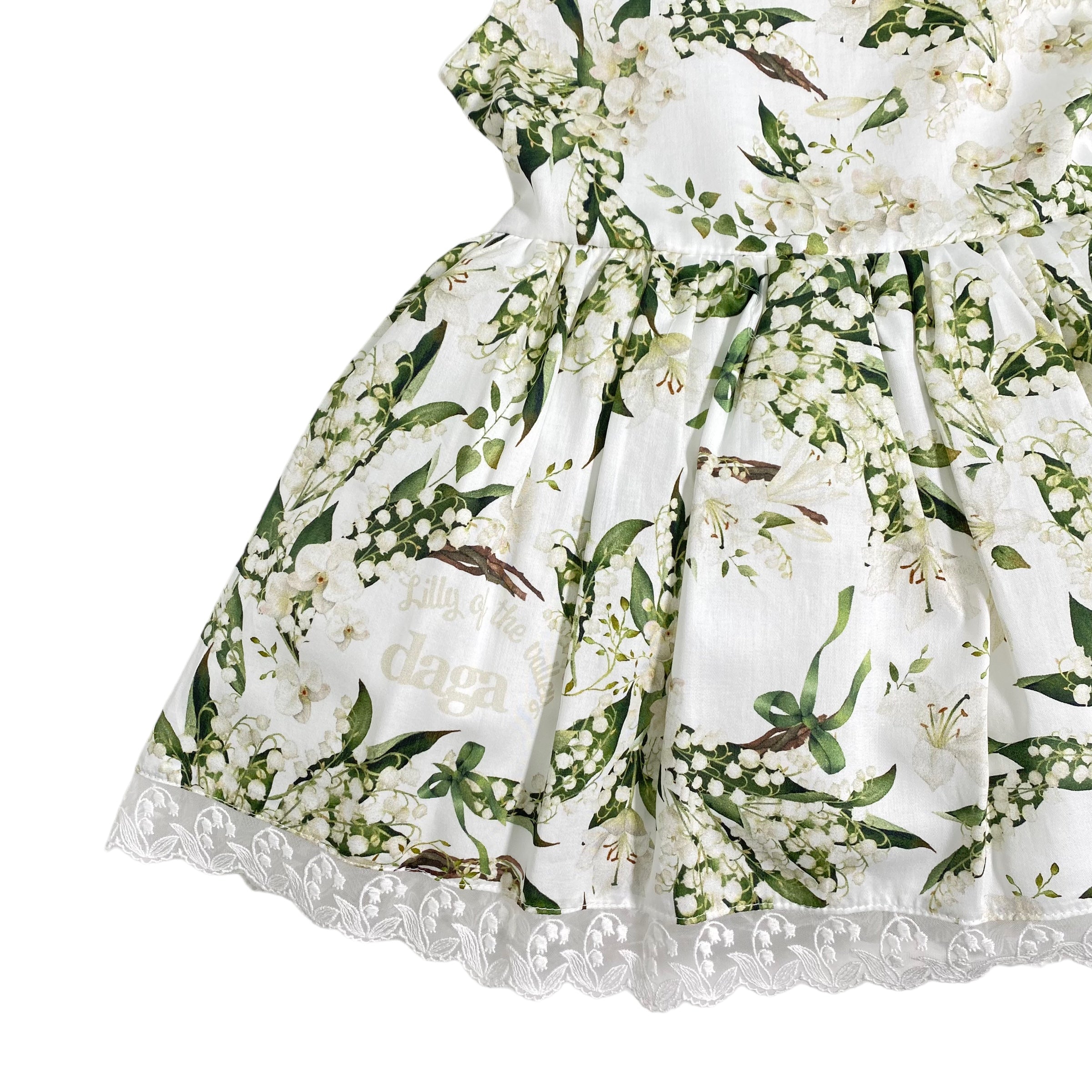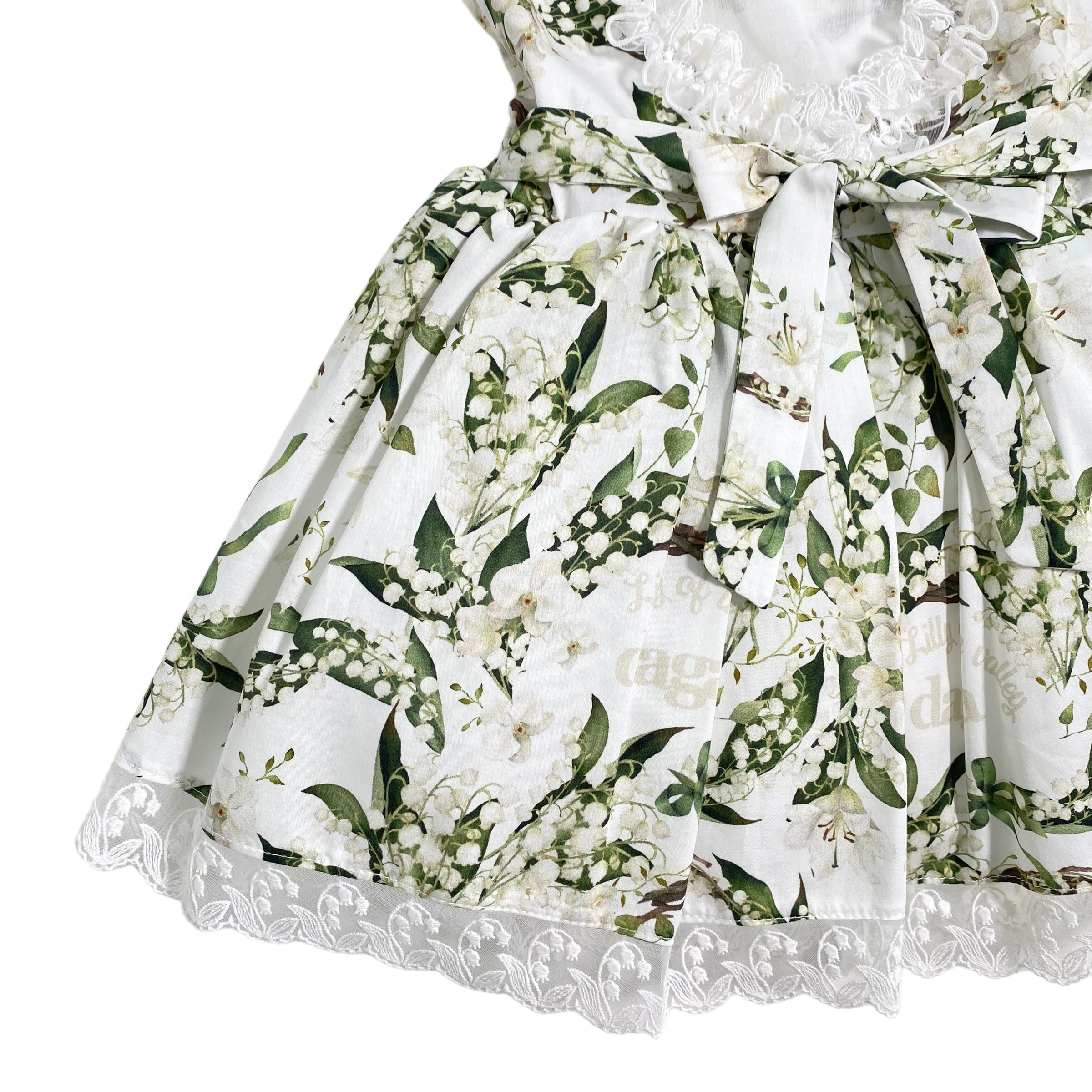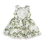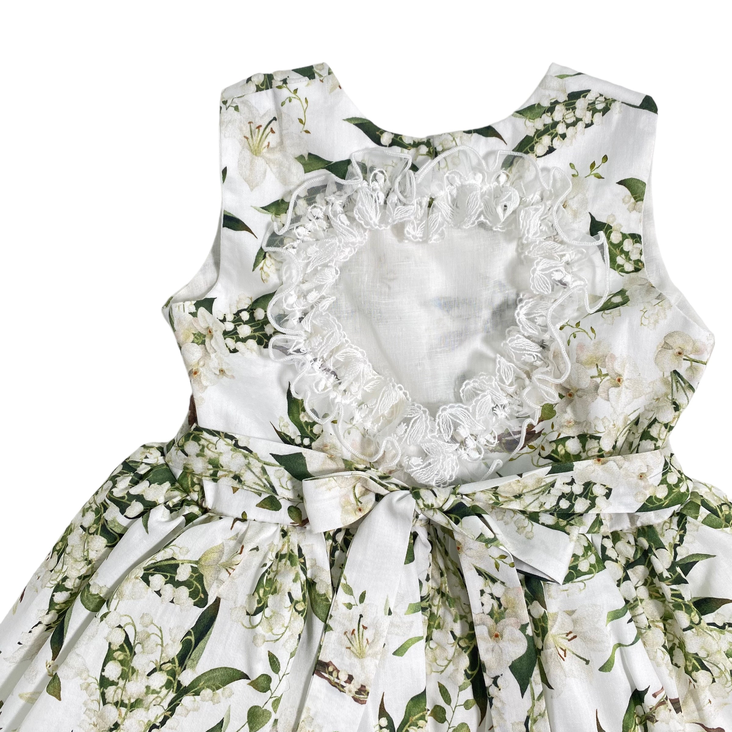 Questo elegante abito smanicato in cotone e pizzo stampato per bambina è perfetto per la primavera. La sua stampa di campanellini e la scollatura sul retro lo rendono un capo unico e raffinato. Ideale per un look primaverile elegante e alla moda.