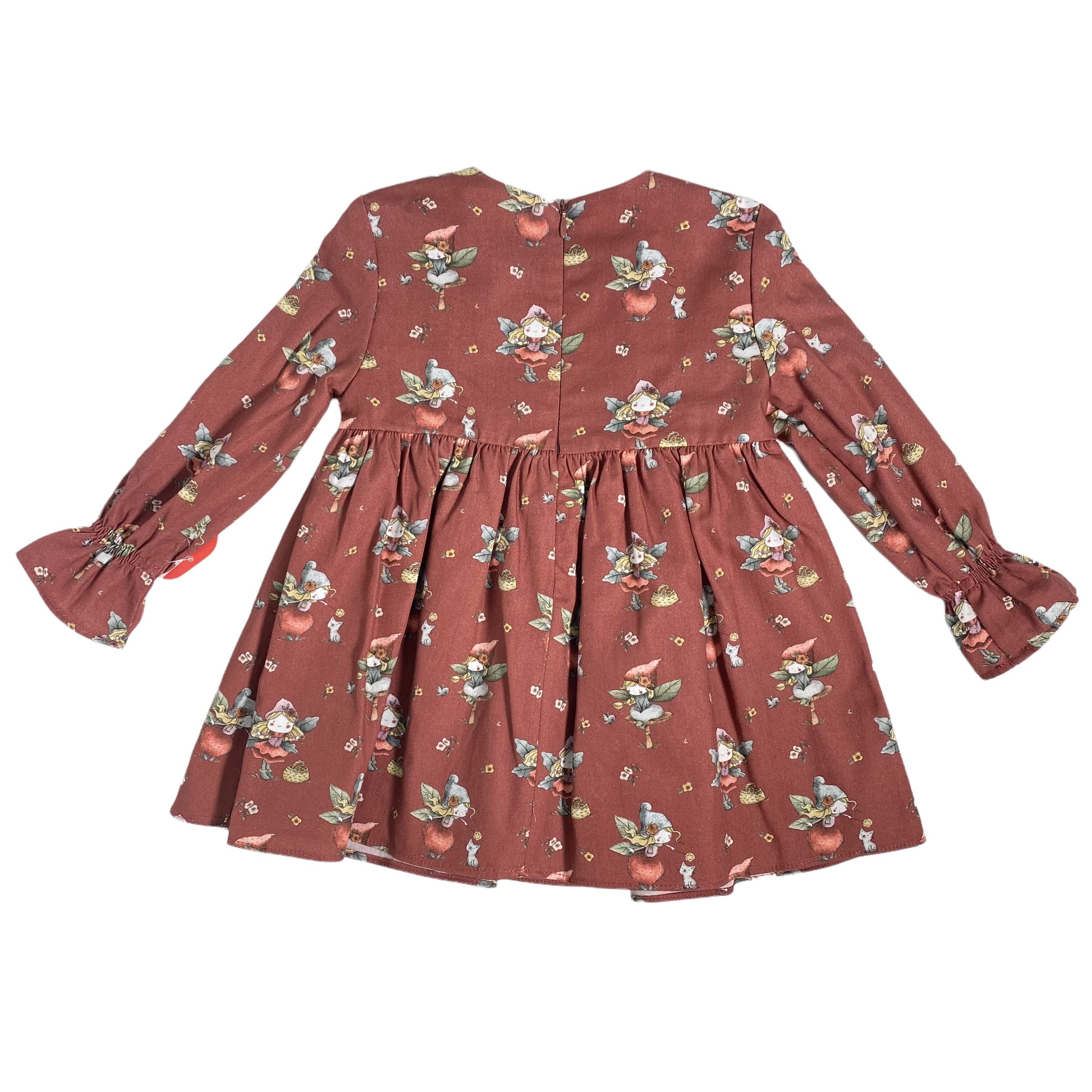 Flared dress in warm cotton, long sleeves, with rouches on the front and fairy fantasy.
