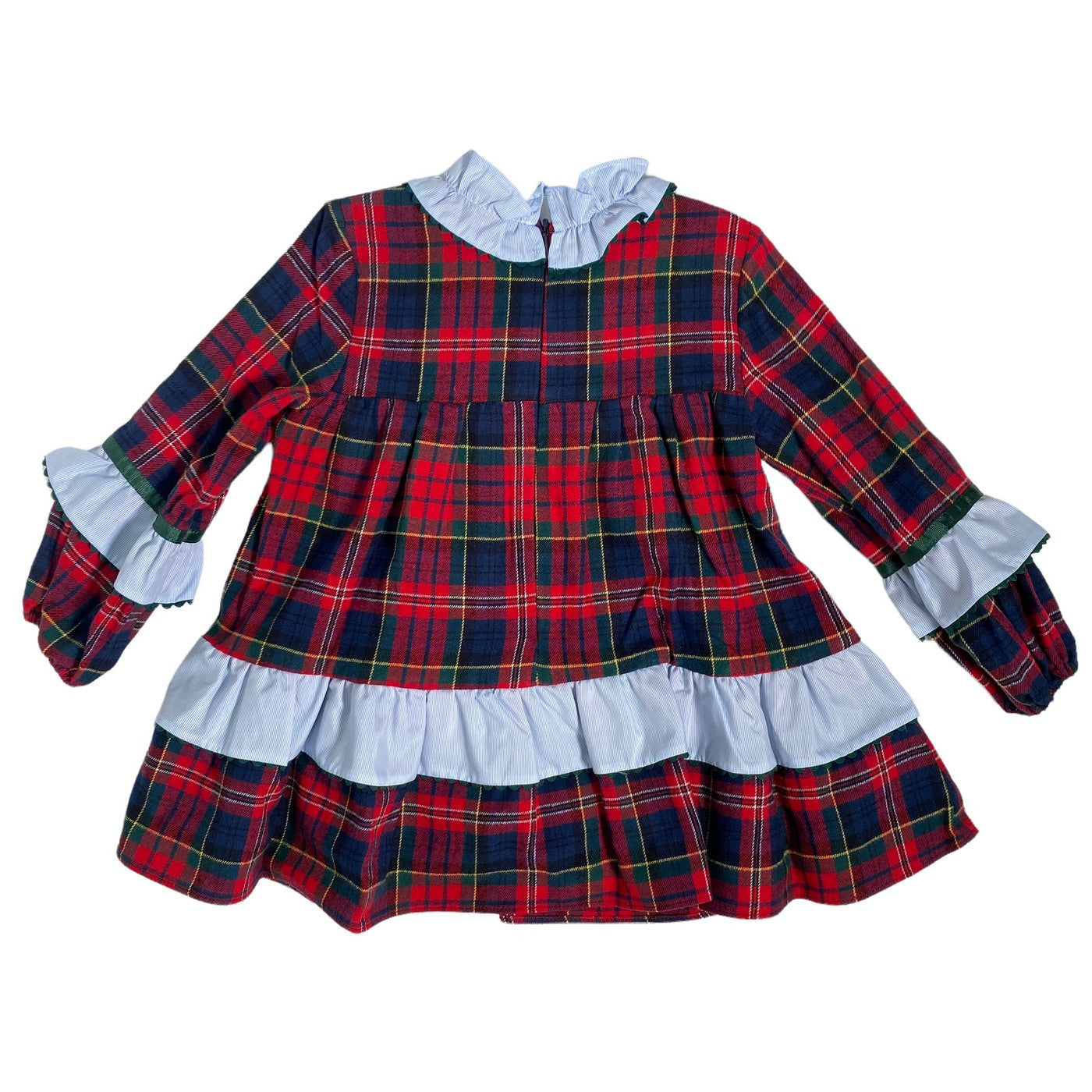 Long-sleeved flared dress in warm cotton with flounces, tartan pattern, ribbed collar.