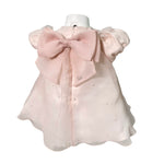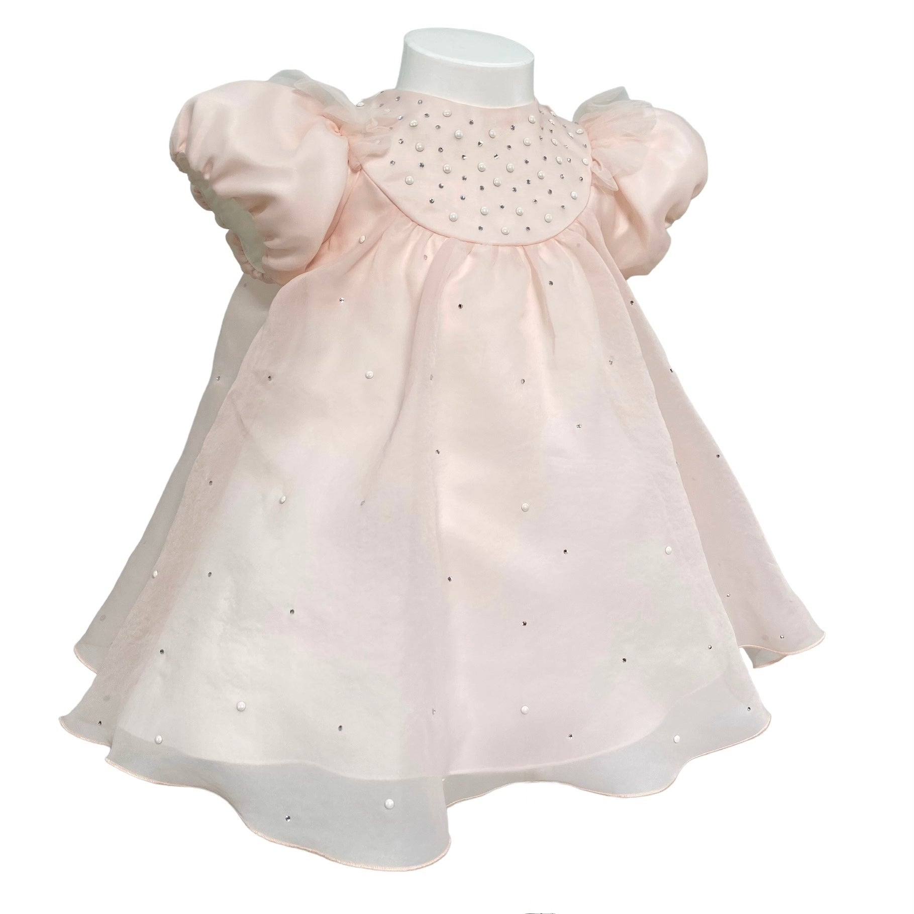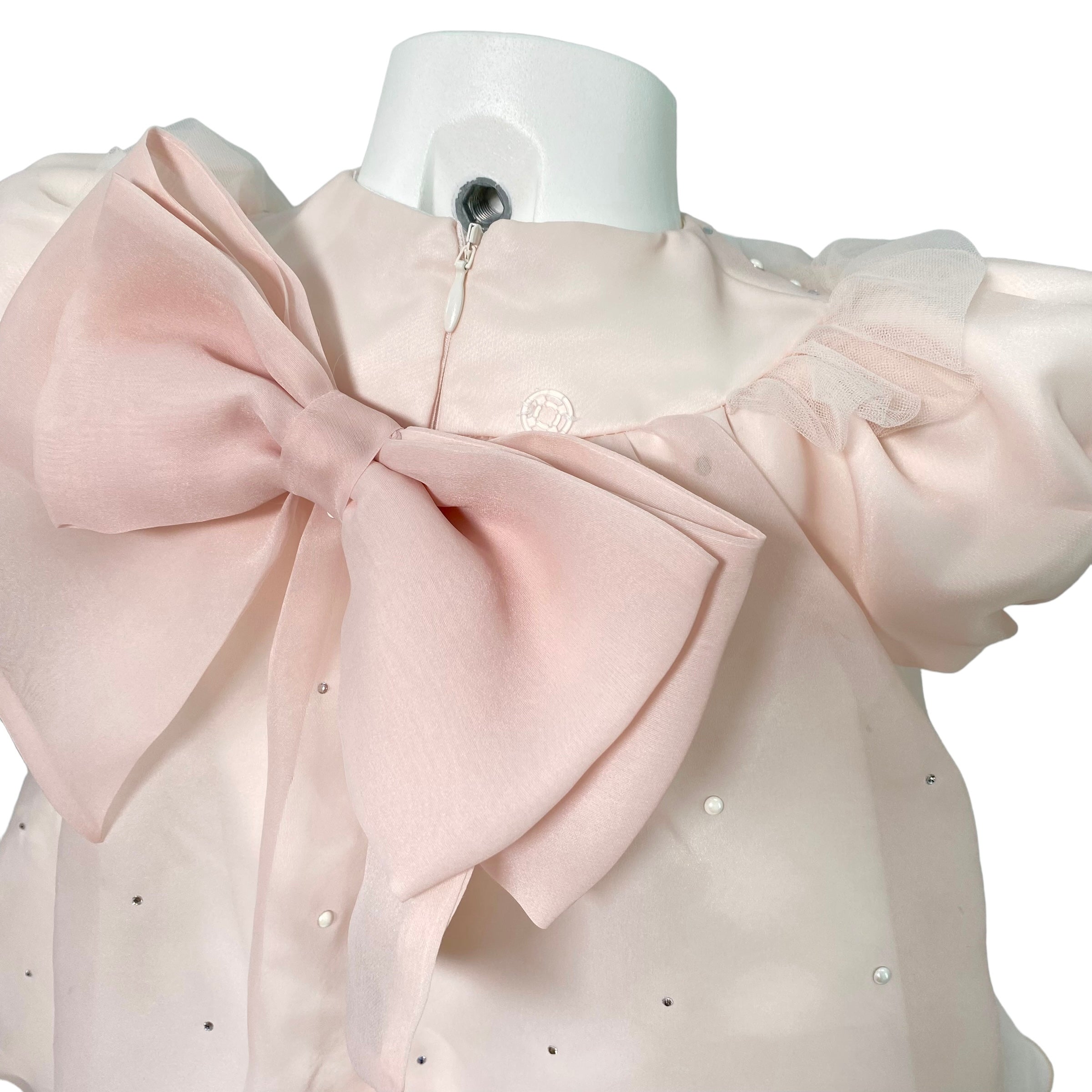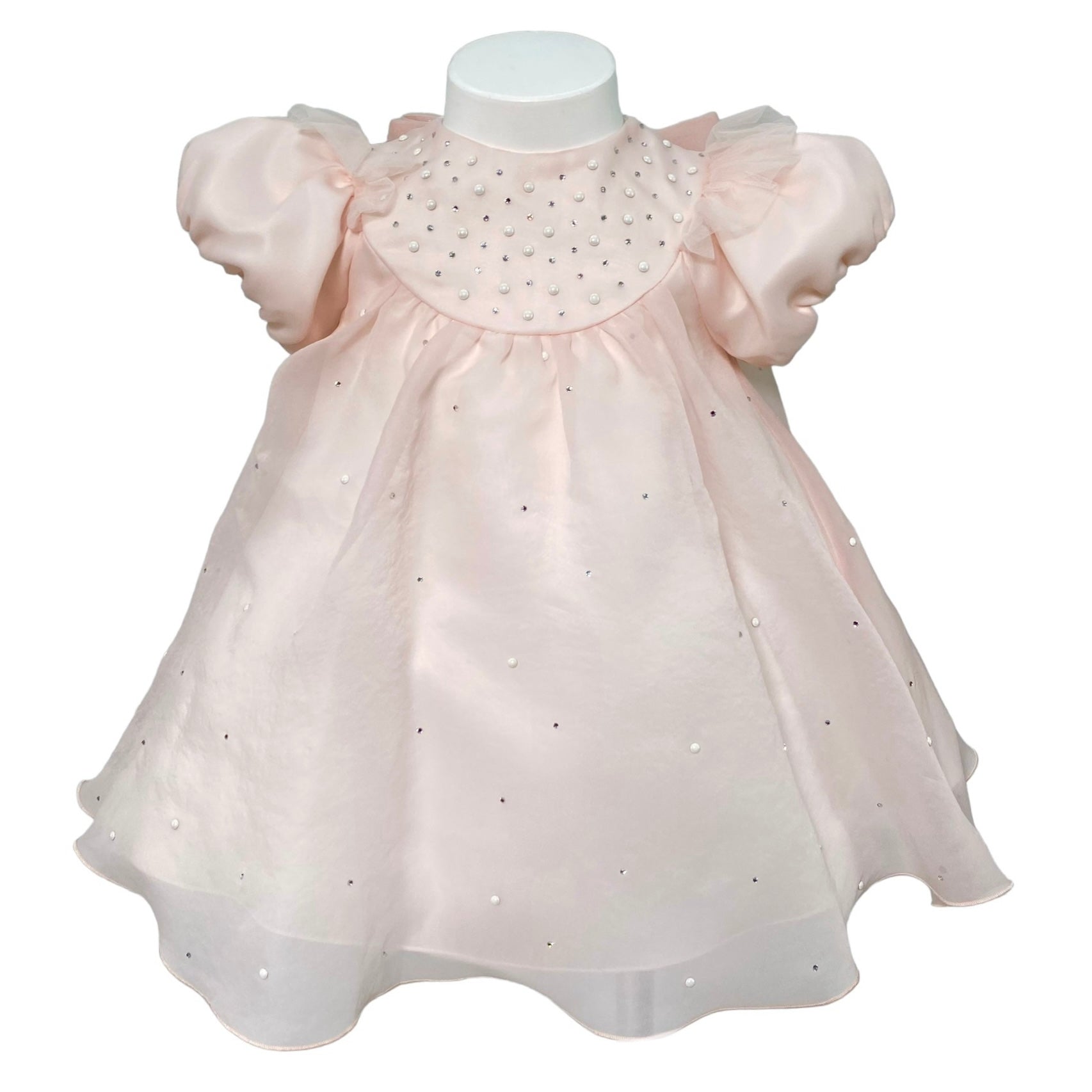 Abito svasato mezza manica in organza, tempestato di cristalli svarowsky e mezzeperle, con manica a palloncino e fioccone sul retro.