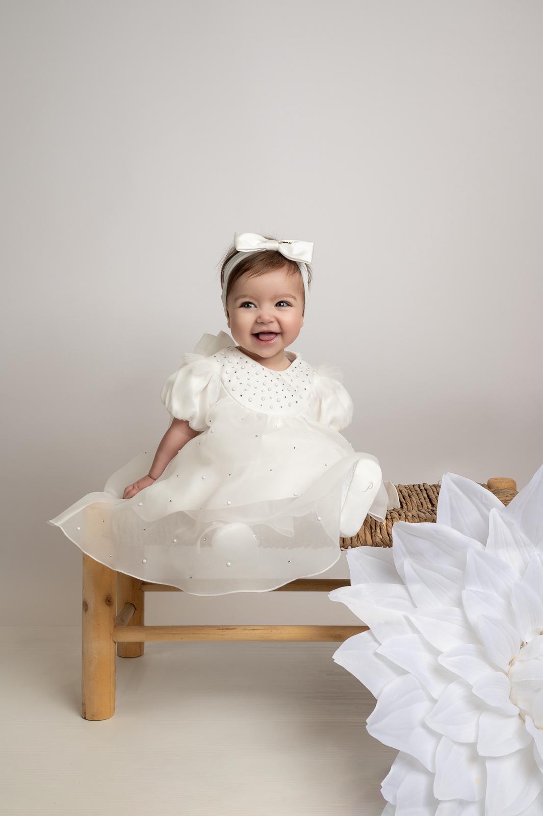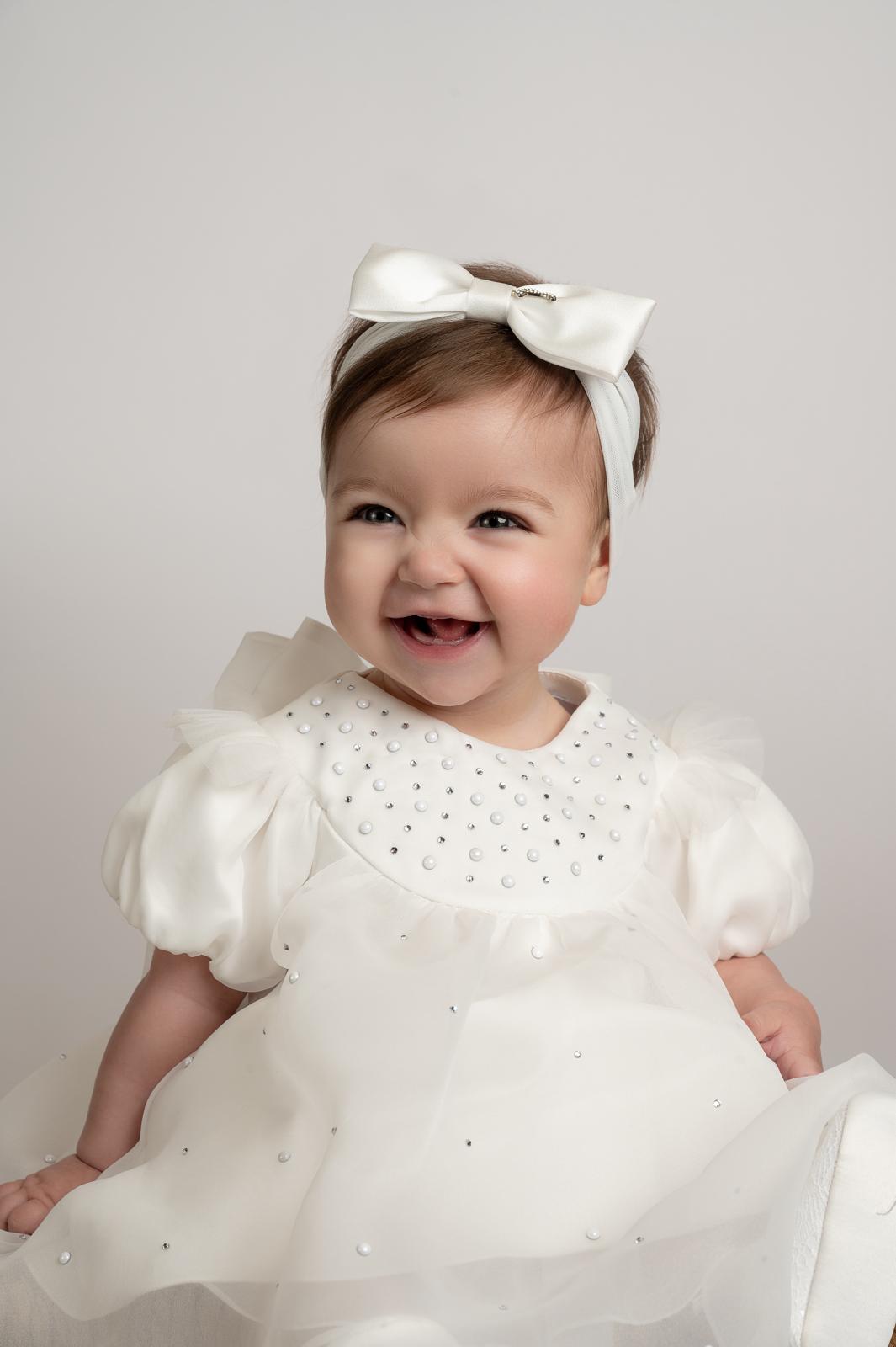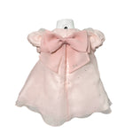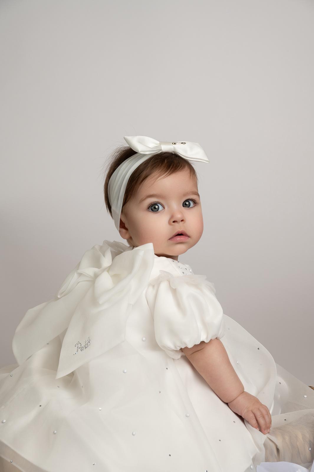 Abito svasato mezza manica in organza, tempestato di cristalli svarowsky e mezzeperle, con manica a palloncino e fioccone sul retro.