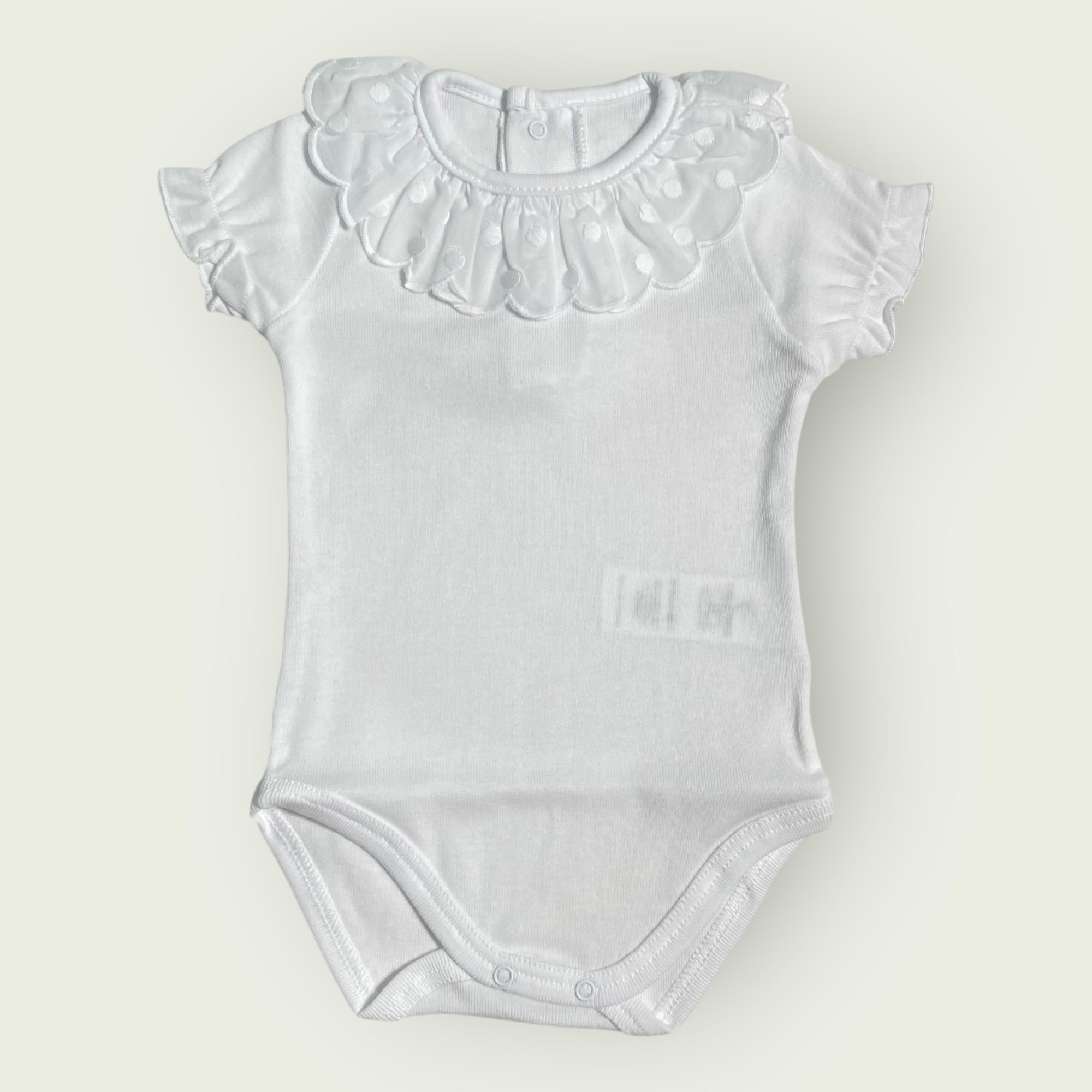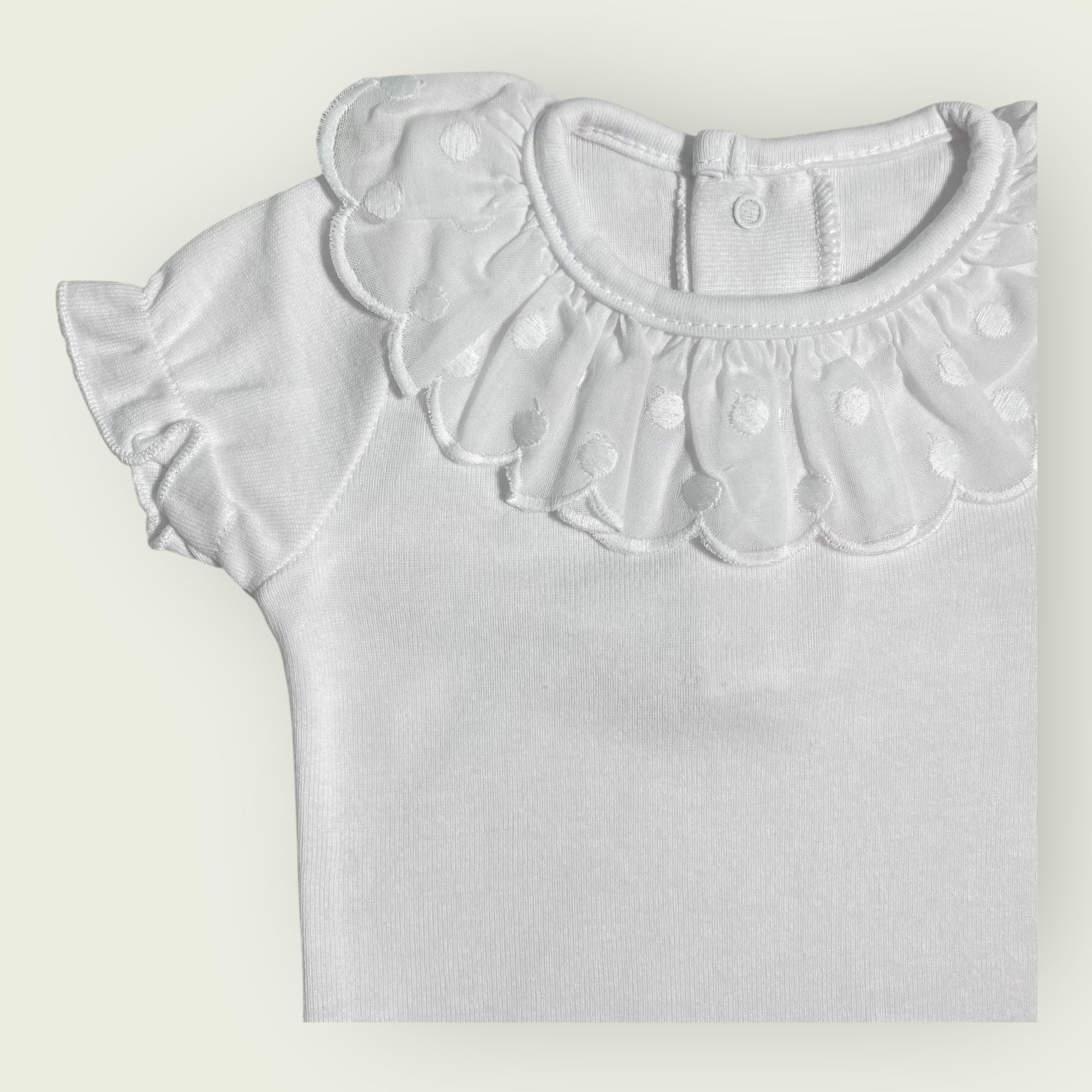 Half sleeve body in white cotton. Detail of the sleeve with the curl and a beautiful ruffle on the collar with poise.