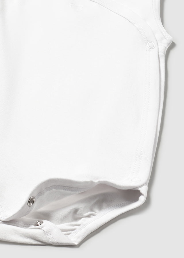 Body senza manica per neonato. Scollo incrociato e apertura laterale completa con bottoni a pressione. Chiusura con bottoni a pressione nell'interno cosce per agevolare la vestibilità. Scegliendo i nostri prodotti in cotone, supporti il nostro impegno nell'iniziativa Better Cotton.