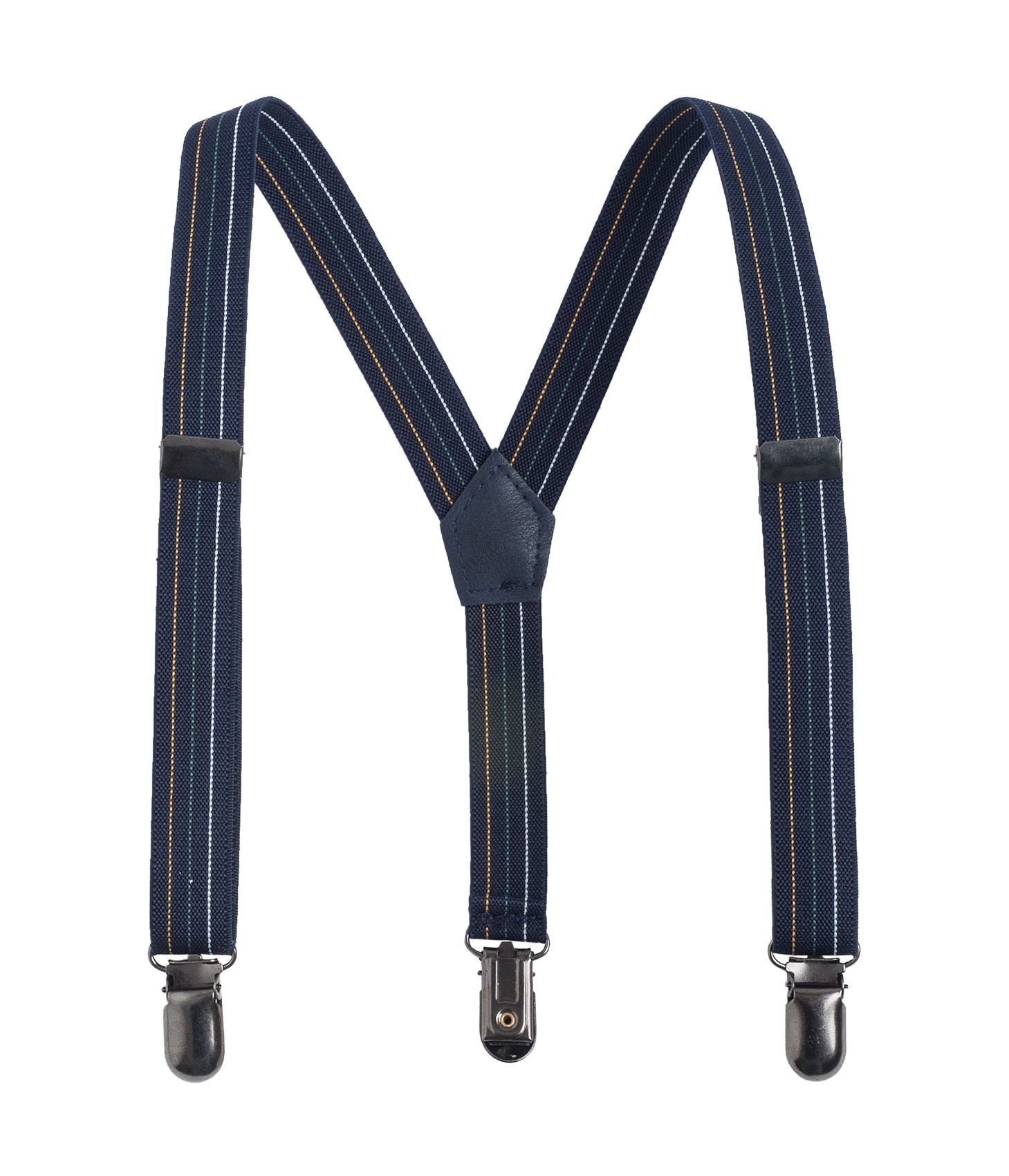 Braces in multicolored elastic fabric on a blue base.
