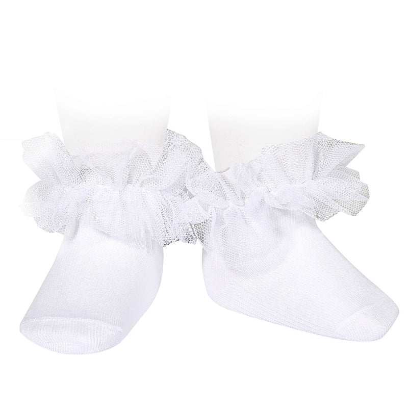 Kurze Baumwollsocken für Neugeborene mit gerafftem Tüllrand.