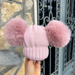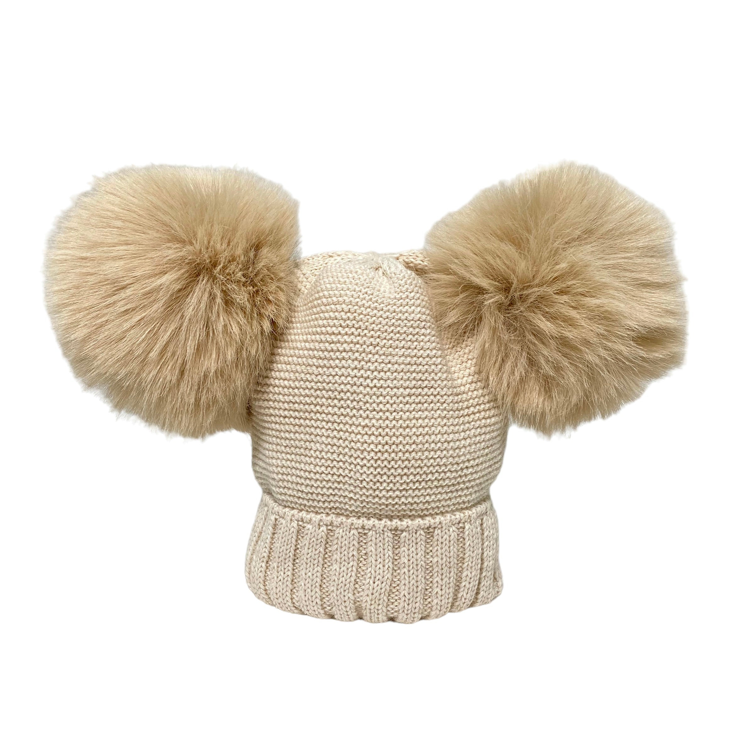 Cappello in misto lana liscio con risvolto, con doppio pom pon in ecopelliccia.