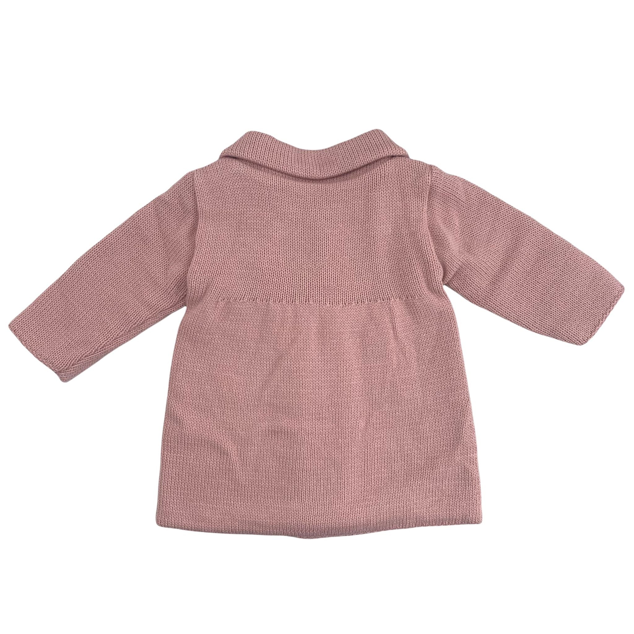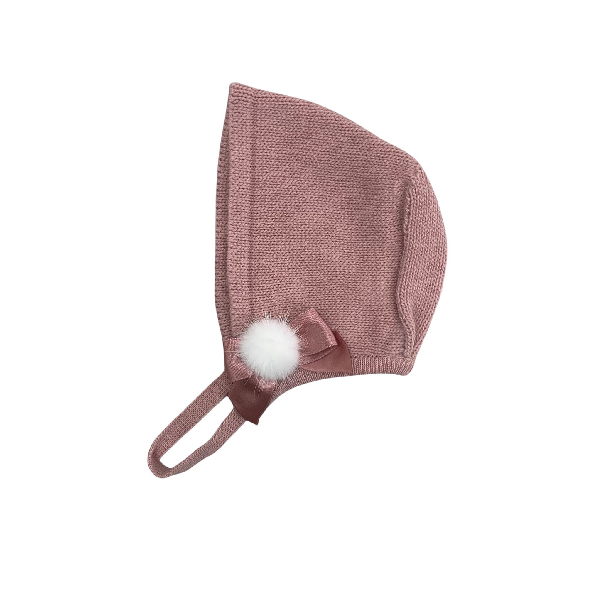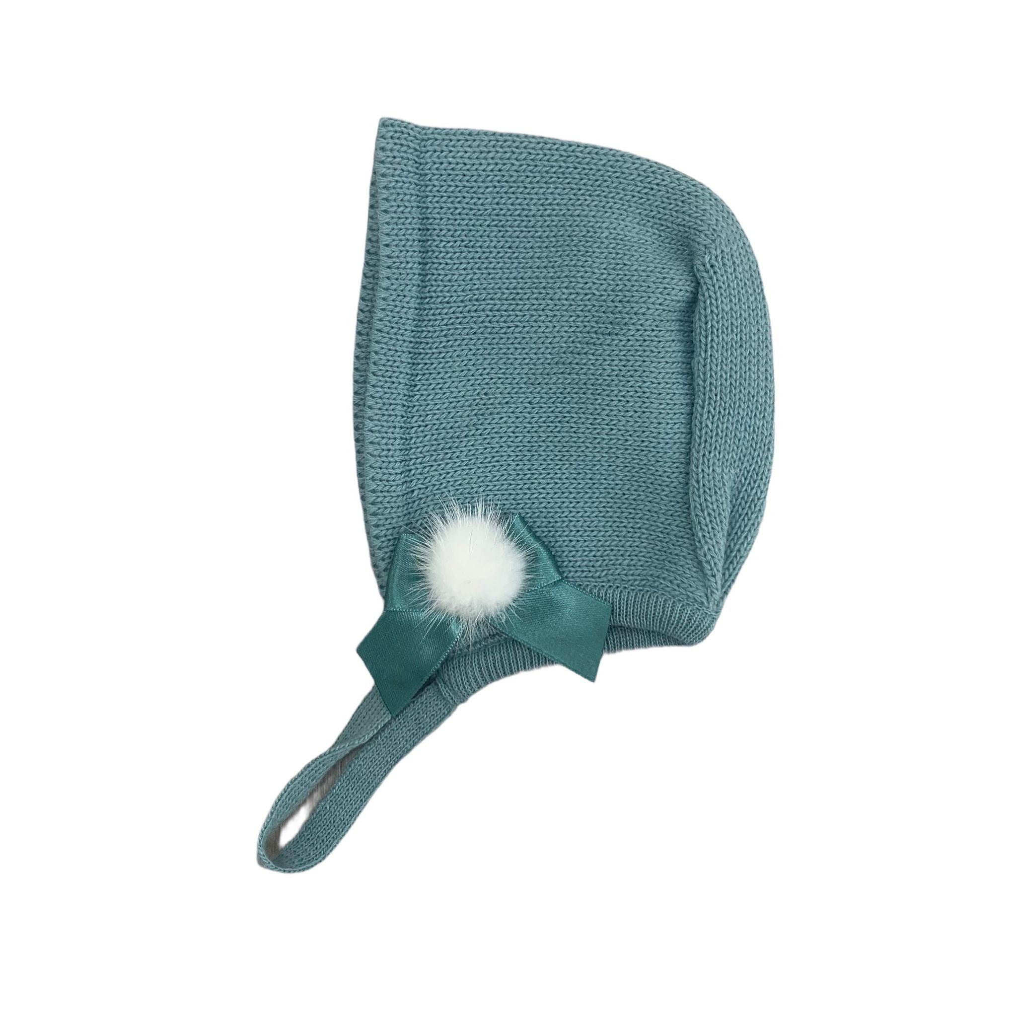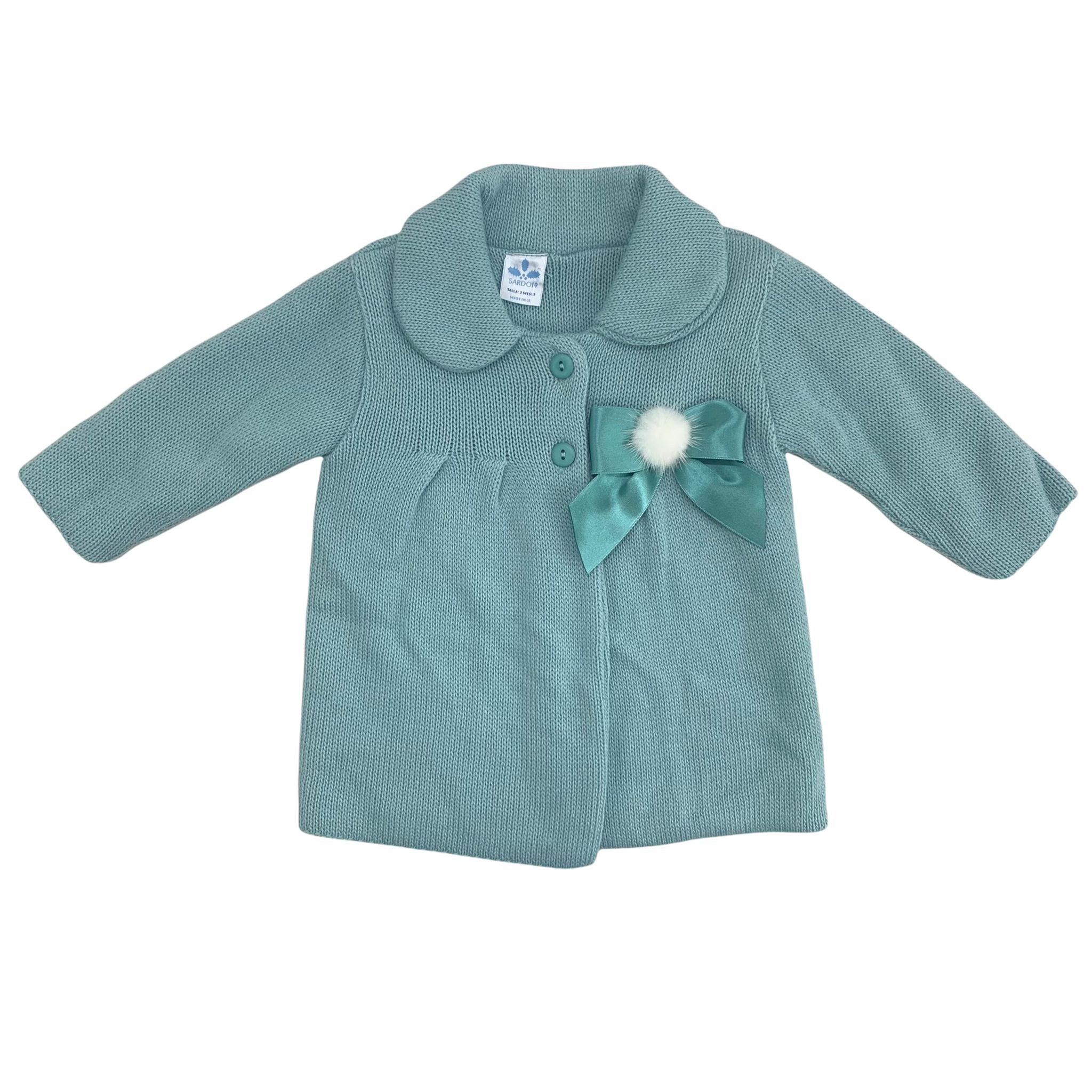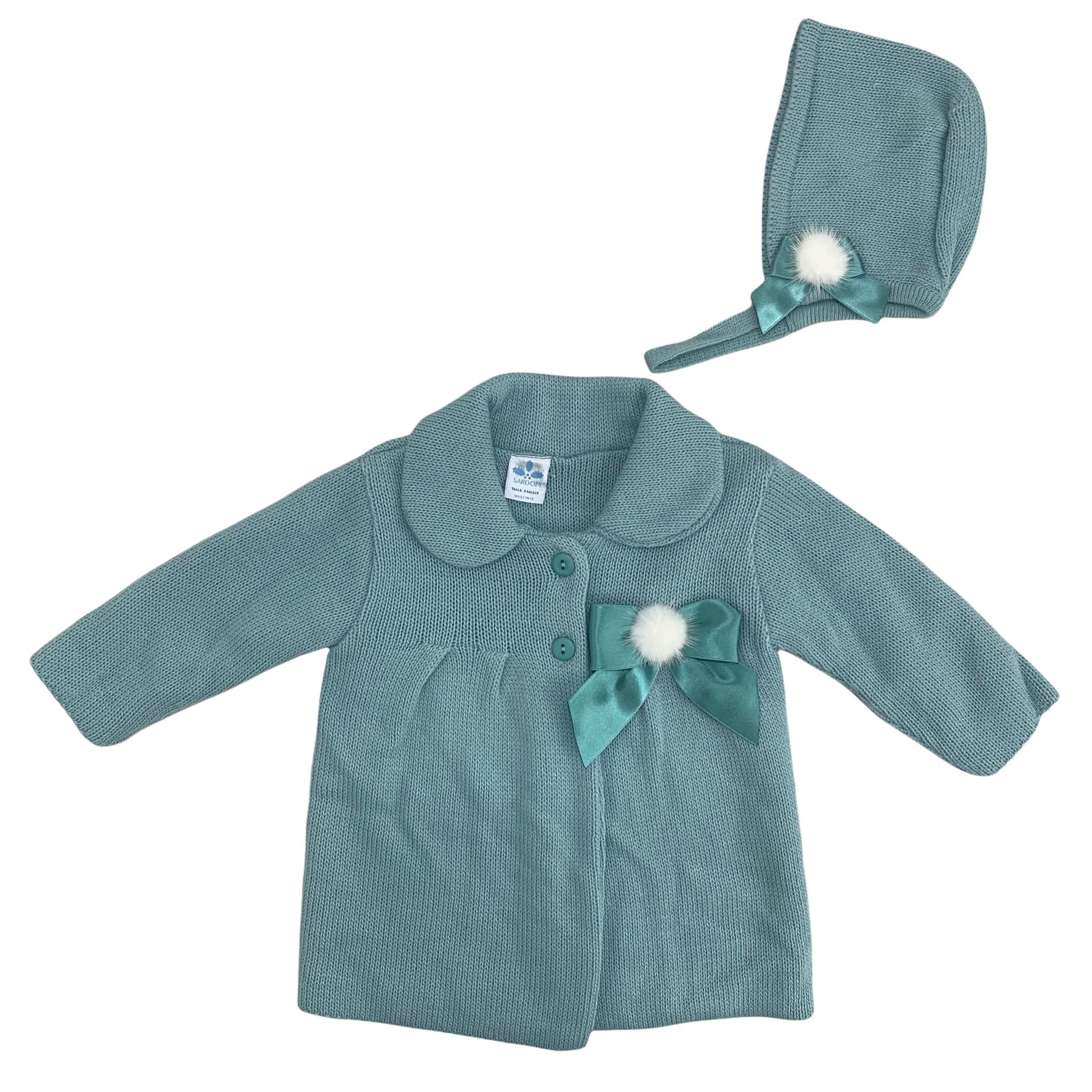 Warm cotton coat, long sleeves and collar with front closure with buttons, bow with pompon on the side and matching cap.