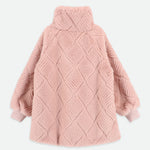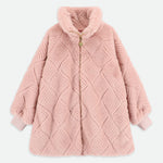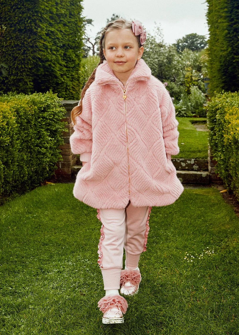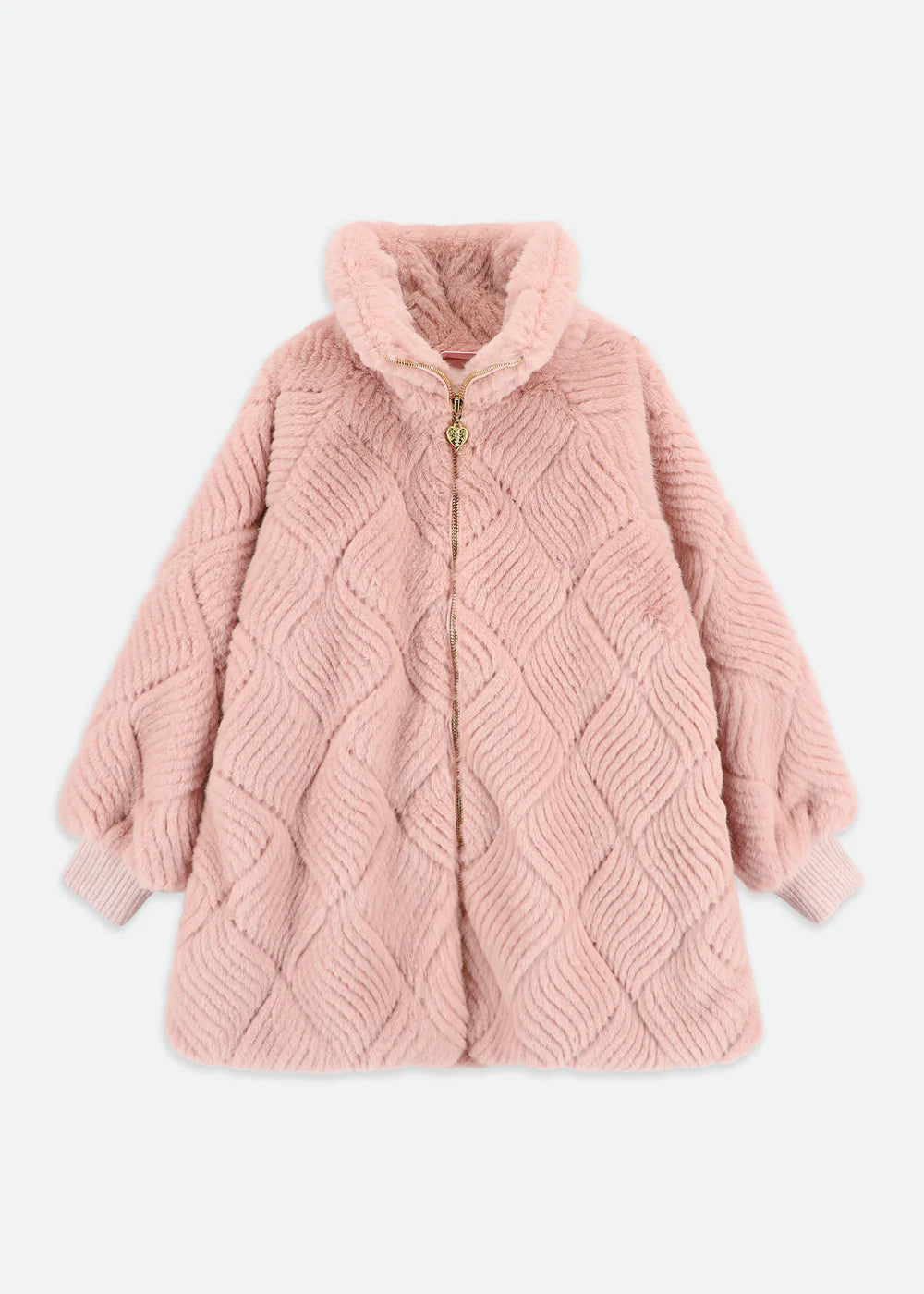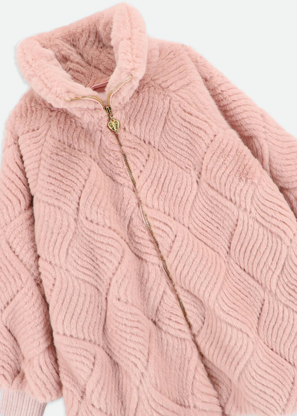 Cappotto glamour in ecopelliccia rosa con effetto intrecciato. Questa pelliccia lussuosamente morbida presenta una fodera in raso rosa. Le maniche sono rifinite con un polsino a coste in morbido velluto. Il cappotto ha un comodo collo a imbuto e tasche laterali per tenere le mani calde. La parte anteriore ha una cerniera dorata con tiretto per il fascino del volto d'angelo.