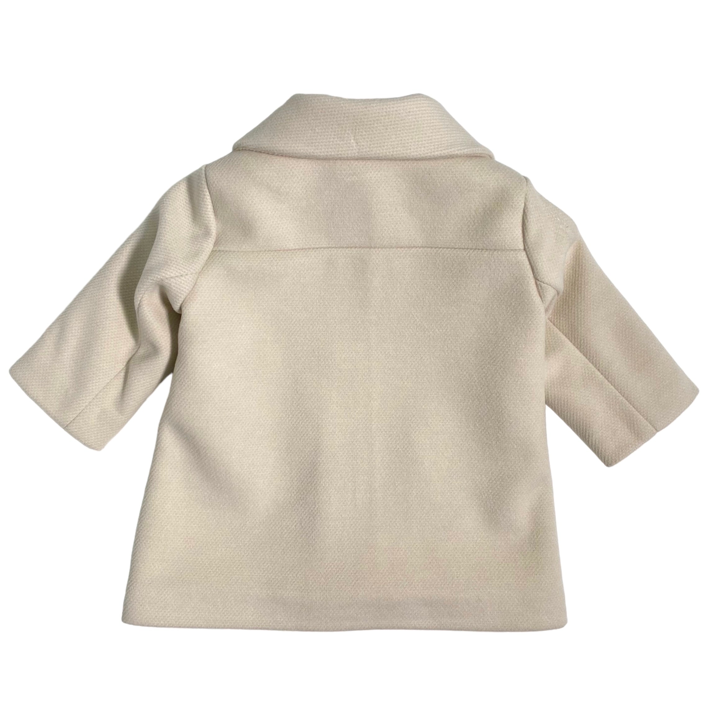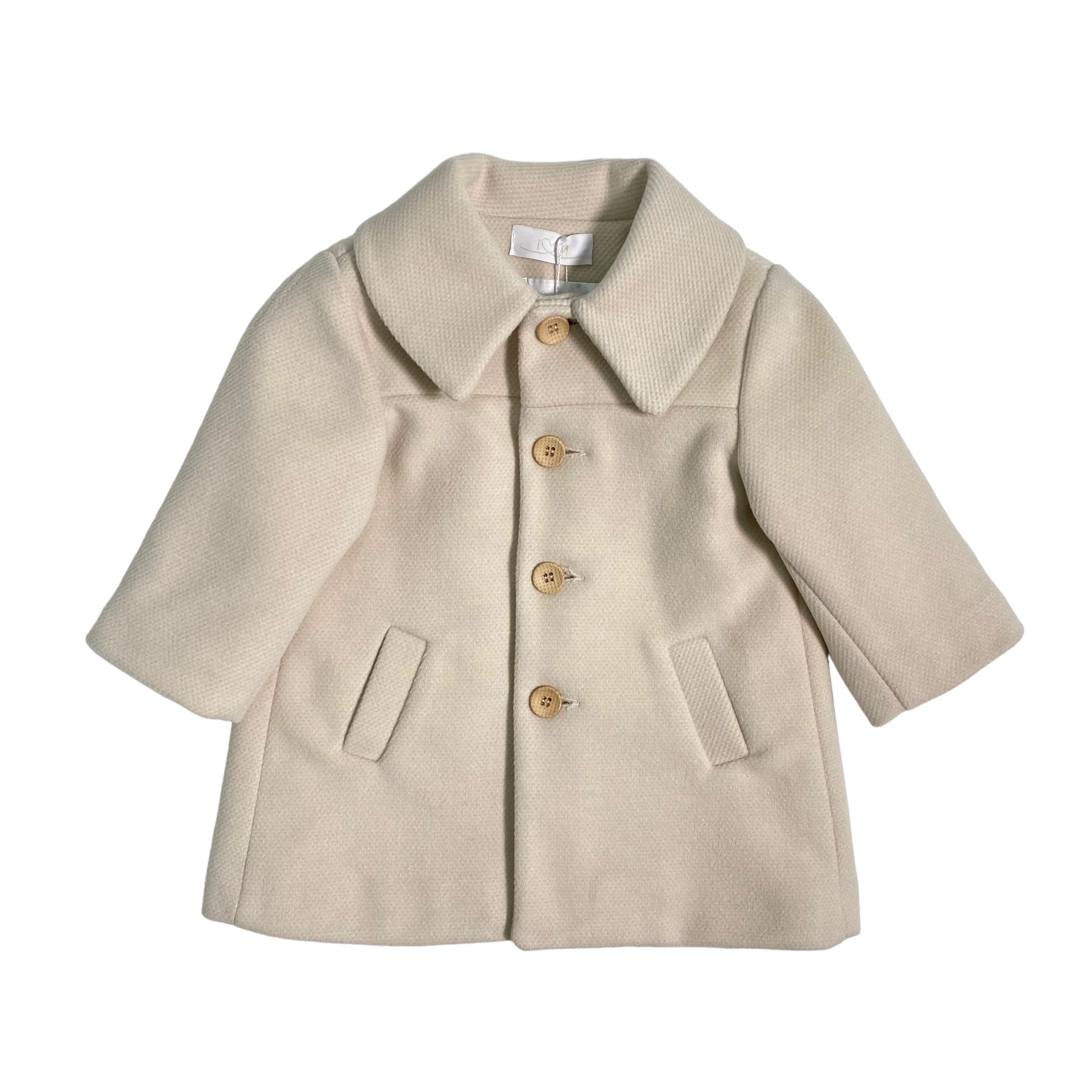 Ausgestellter Stoffmantel mit Kragen und Knopfverschluss.