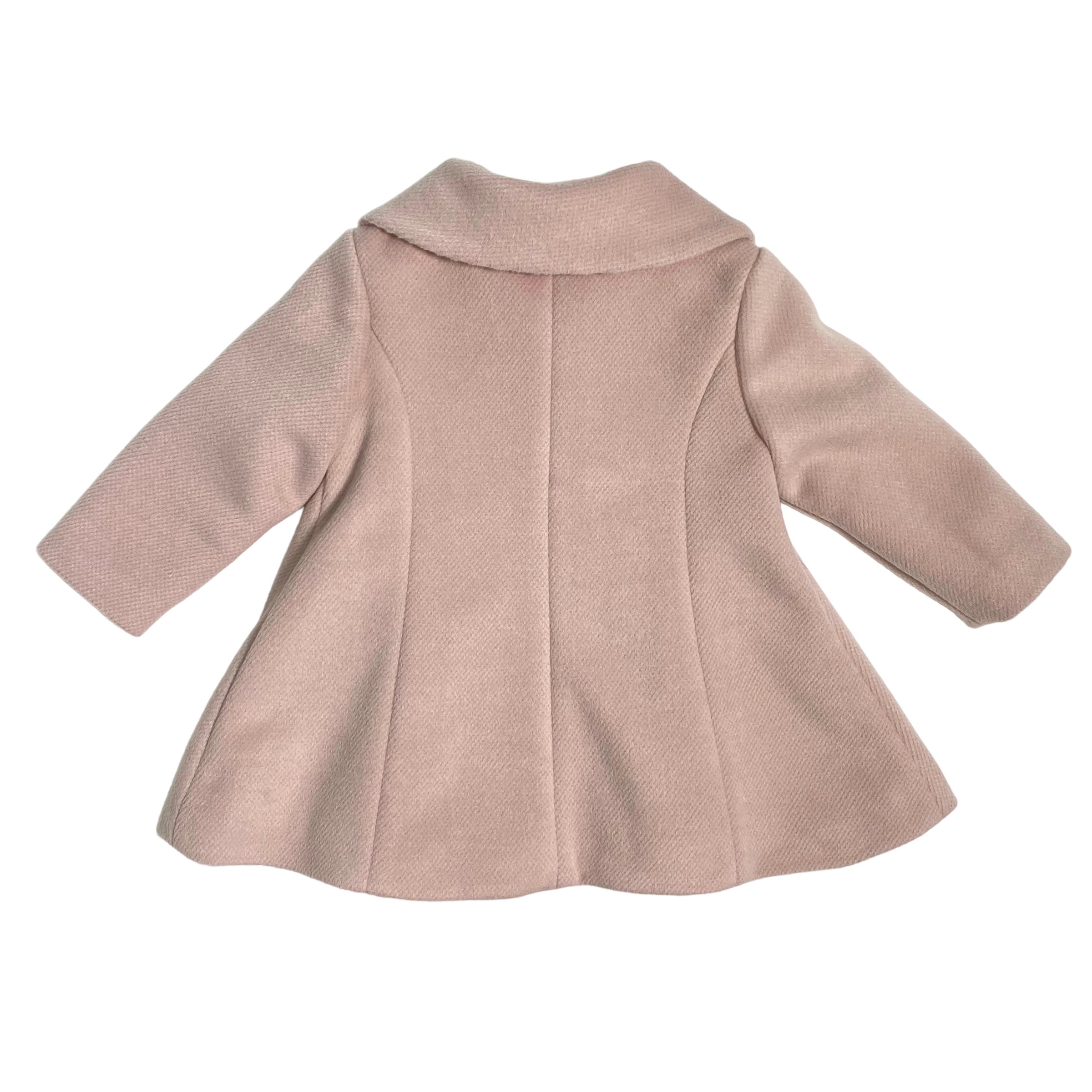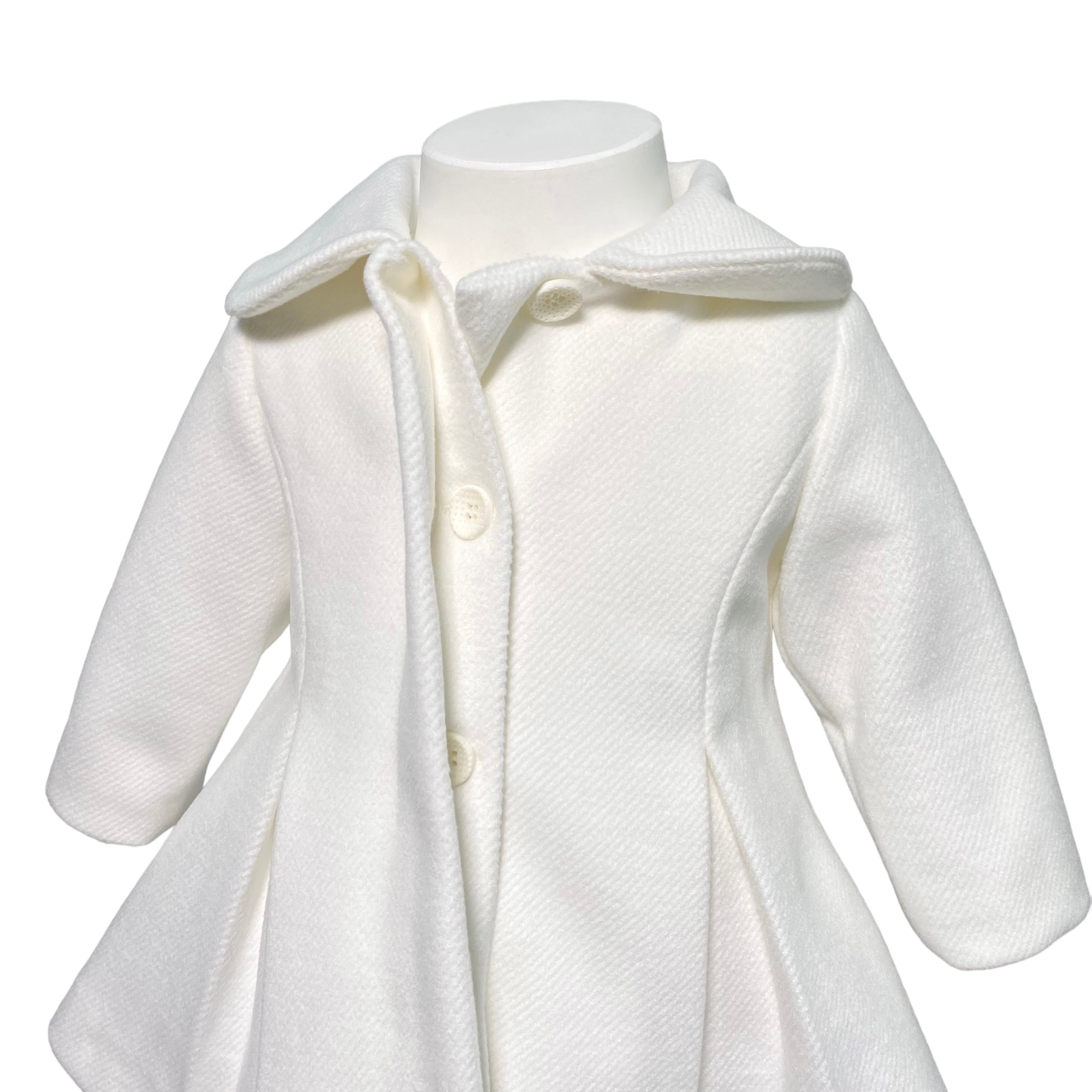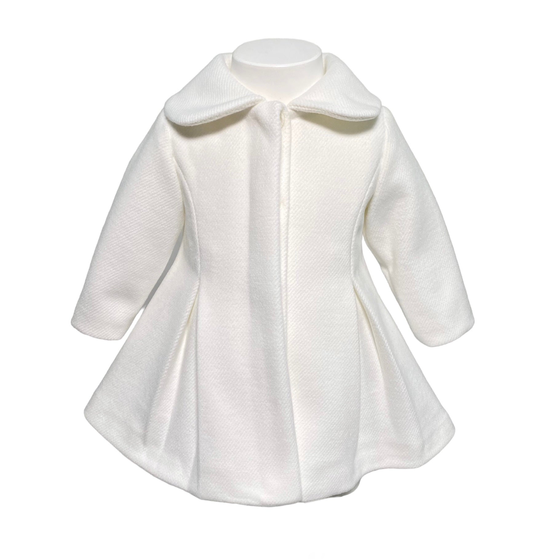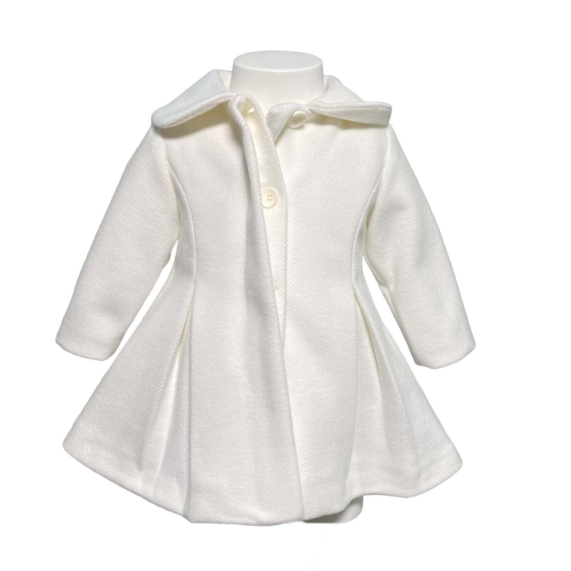 Ausgestellter Stoffmantel mit Rundkragen und Knopfverschluss.