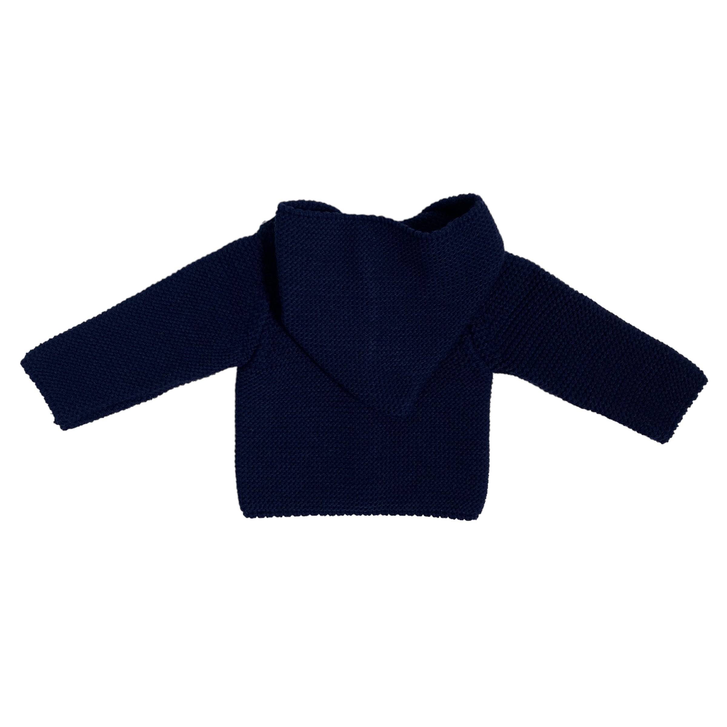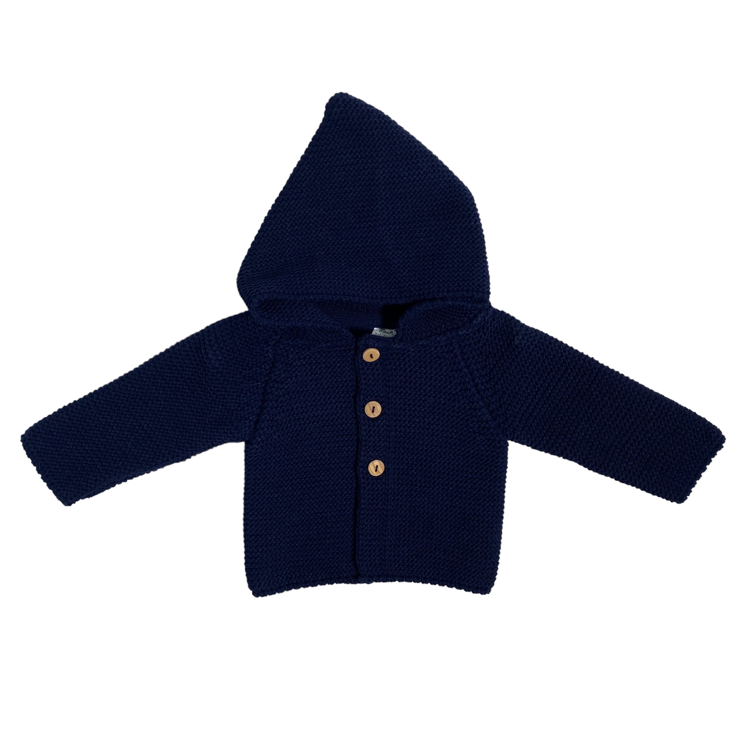 Strickjacke mit Kapuze, aus hypoallergenem Acrylstoff, mit Verschluss mit Holzknöpfen.