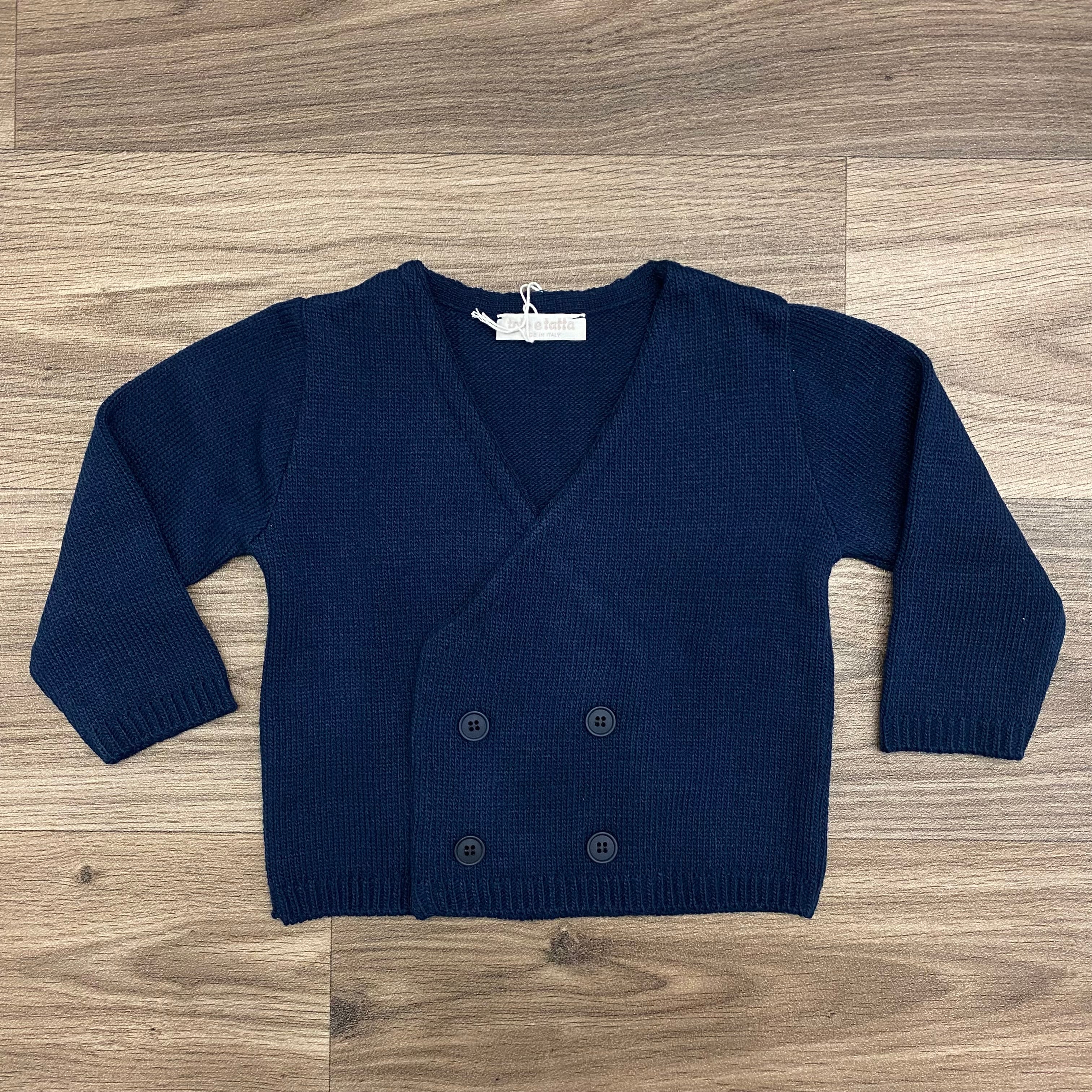 Esclusivo cardigan doppiopetto per neonato, realizzato in tessuto anallergico e resistente all'usura. Ideale per proteggere il tuo bambino dagli agenti esterni, garantendo allo stesso tempo un look elegante e raffinato. Il tessuto in morbida lana acrilica assicura comfort e benessere nella pelle sensibile dei neonati.