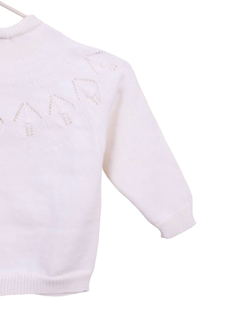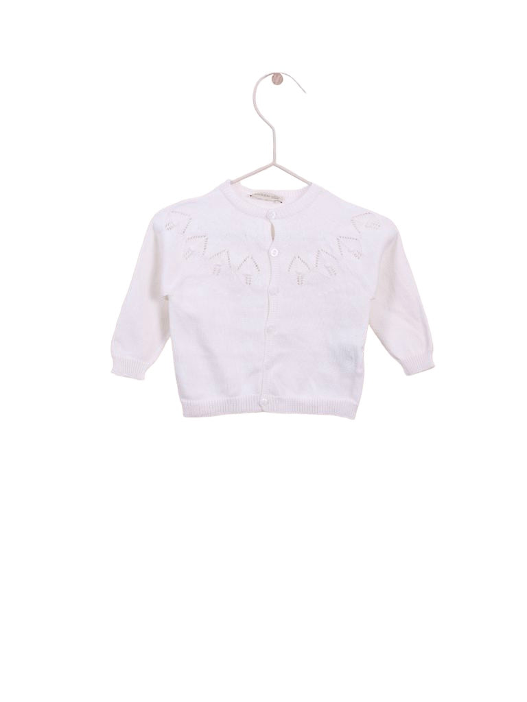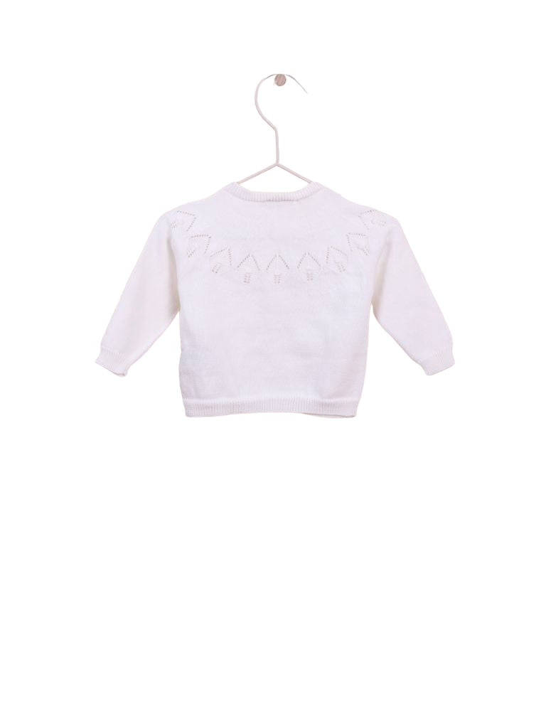 Einfarbiger Cardigan aus Baumwollgarn in Creme mit rautenförmigen Perforationen auf der Brust.