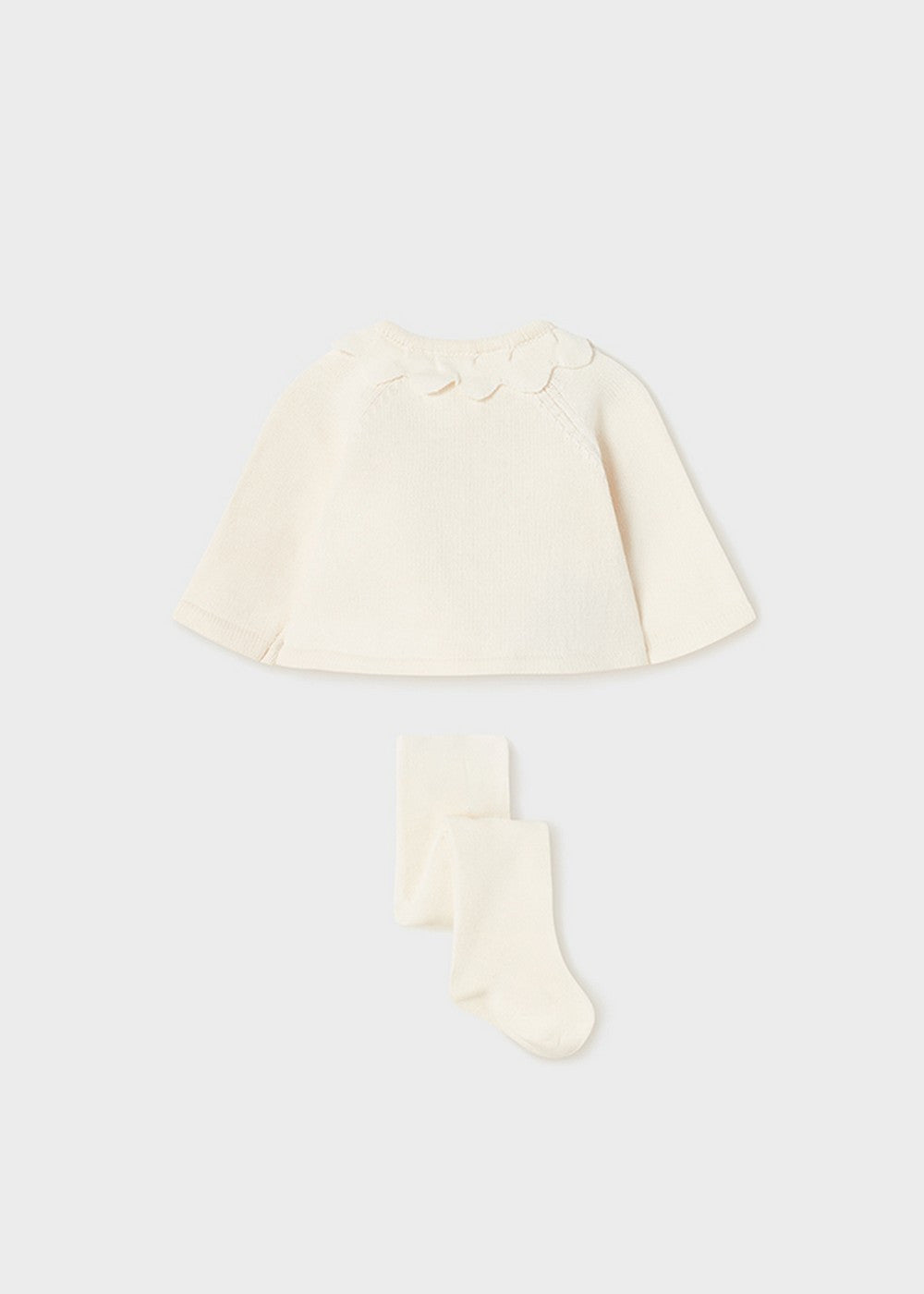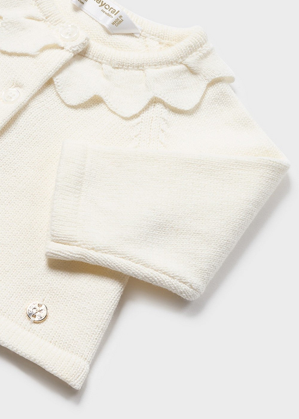 ECOFRIENDS garment contains organic cotton. Long sleeve cardigan for newborn. Round neck with ruffles. Button closure in the front.