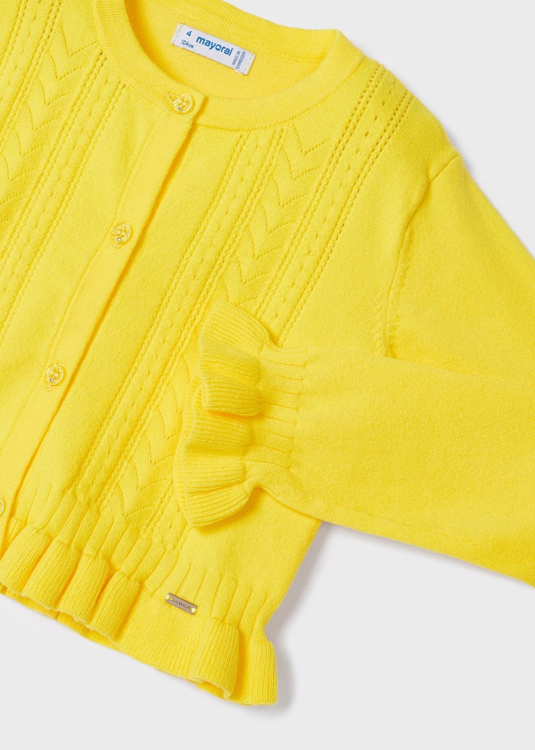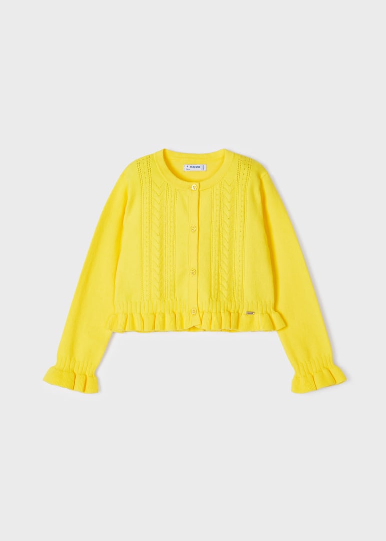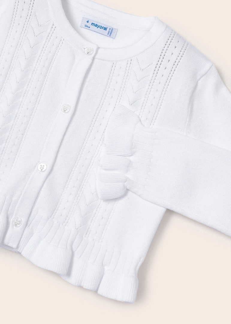 Capo ECOFRIENDS enthält Bio-Baumwolle. Langarm-Cardigan für Mädchen mit Rüschen am Ärmelrand. Rundhalsausschnitt. Knopfverschluss vorne. Weicher Trikotstoff.