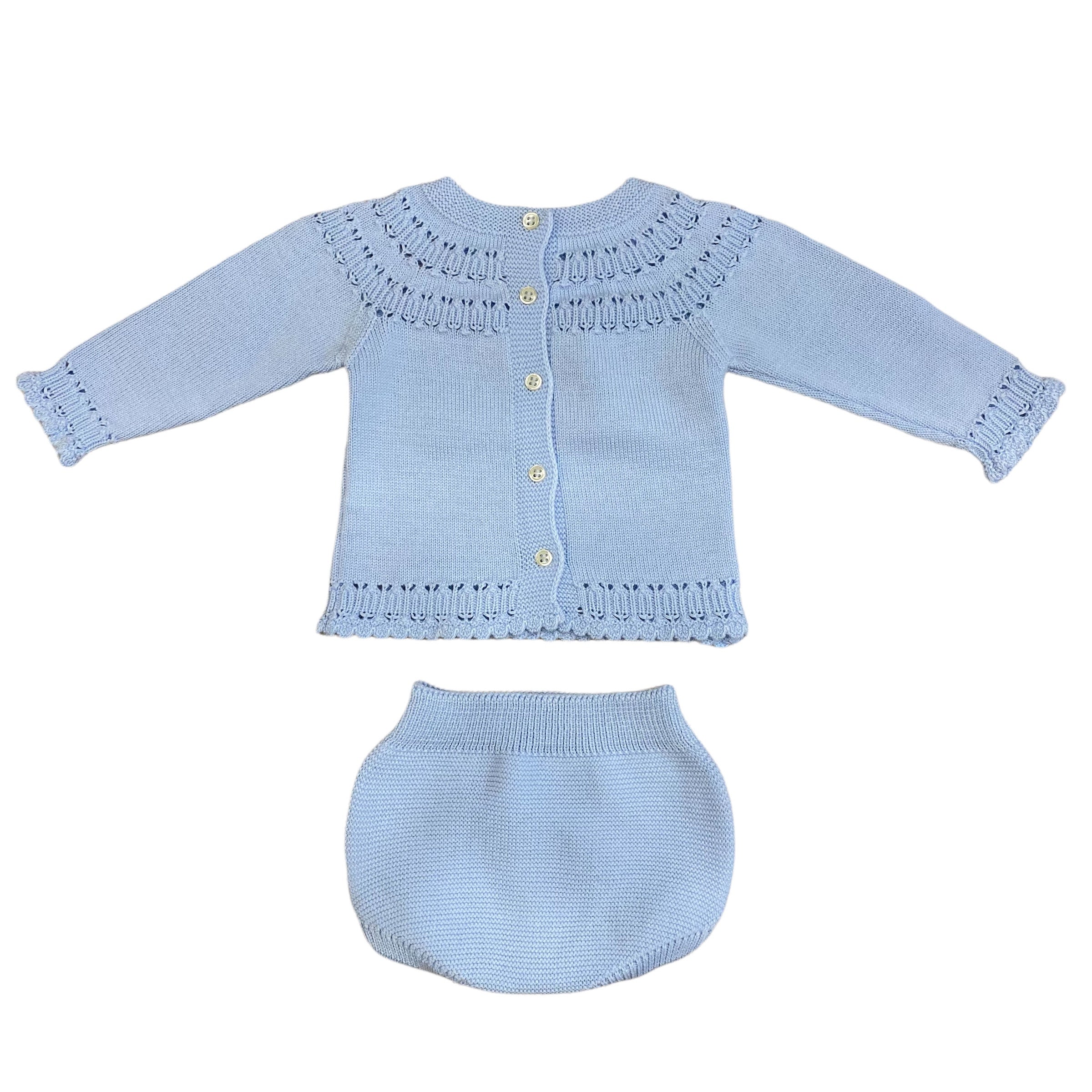 Long-sleeved suit in light blue yarn. The upper part is embellished with embroidery around the collar and lace embroidery on the edges of the sleeves and on the underside of the shirt.