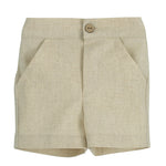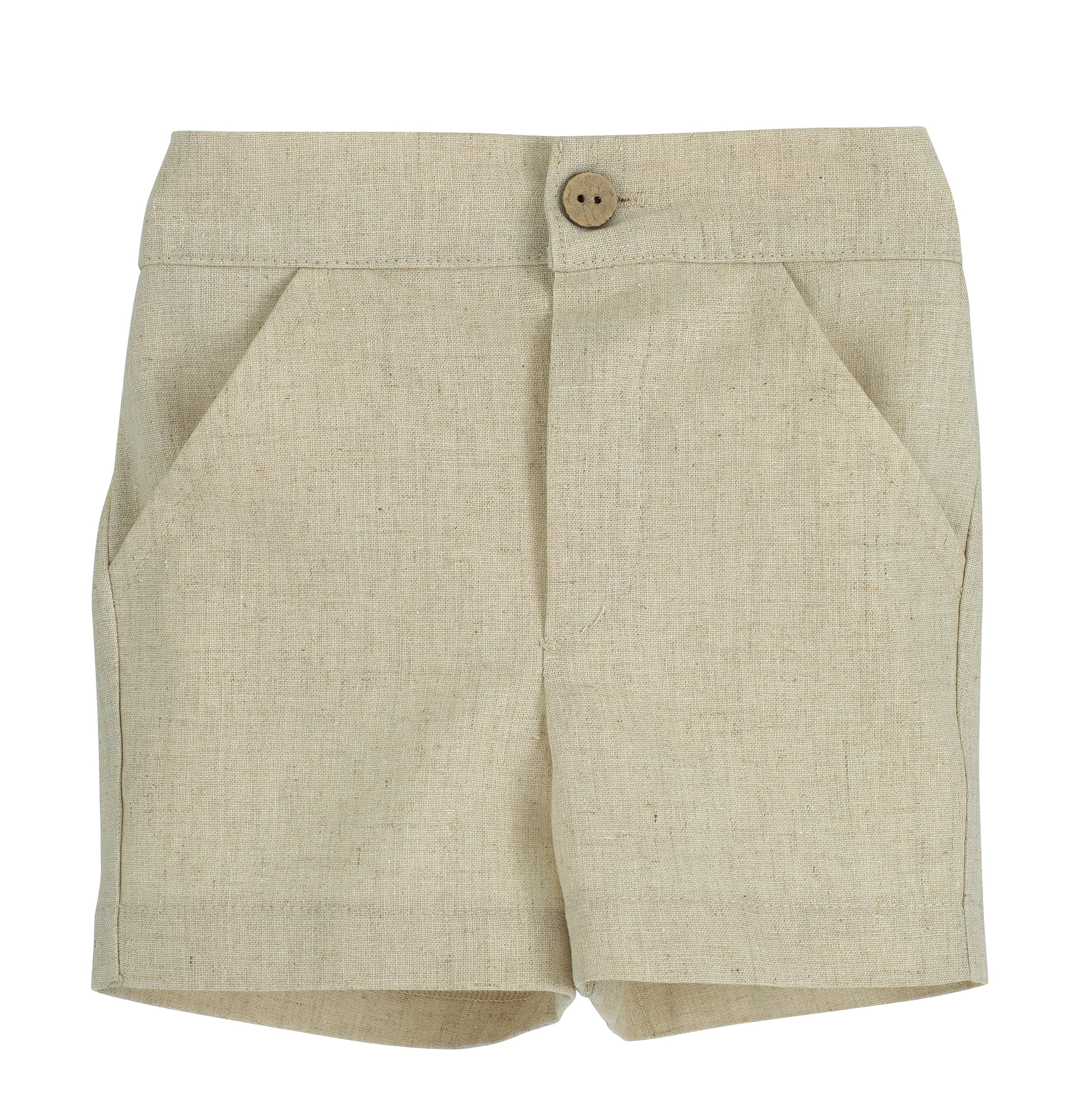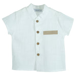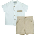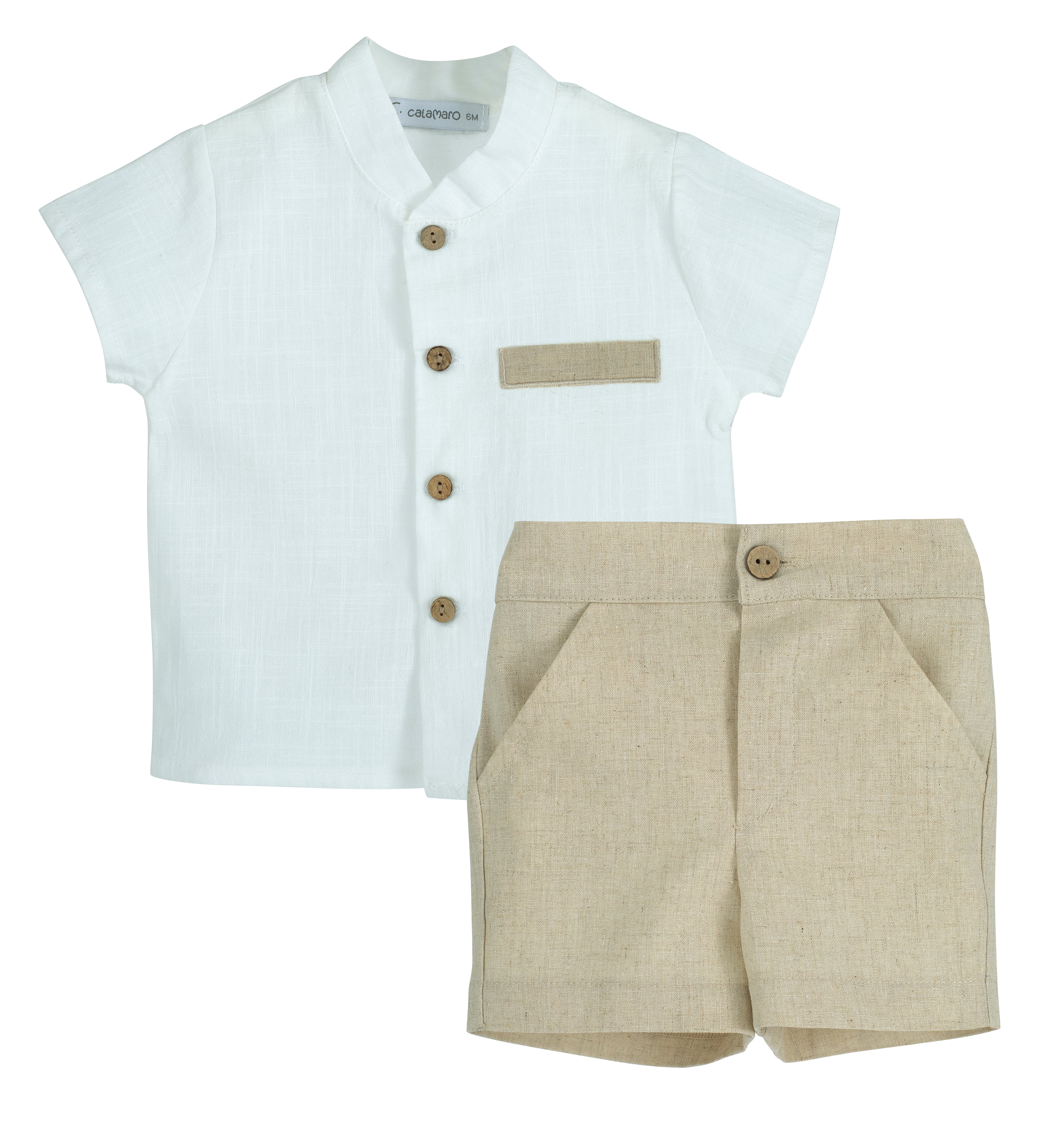 Questo completo 2 pezzi in misto lino di CALAMARO offre comfort e stile al tuo bambino. La camicia mezza manica in cotone fiammato bianco ha una chiusura di bottoni in legno e un dettaglio di taschino beige, mentre il bermuda beige in misto lino con elastico sul retro e bottone in legno garantisce una perfetta vestibilità.