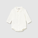 Body manica lunga per neonato con polsini con bottoni. Colletto modello camicia. Chiusura con bottoni a pressione nell'interno cosce per agevolare la vestibilità. Chiusura con bottoni nella parte anteriore.