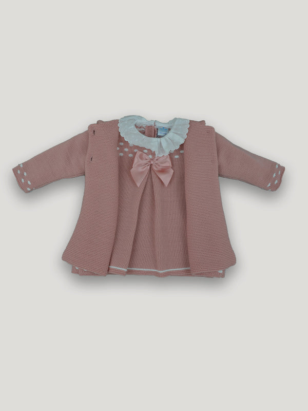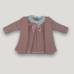 Questo completo per neonata è perfetto per un'occasione speciale grazie alla sua eleganza e alla moda. Realizzato in tessuto anallergico acrilico, l'abito presenta un bellissimo colletto rouche ricamato, mentre il cappotto abbinato svasato completa il look perfetto per una neonata chic.