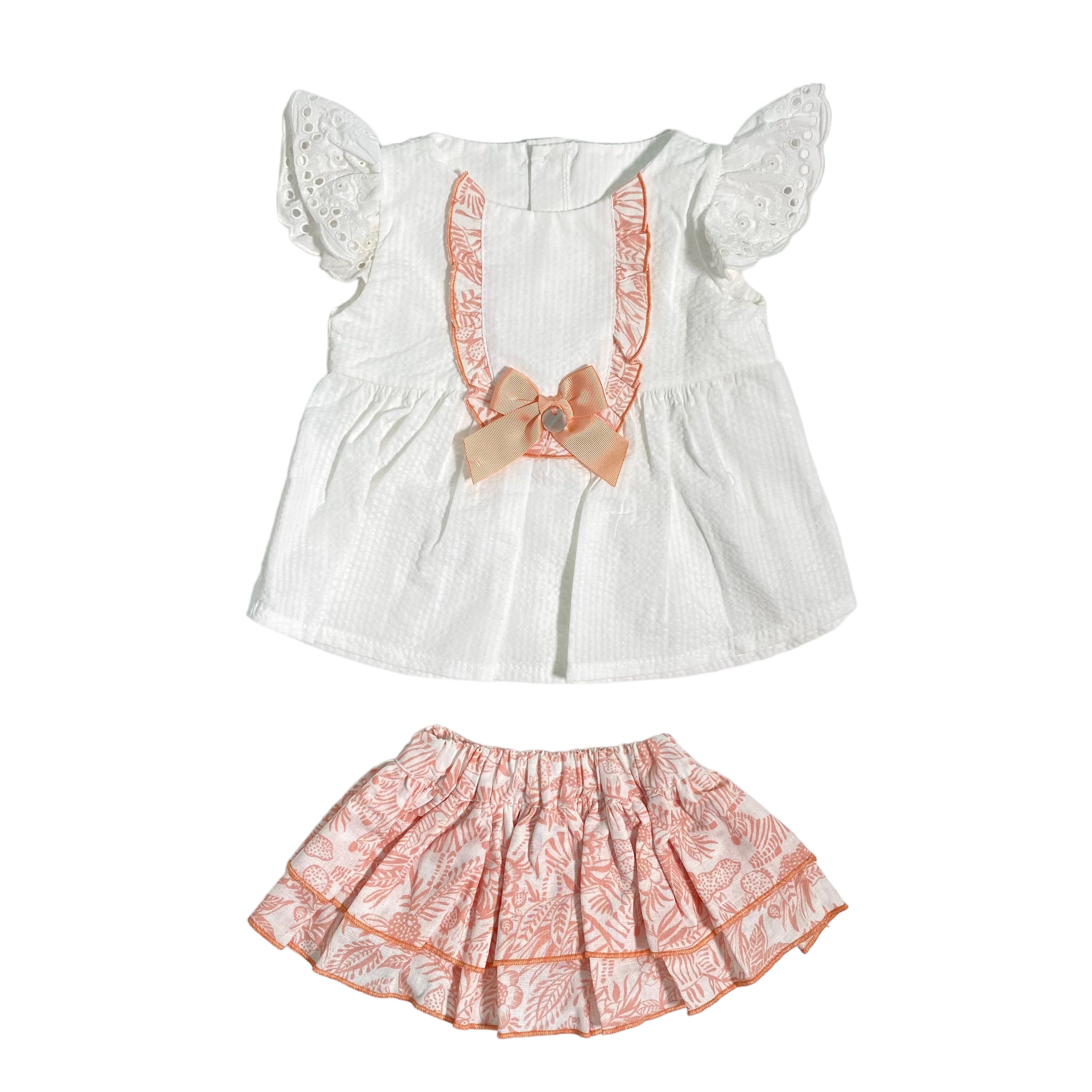 -Baumwollbluse mit Flügelärmeln aus San-Gallo-Spitze, Details und lachsfarbener Schleife vorne, Verschluss hinten mit Knöpfen