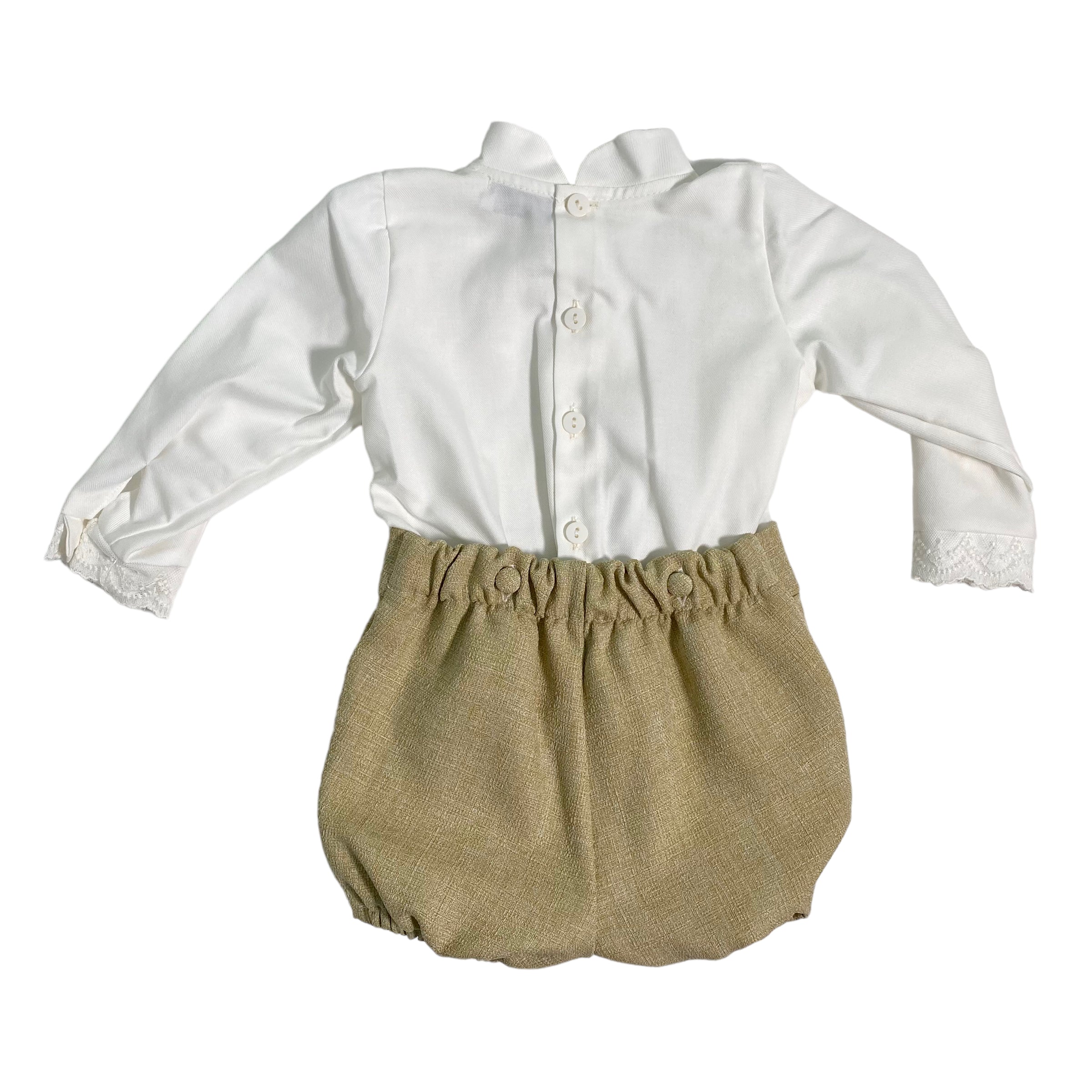 - kurze Bermudashorts aus warmer Baumwolle mit Stoff in Canvas-Optik (innen gefüttert), Gummizug an der Rückseite des Beins und an der Rückseite der Taille, abgerundet mit Knöpfen am Bund.