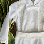 - Langärmliges Hemd aus warmer Baumwolle, koreanischer Kragen, im Mittelteil mit Spitzenband verziert, Manschetten ebenfalls mit Spitze versehen, Verschluss auf der Rückseite mit Knöpfen