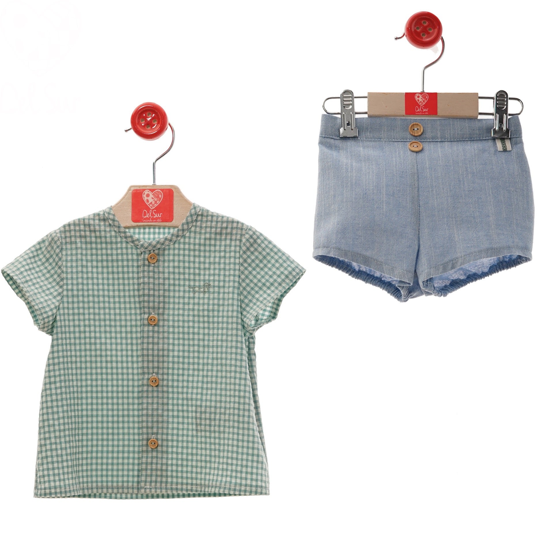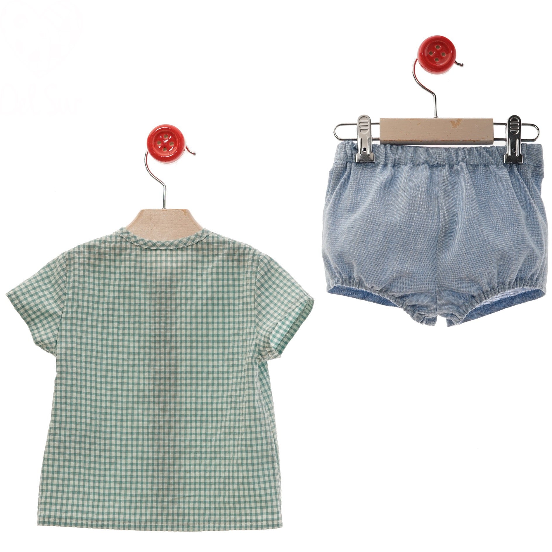 Questo completo per neonato è perfetto per occasioni casual e eleganti. Include una camicia mezza manica a quadretti con bottoncini effetto legno e un bermuda in denim. Realizzato con la massima qualità per un look comodo e alla moda.
