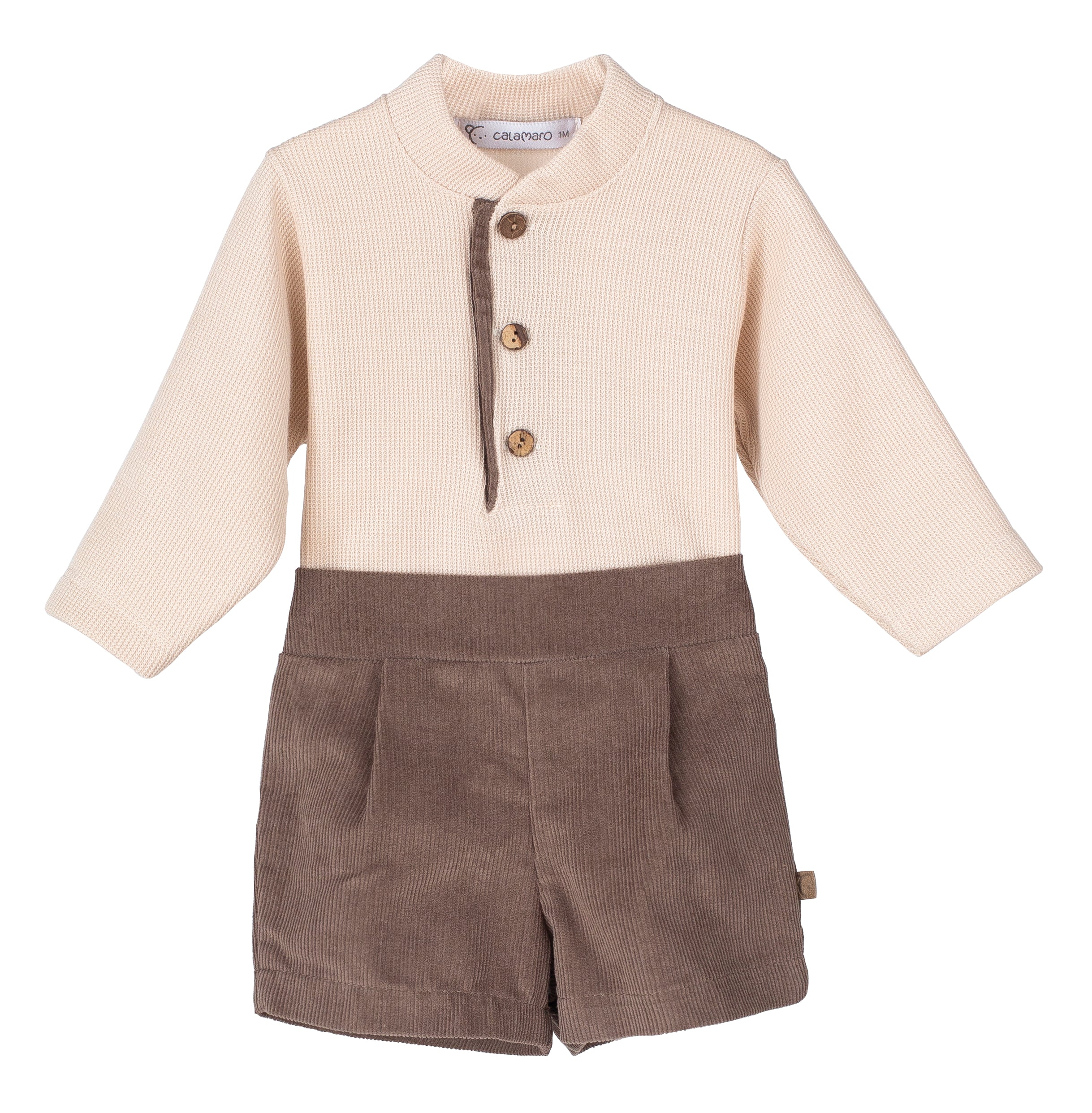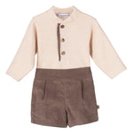 Set bestehend aus einfarbigen braunen Samtshorts und einem beigen Baumwollpullover mit Holzknöpfen.