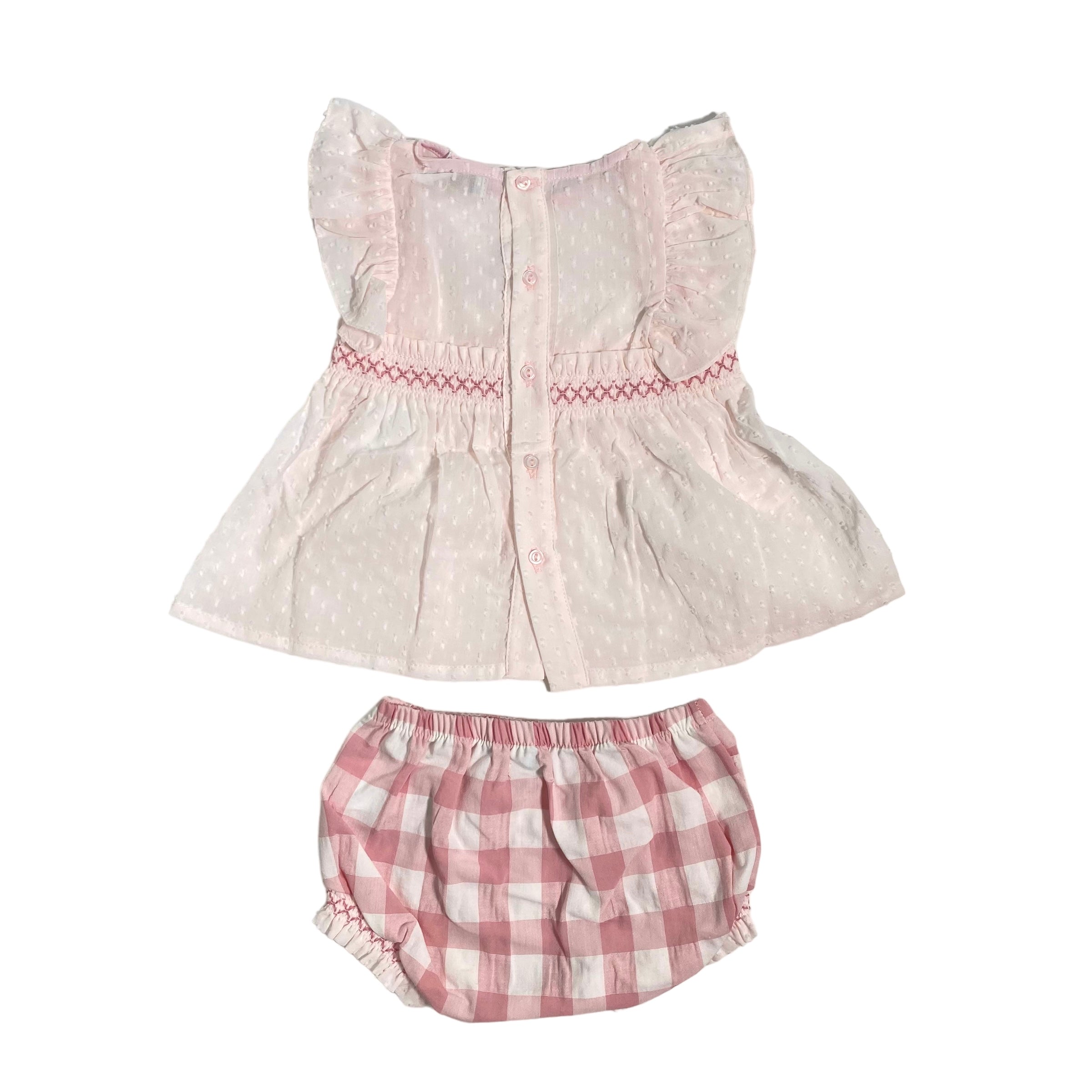 Baumwoll-Outfit bestehend aus rosa karierten Culottes mit Schleife und Plumetis-Baumwollhemd.