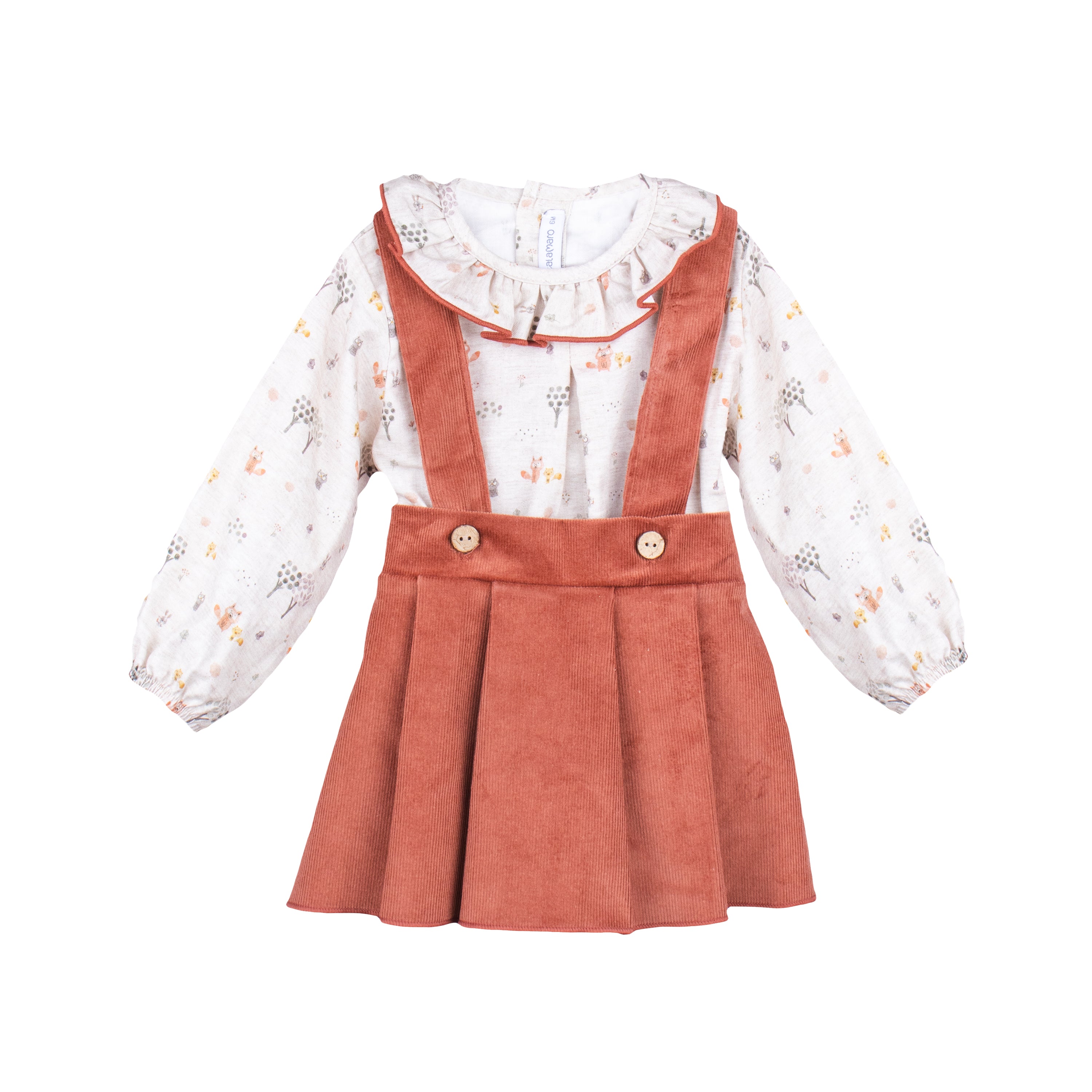 Questo completo elegante per bambina è perfetto per un look alla moda. La gonna in velluto millerighe con bretelle si abbina perfettamente alla camicia col colletto rouche a fantasia floreale. Con il nostro completo, la tua bambina sarà sempre alla moda!